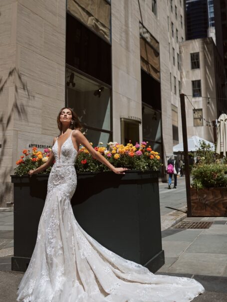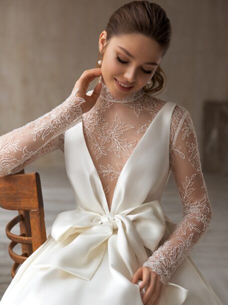 Our designs feature delicate and airy fabrics, like exquisite lace, flowy tulle, or luxurious Mikado silk, that complement your personality. Whether you’re a glam queen, a fashionista, a minimalist, or a romantic at heart – choose the plus-size wedding dress that reflects your unique taste. Stay true to who you are to look radiant during the ceremony.