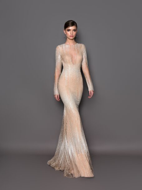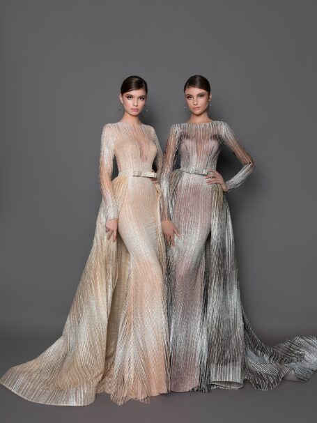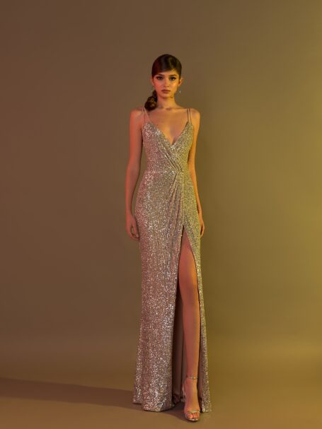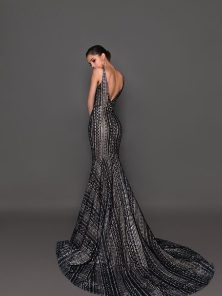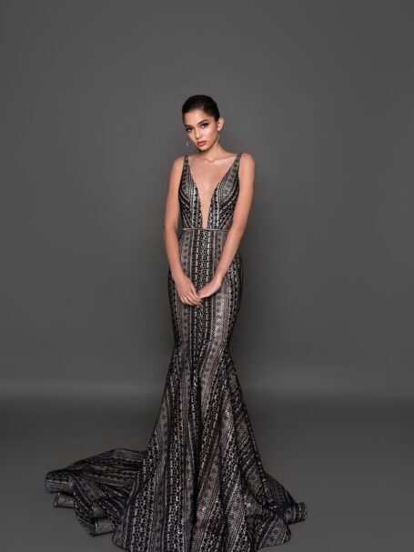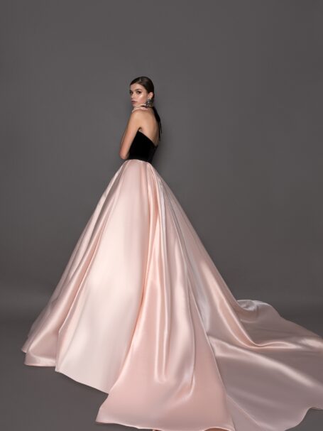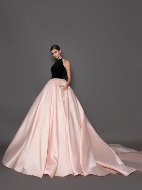 Glam VibesThe 19102 evening gown promises an evening of allure and admiration. Its rich mikado silk, sparkle, tulle and a-line silhouette make it a true masterpiece.