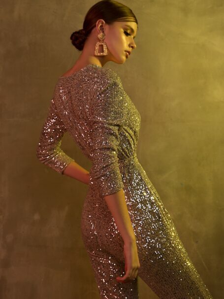 Glam VibesThe 19224 evening dress is where luxury meets style. Crafted in sparkle, its sheath silhouette ensures you’re the cynosure of all eyes.