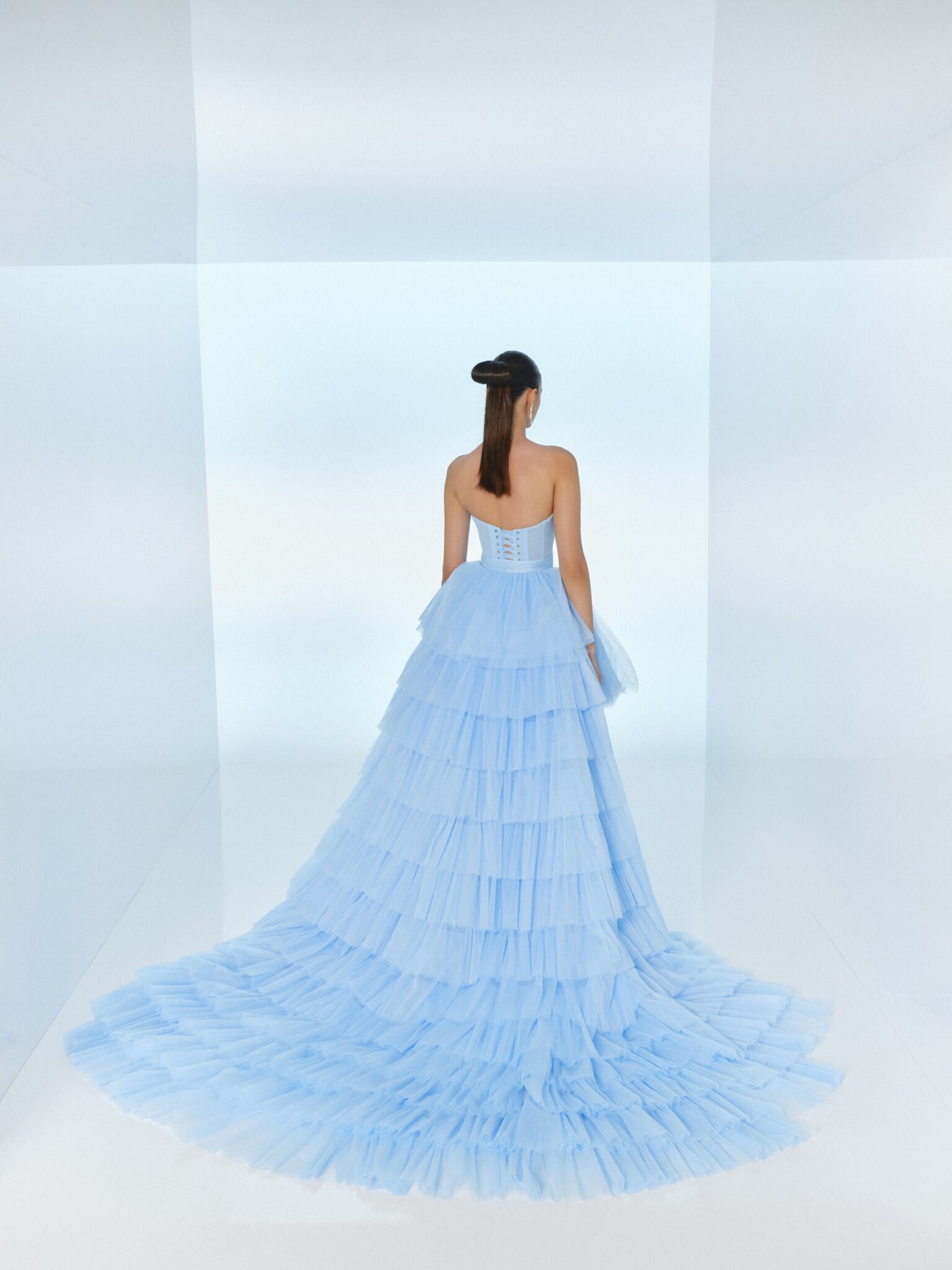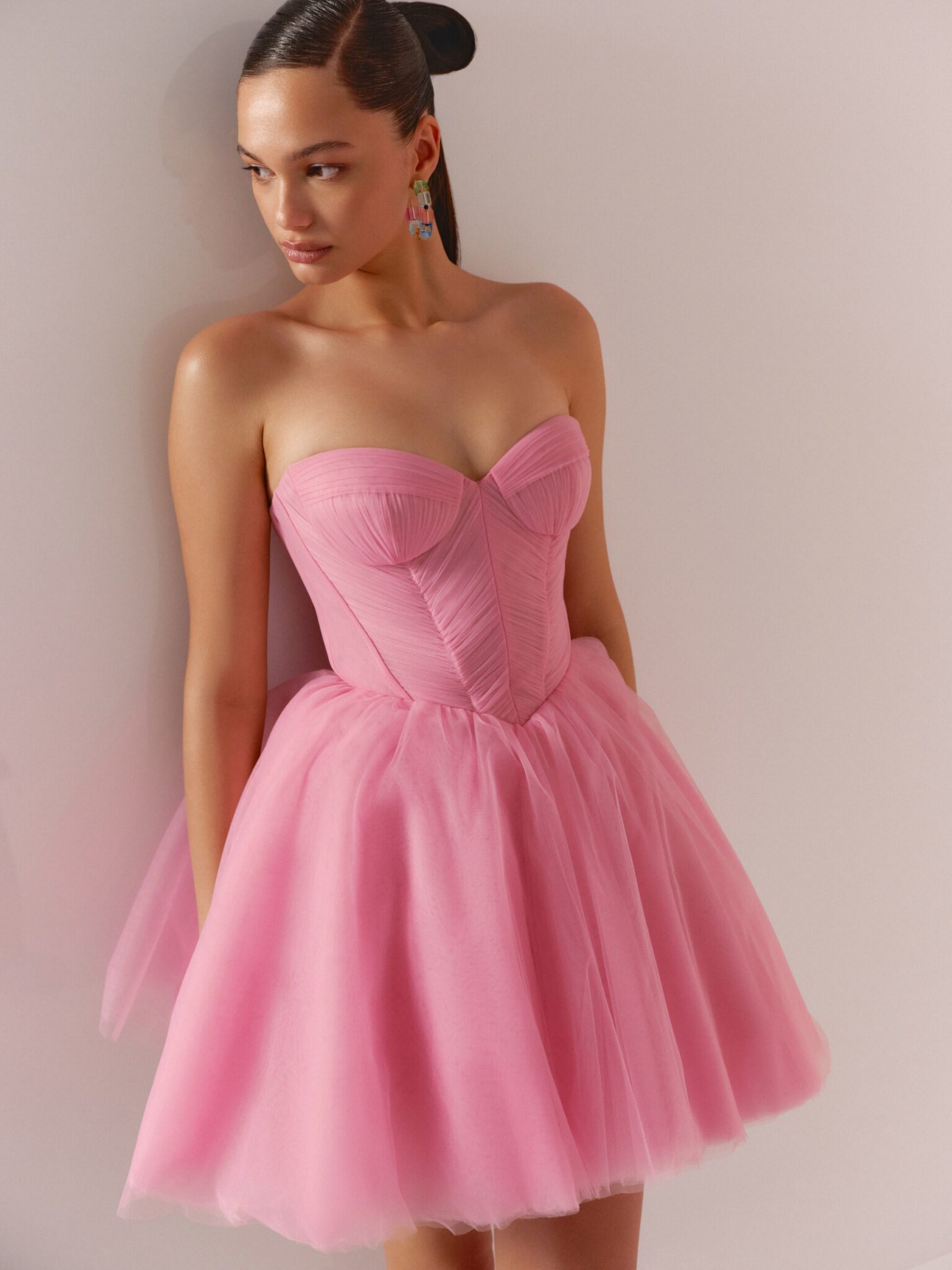 BridesmaidsMake a grand entrance in this short dress in pink, blue, cappuccino, lavender, black, yellow and green color options. The sweetheart neckline is both flattering and chic, and the tulle fabric drapes beautifully. The lace-up corset and the long detachable train with ruffles bring a touch of glamour, making it perfect for either a party or a wedding.