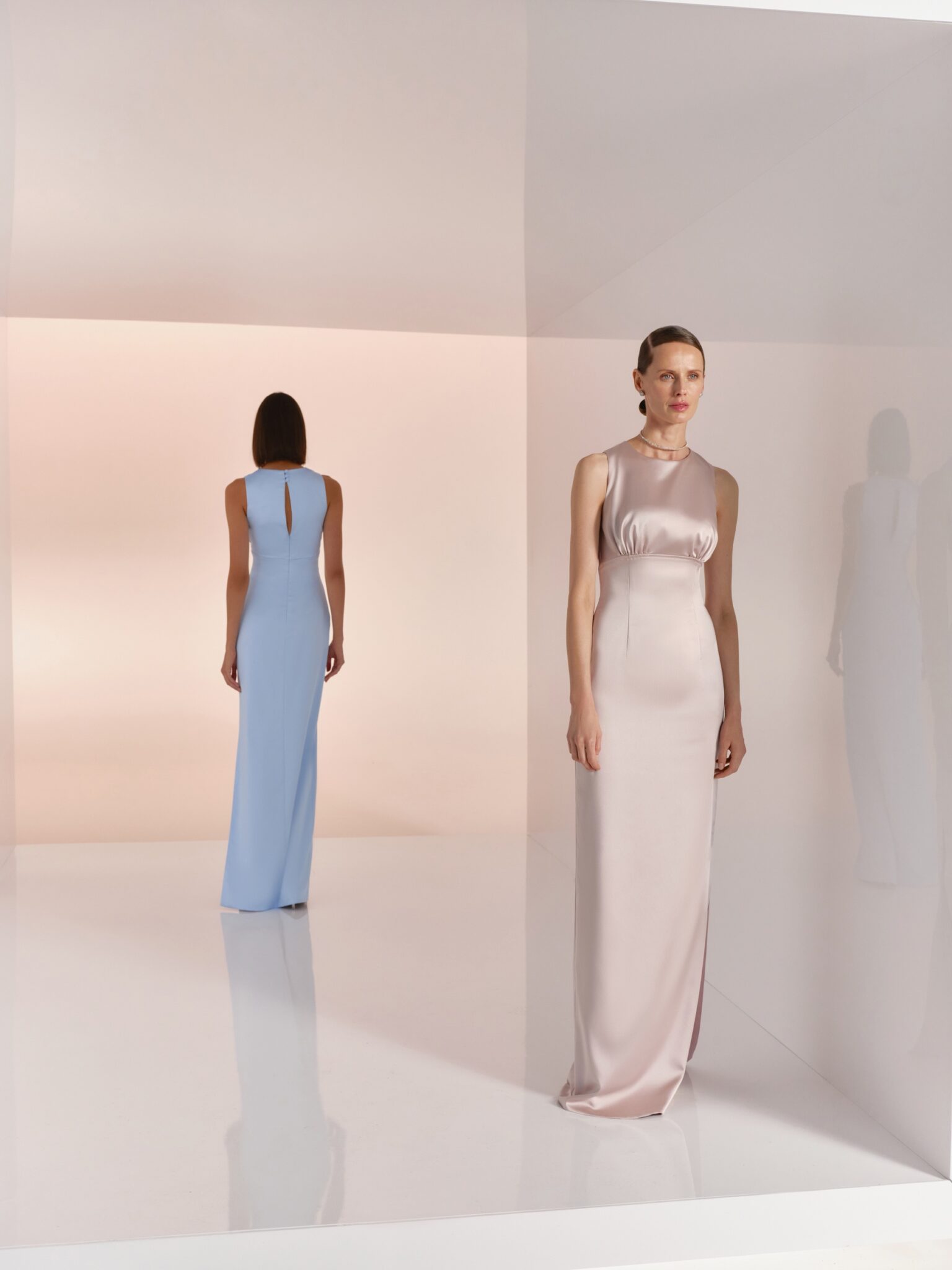 BridesmaidsCapture hearts in this sheath gown, with a charming round neck that exudes elegance. The silk fabric in blush, lavender, fuchsia, red, navy, blue, green, cappuccino and black color options is a dream to wear. It’s perfect for an evening dress or a bridesmaid gown.