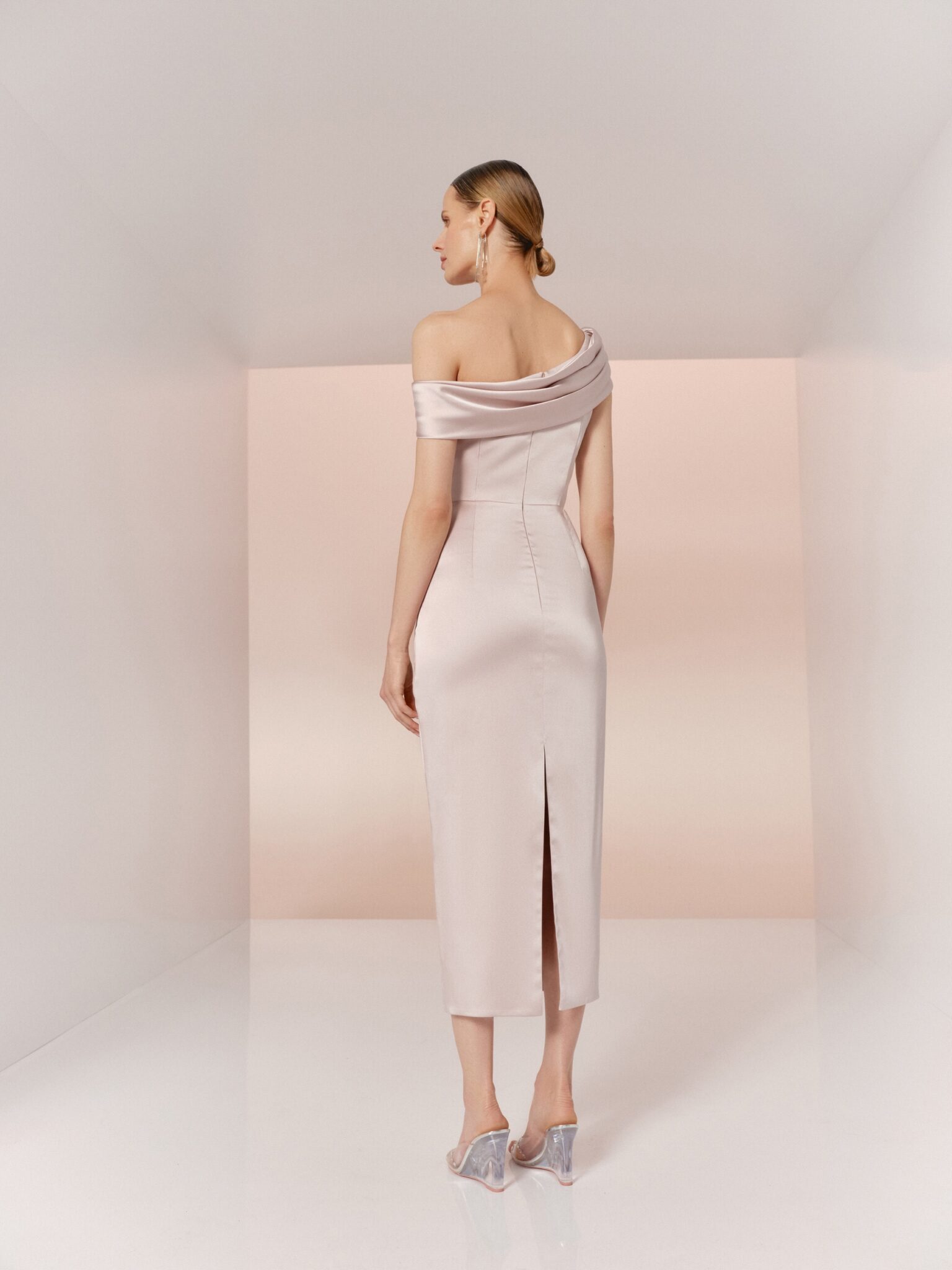 BridesmaidsCapture hearts and turn heads in this fitted midi dress featuring alluring cappuccino, fuchsia, black, red, blush, gold, navy tones. The flattering one-shoulder neckline highlights your femininity, and the silk fabric drapes gracefully. Intricate detachable asymmetrical cape embellishments add a touch of elegance. Choose this dress for an enchanting evening or as a wedding guest attire.