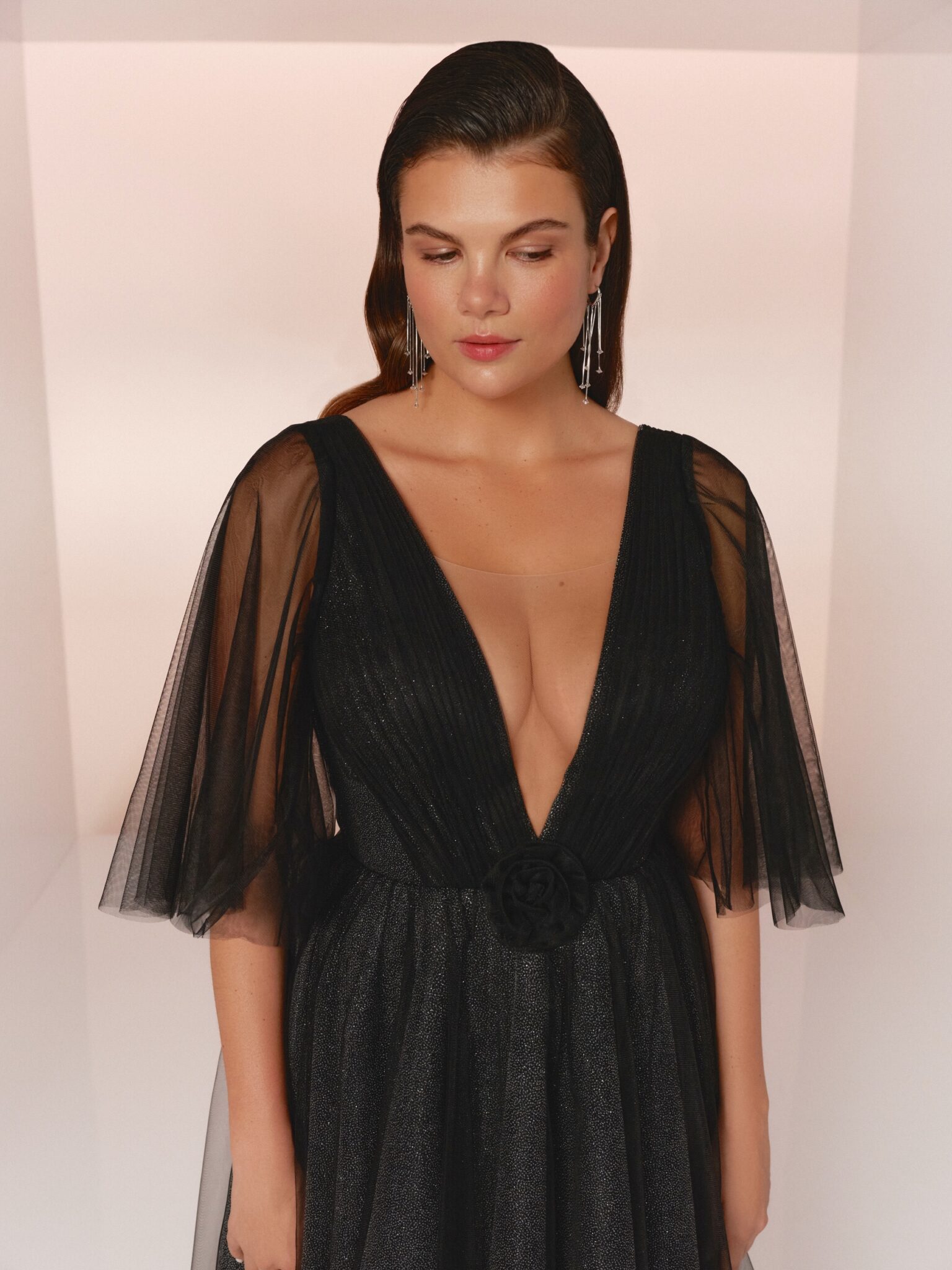 BridesmaidsBe the center of attention in this fabulous A-line dress, available in blush, black, red colors. The elegant V-neck exudes timeless beauty, and the tulle with sparkle fabric offers comfort throughout the night. Intriguing thansparent sleeves accents make this dress the perfect choice for a memorable evening or as a wedding guest attire.