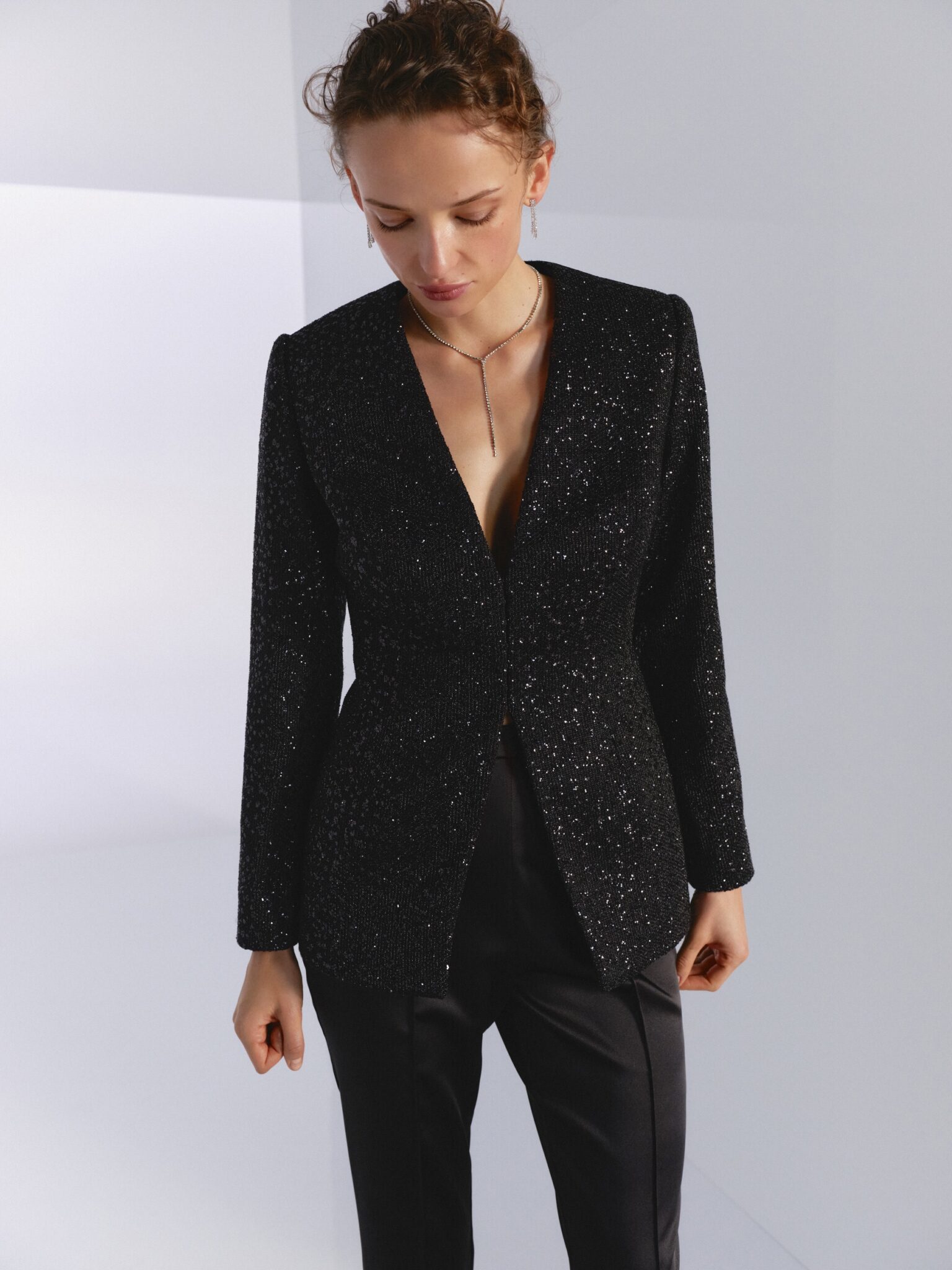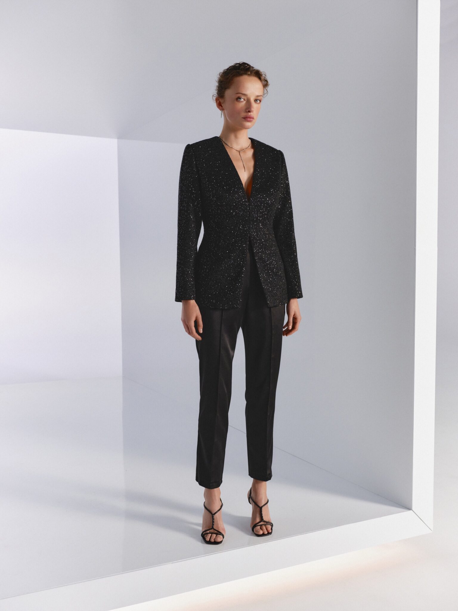 BridesmaidsThis stylish suit, composed of a fitted jacket crafted from solid glitter mesh and straight silk pants, exudes sophistication with its V-neckline and comes in versatile and chic colors like silver and black. Elevate your ensemble with this suit that seamlessly blends glamour and modern elegance.