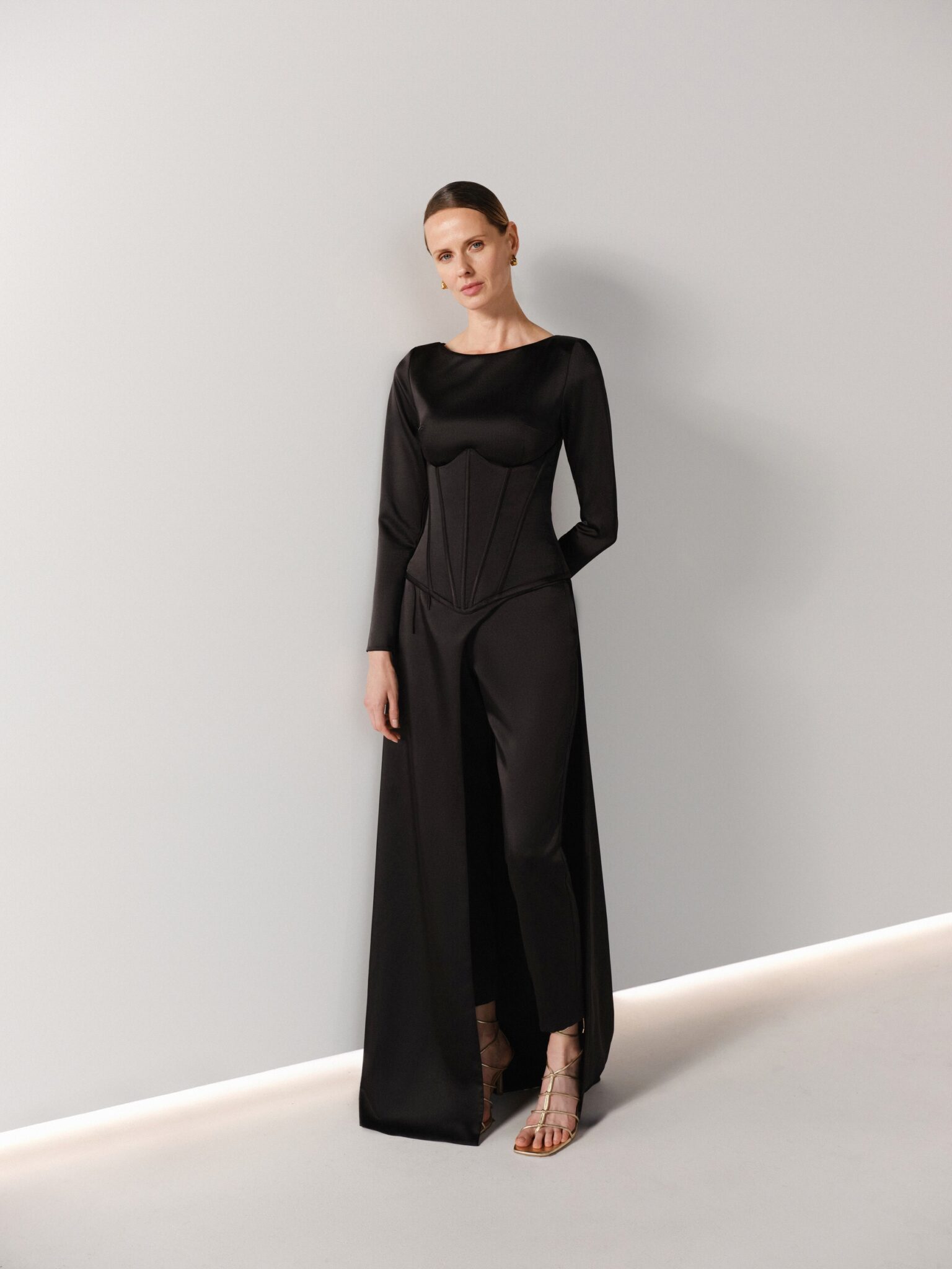 BridesmaidsThis suit ensemble seamlessly blends sophistication and style, boasting a lace-up corset atop a dress with a graceful boat neckline, paired with slim straight pants—all crafted from luxurious silk fabric. Choose between the classic and timeless navy or black options for a chic and refined look suitable for any occasion.