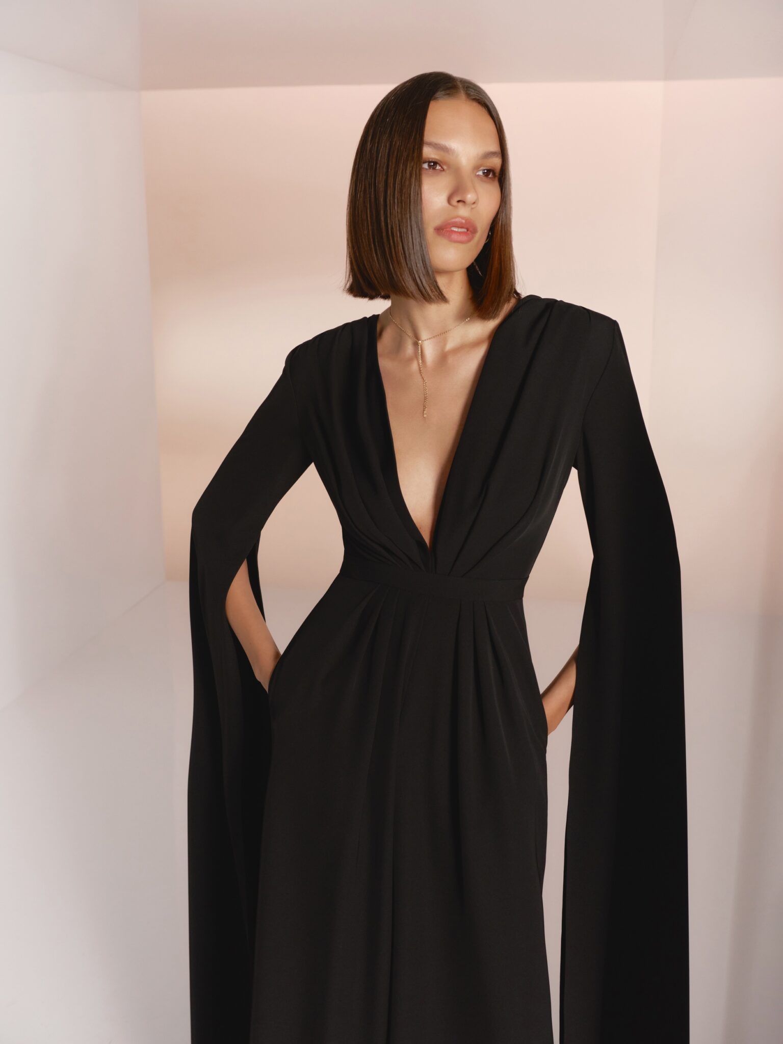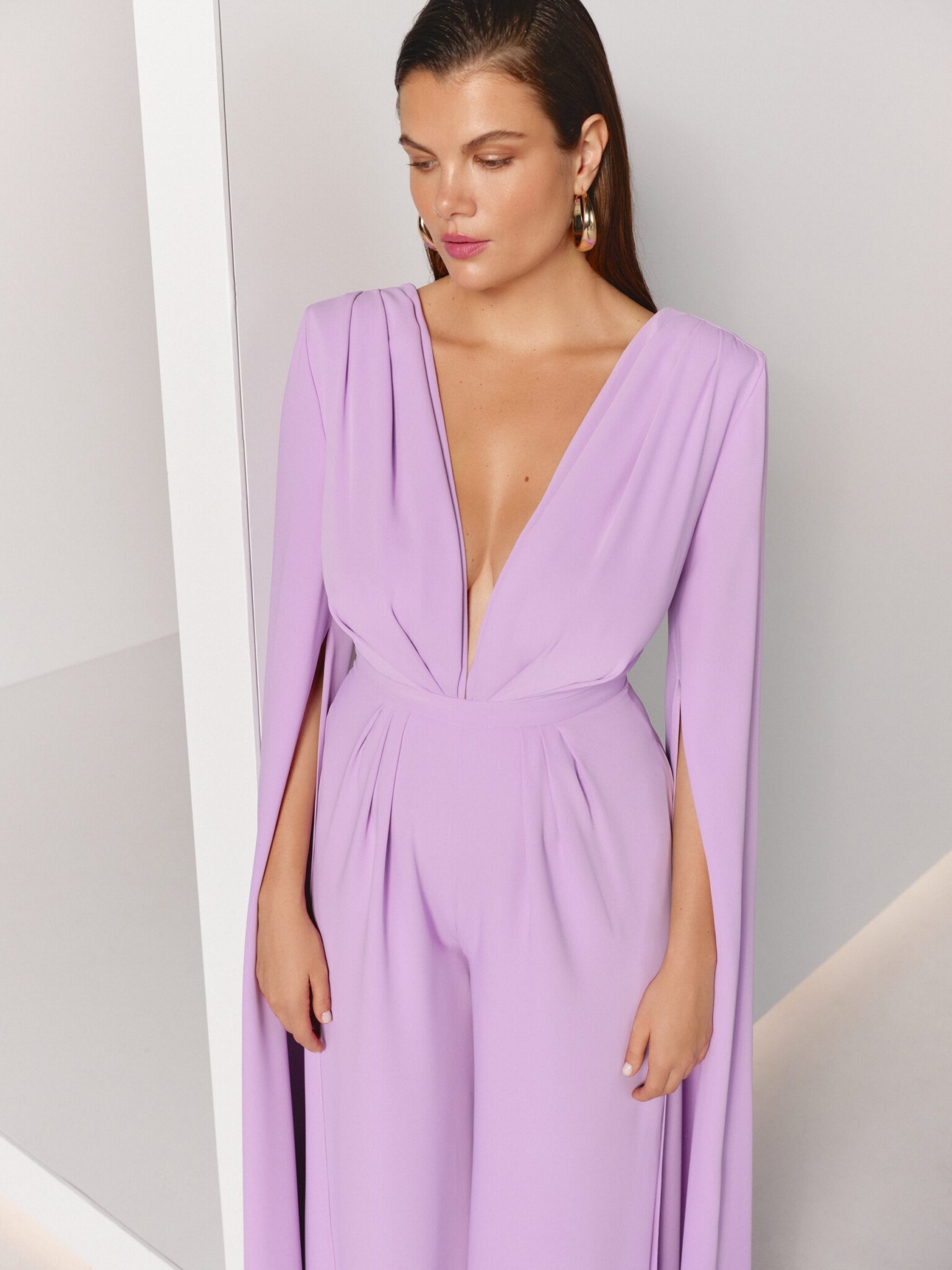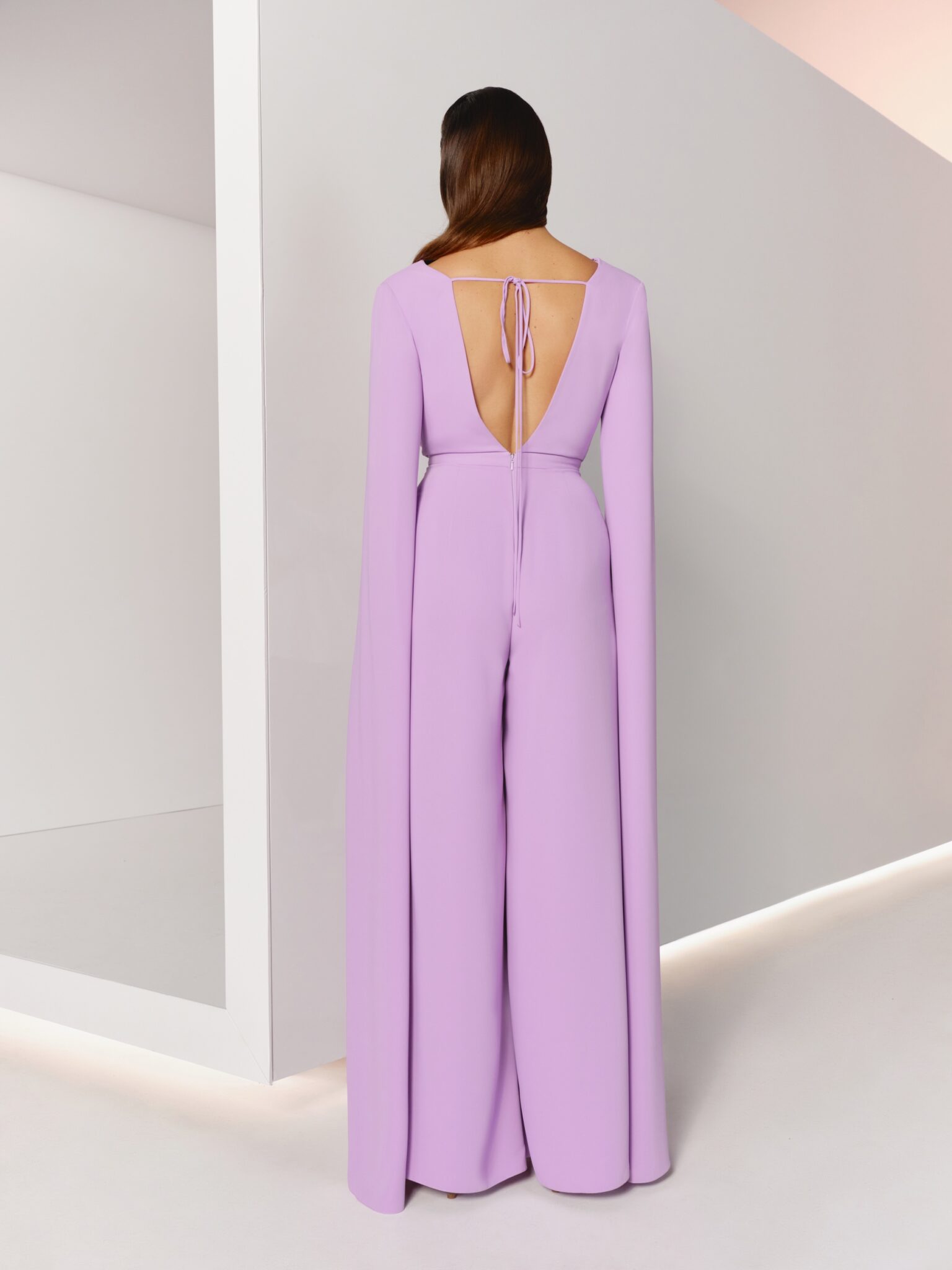 BridesmaidsMake a bold entrance in this backless jumpsuit featuring palazzo pants, meticulously crafted from luxurious suit fabric, showcasing a flattering V-neckline and floor-length fit-and-flare sleeves. Choose from a vibrant array of colors including lavender, pink, light blue, yellow, orange, purple wine, navy, red, and black, to express your individual style with flair. It is a perfect choice for any special occasion, be it an evening event or a wedding guest look.