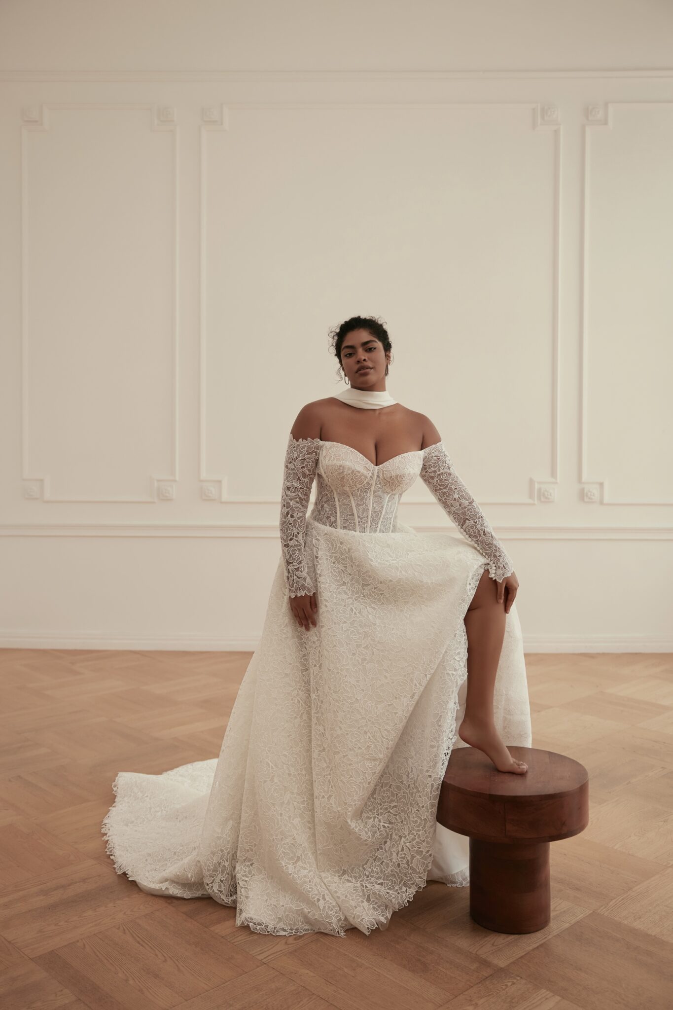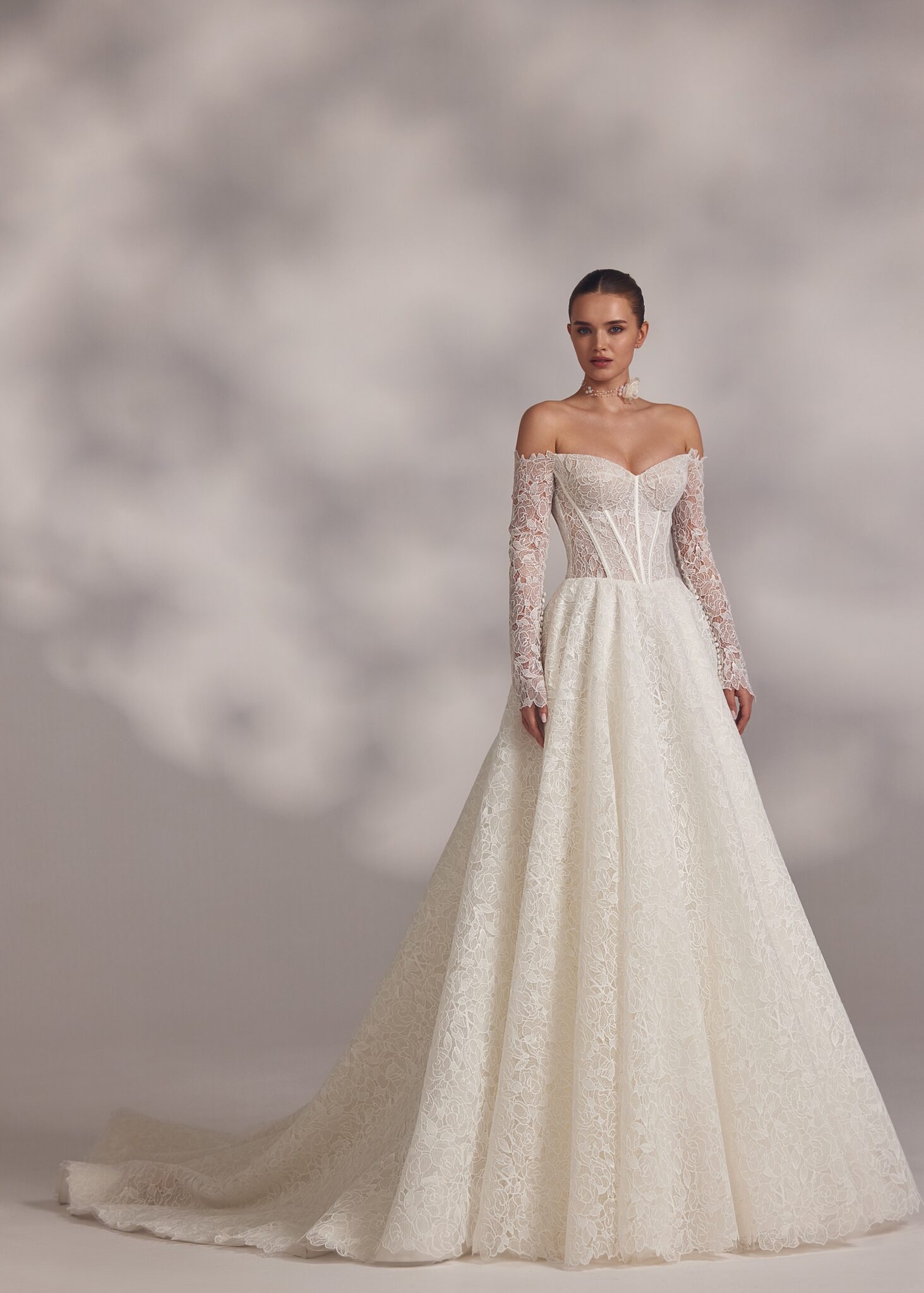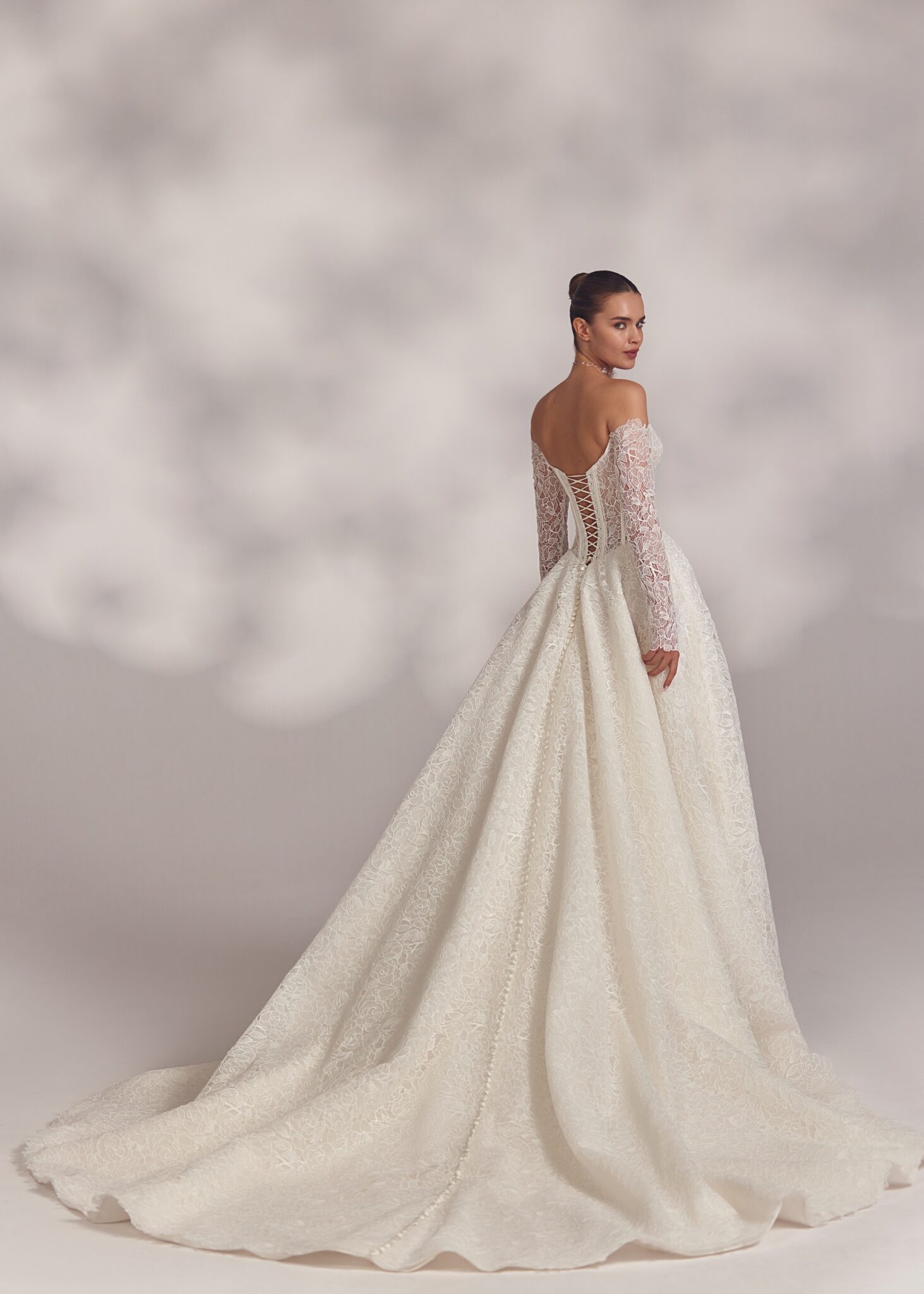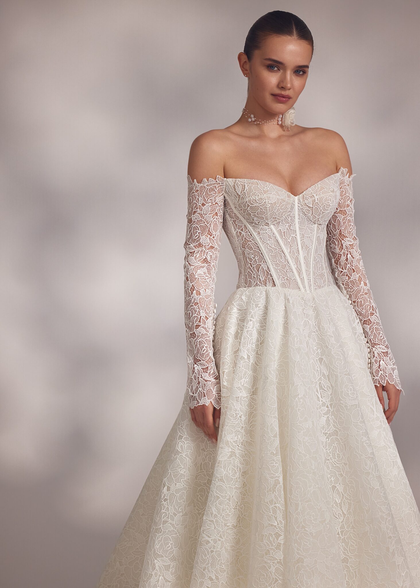 Less is More IVAbril – guipure lace-up detailed corset base dress with smooth heart-shaped neckline and cold-shoulder long sleeves made of guipure.