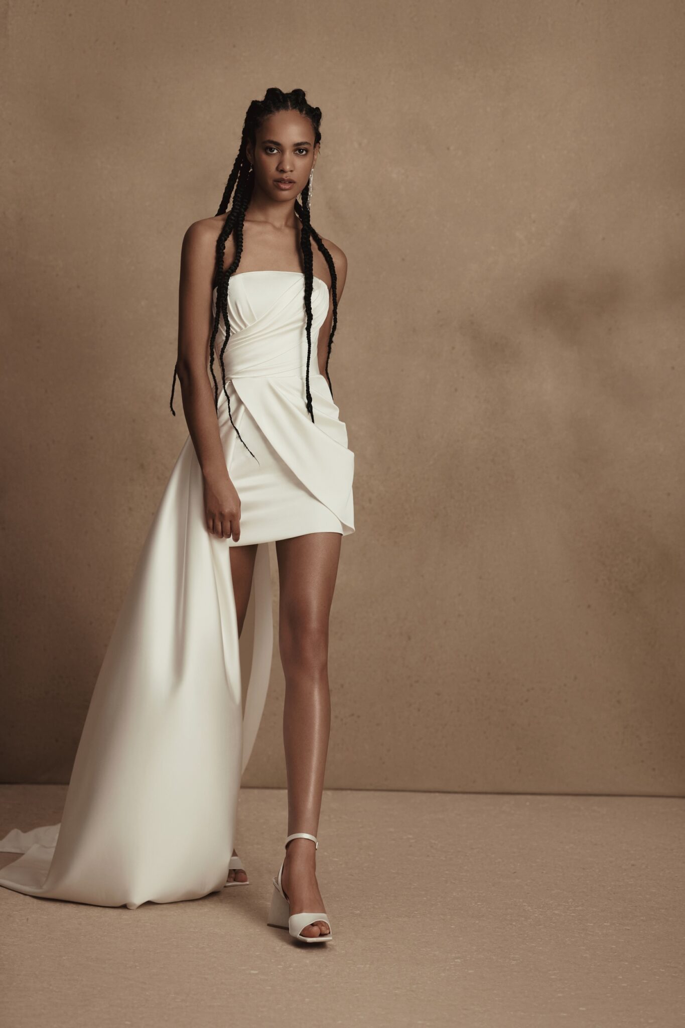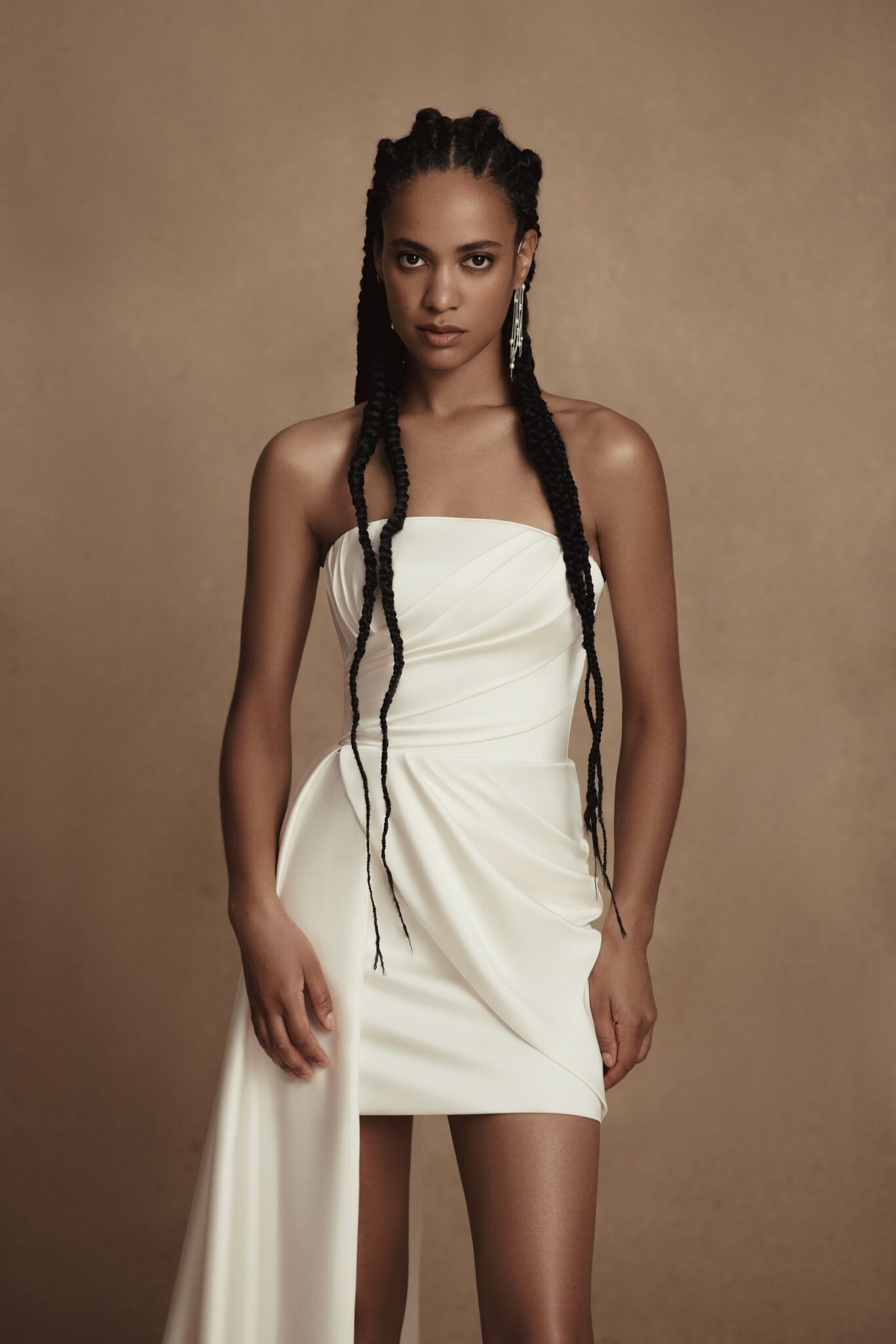 PersonalityAida – elegant fitted mini dress with detachable train. The dress is made of glossy satin, the top of the corset and the skirt are decorated with drapping.