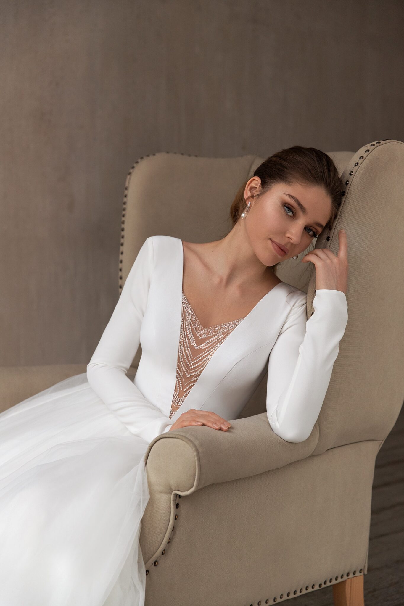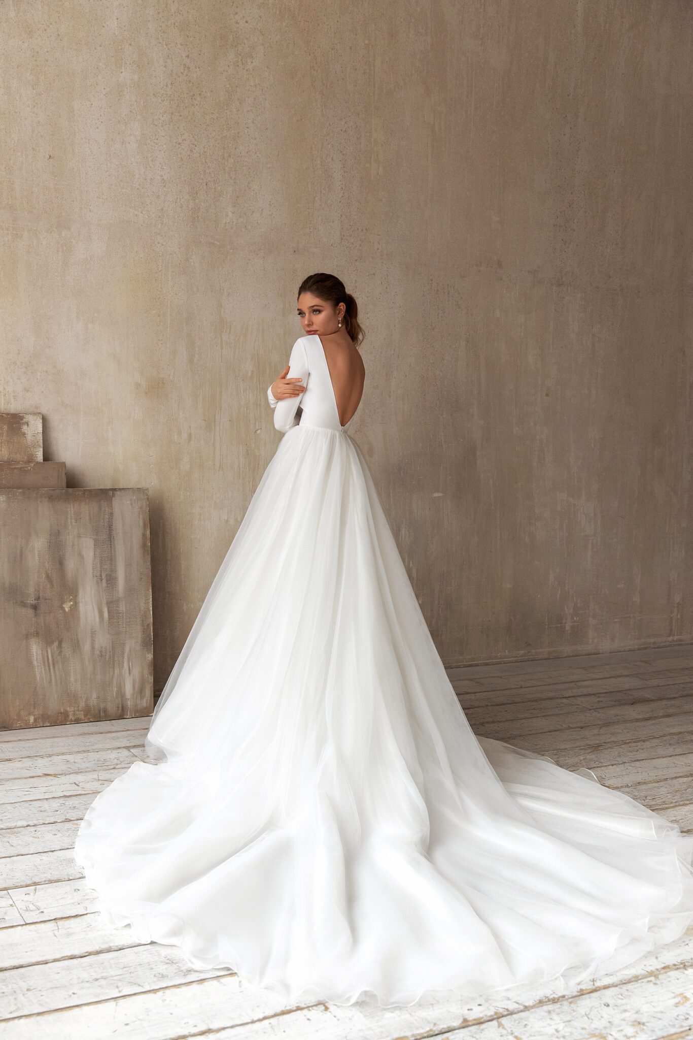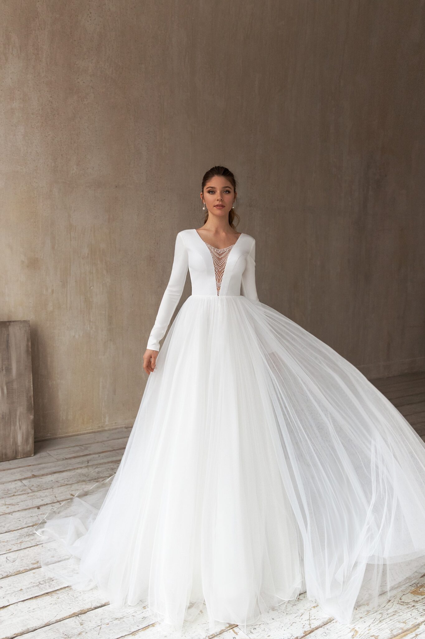 Less is more 2021Tender A-line wedding dress with a magnificent train and long sleeves. An upper part of a dress is made of crepe-satin. Splendor skirt is made of many layers of veiling. A Deep V-shaped neckline accentuates the tender bride’s back. A low neck is decorated with embroidery of beads and crystals.