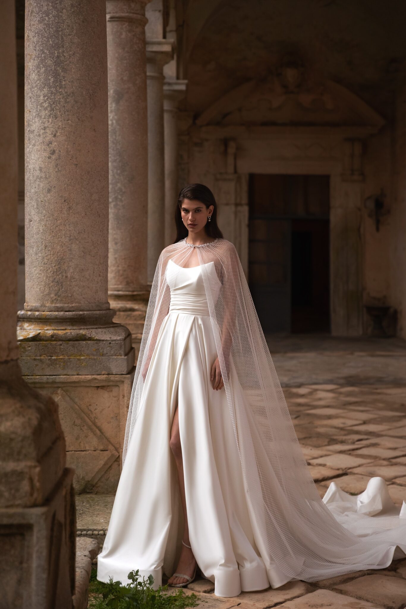 Made 4 LoveAlluring and romantic this satin A-line wedding dress features a pointed strapless draped corset with exposed boning and voluminous box pleated skirt with a thigh-high slit. Paired with a matching semi-transparent Tulle cape with polka-dot pattern the dress looks even more fragile.