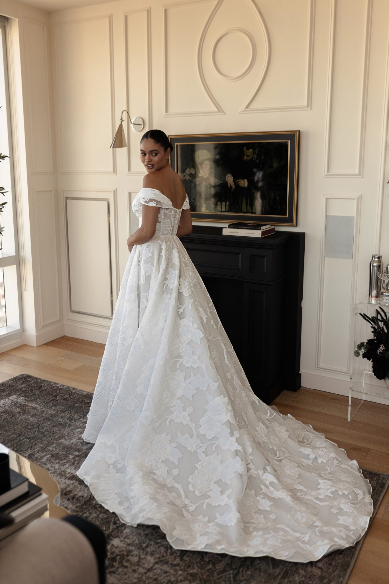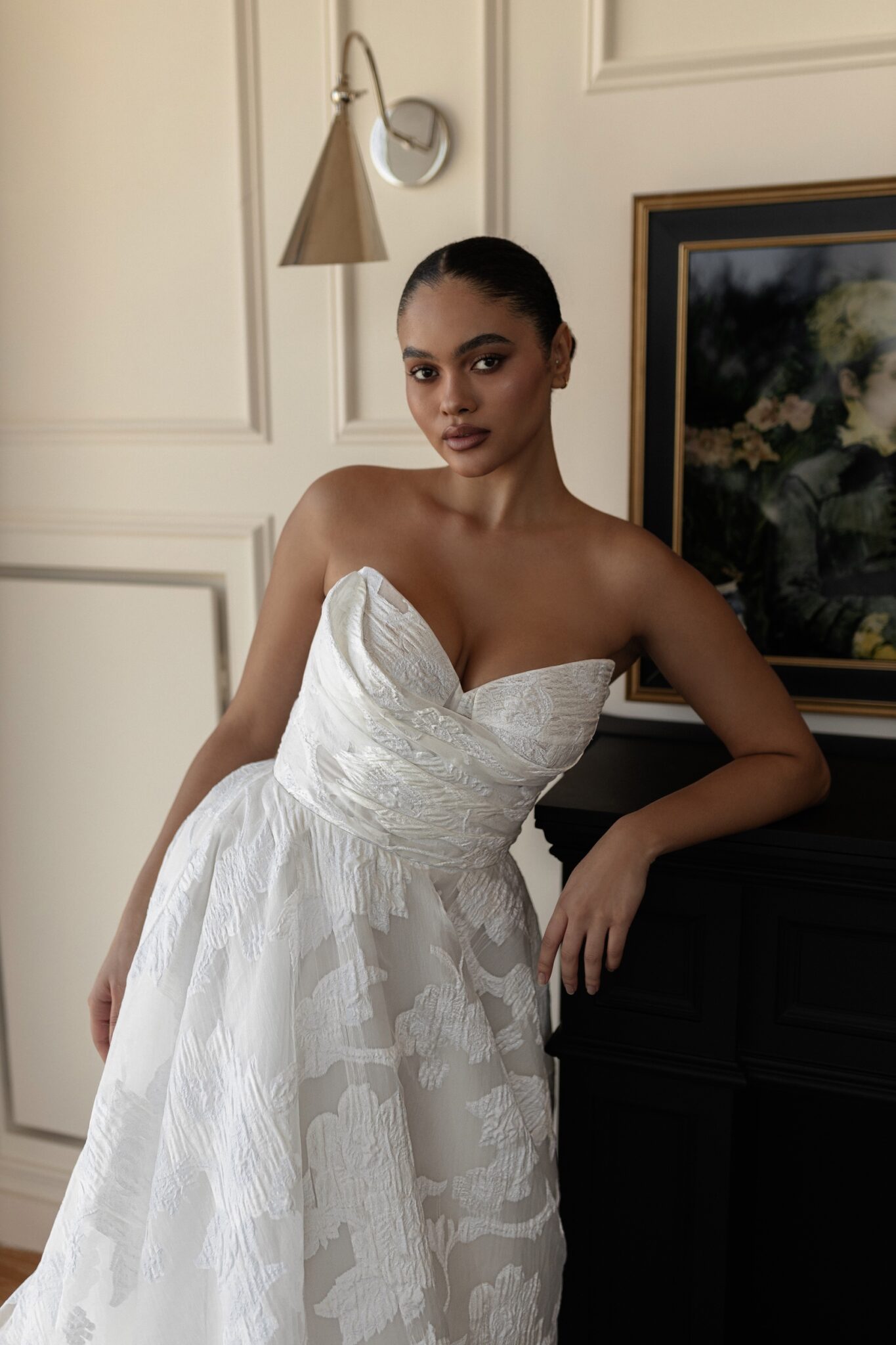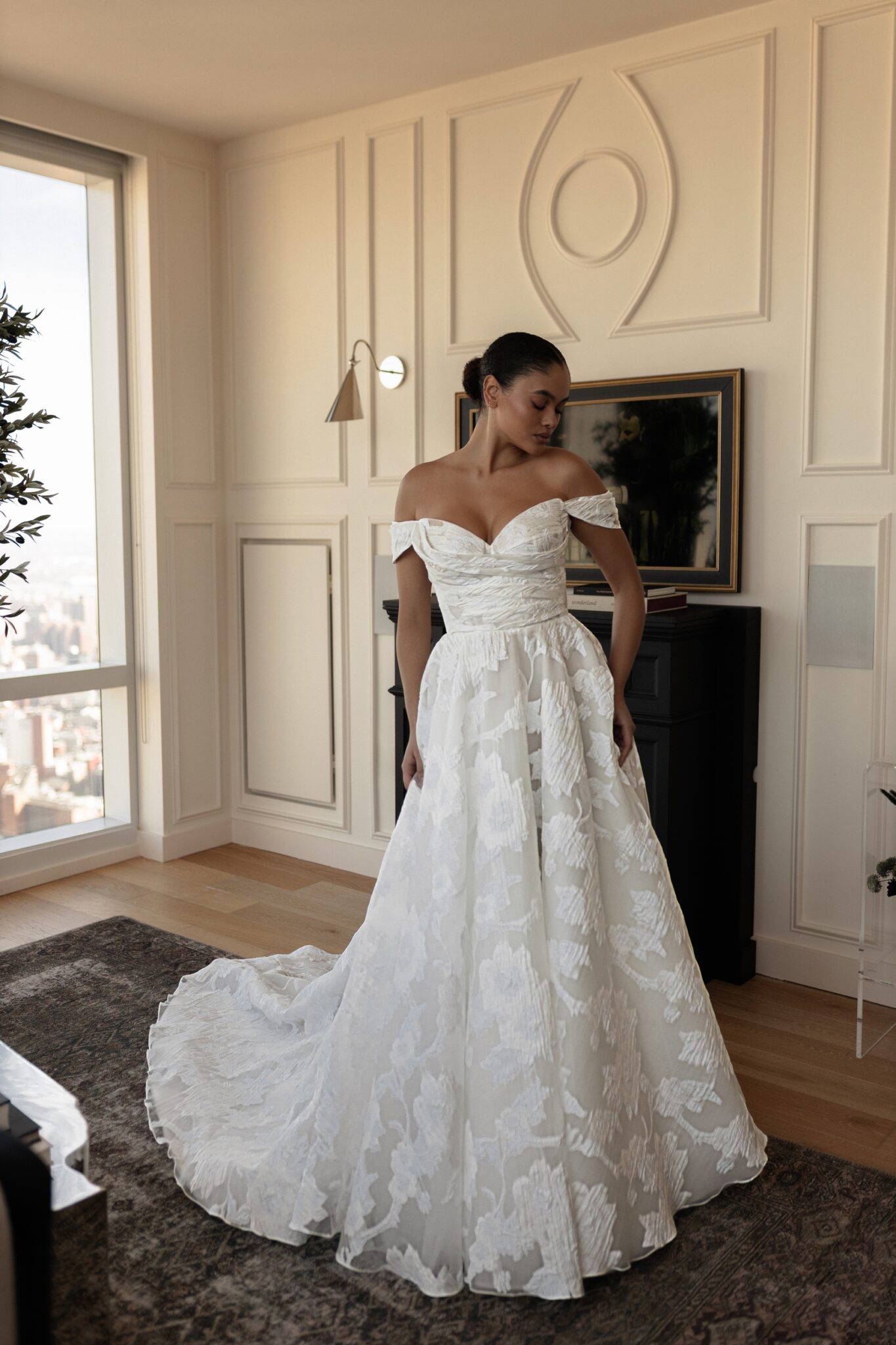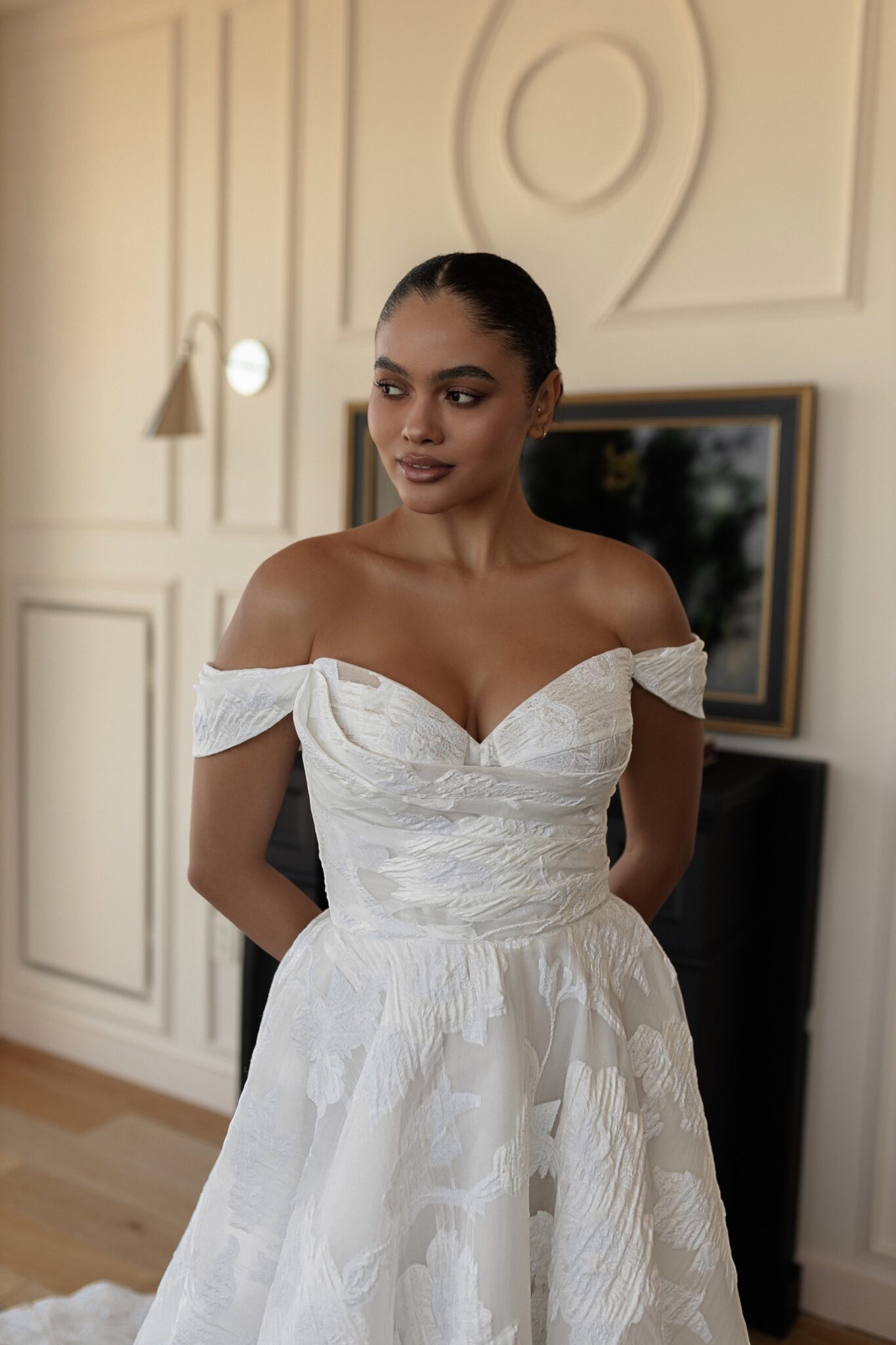Urban Elegance, Sample Sale‘Amma’ is created with a unique textured brocade fabric. This design allows the dress to showcase its minimal and classic feel, while still adding interest in the dresses construction and fabric choice. The bodice features minimal pleating detail and a detachable off shoulder strap, allowing the gown to transition from the ceremony to a strapless reception look. The skirt is a flat a-line with no pleating, allowing the fabric to be the focal point. ‘Amma’ embodies modern day romance.
