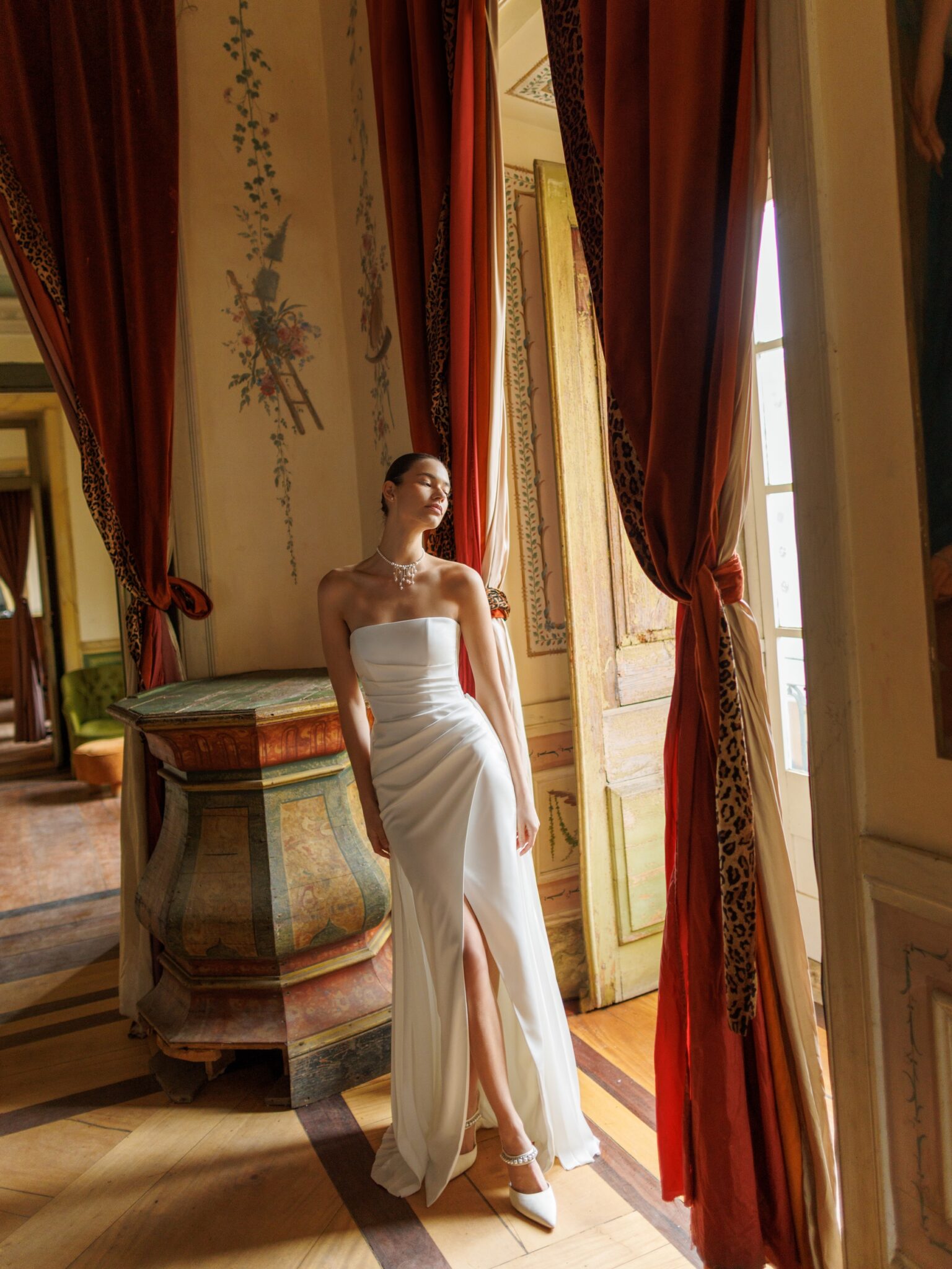 Crafted from satin, the dress features a bold thigh-high slit and a sculpted draped corset that zips up the back, creating a statuesque, form-fitting shape.
