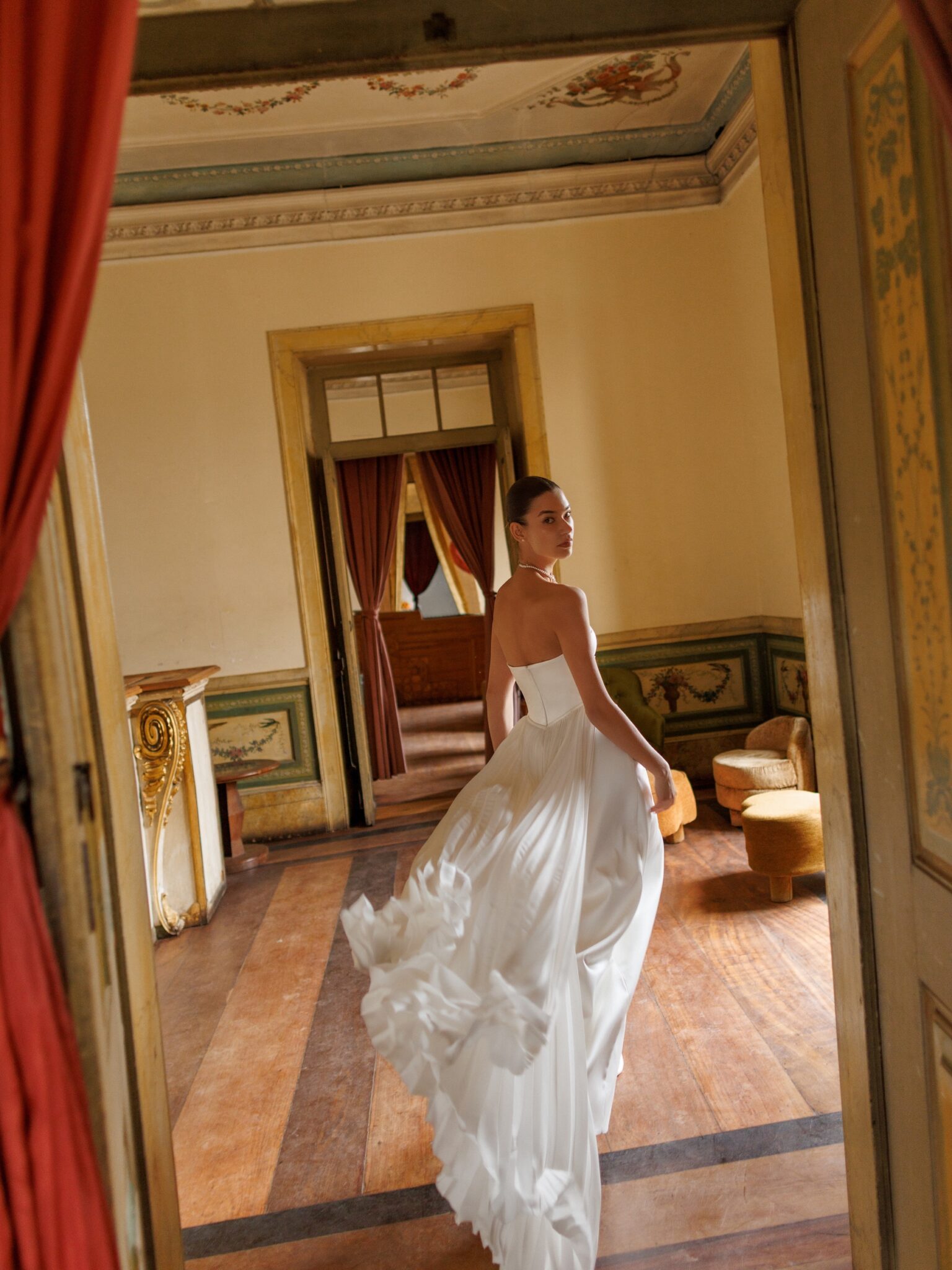 The standout element is its original detachable train, made from pleated fabric that adds light movement and a touch of whimsy to the overall look.