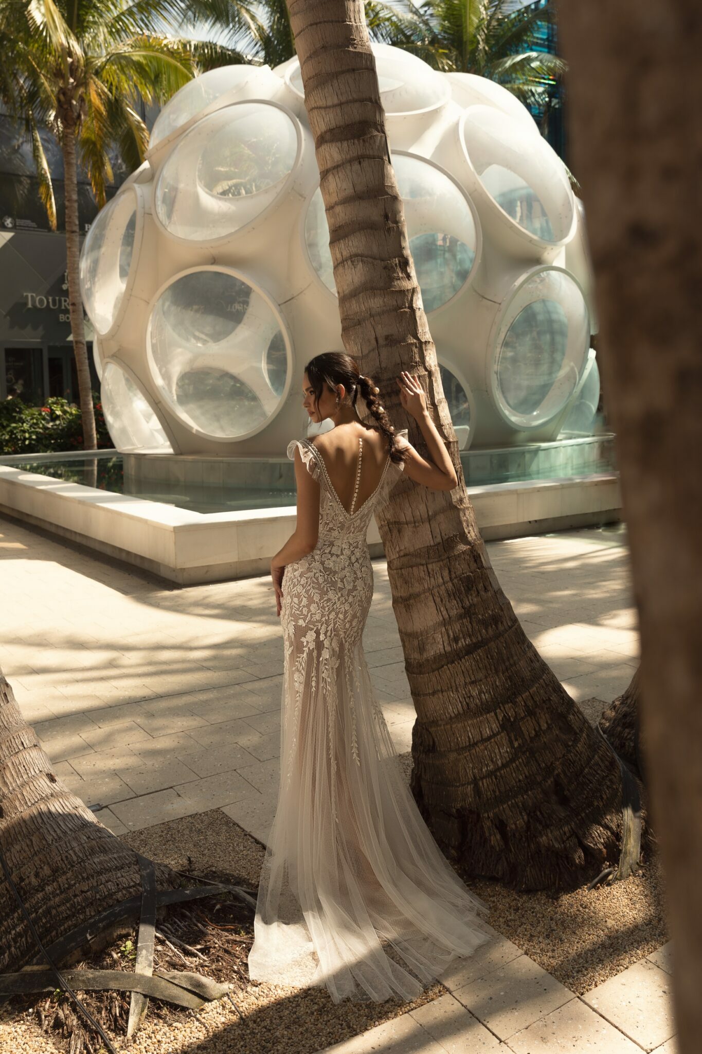 MiamiTender Ariel wedding gown is made of exquisite fabric with small dots. The dress is embellished with a V-shaped neckline and lowered shoulders. A large part of the dress is decorated with lace flowers. A bodice is embellished with cap sleeves that are made of veiling. The back of the dress has a fabulous neckline that is made of transparent fabric and beautified with a row of white Buttons. There is a small train made of veiling.