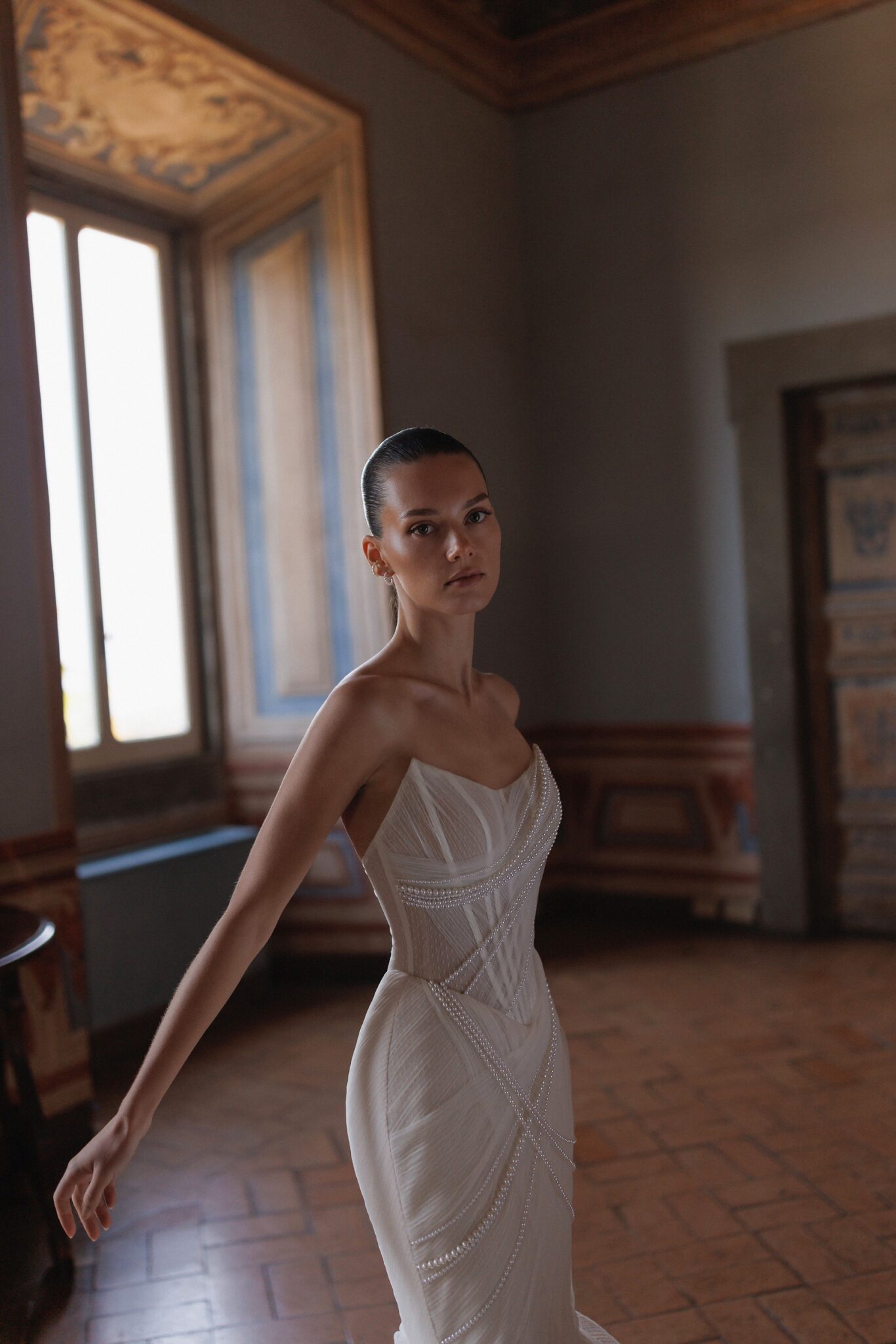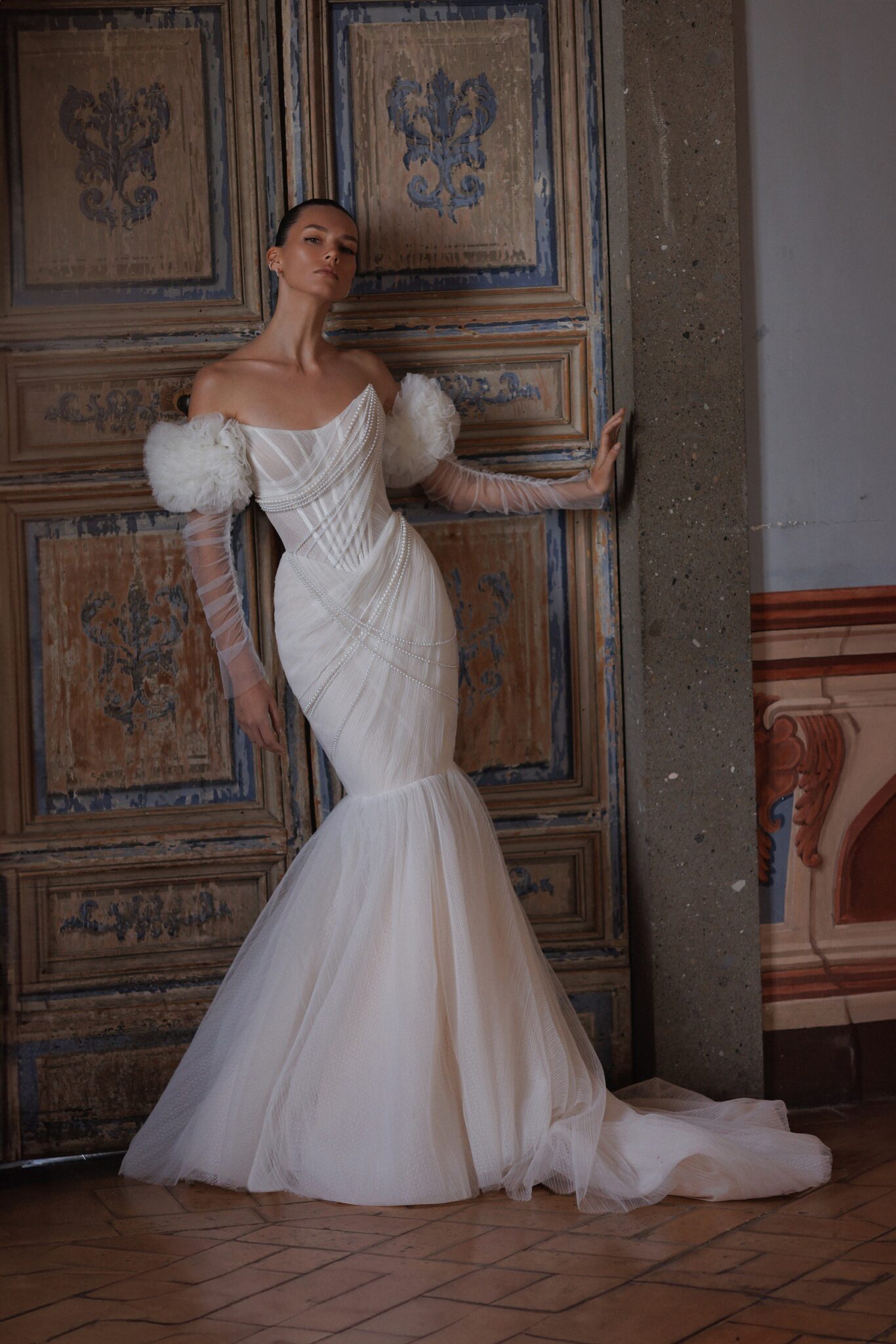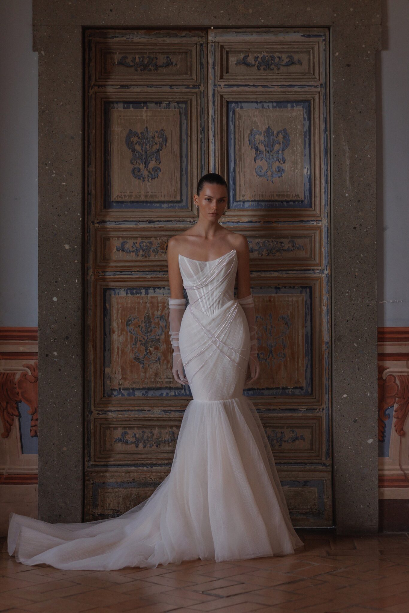 L'UnicoLightness and depth poetry: layered silk wrap detailed corset with slightly rounded neckline and an overlay of pearl strings intertwined in the upper part of the dress. Complemented with transparent long gloves, optionally ruched.