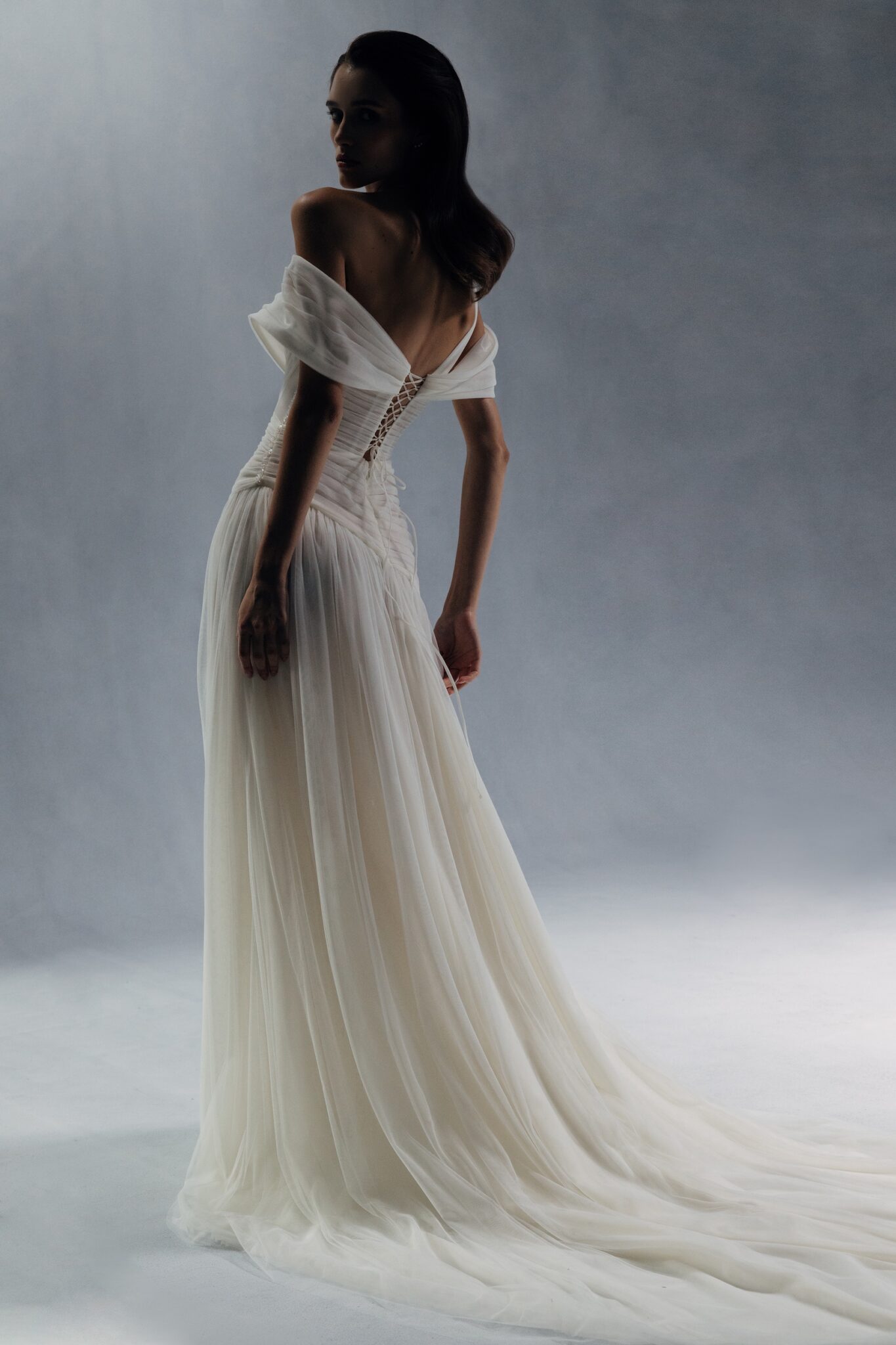Special EditionA lightweight and refined dress with a cold-shoulder neckline and an asymmetric tulle strap on one side. The structured corset bodice flows into a diagonally draped skirt that descends into an airy, slit hem.