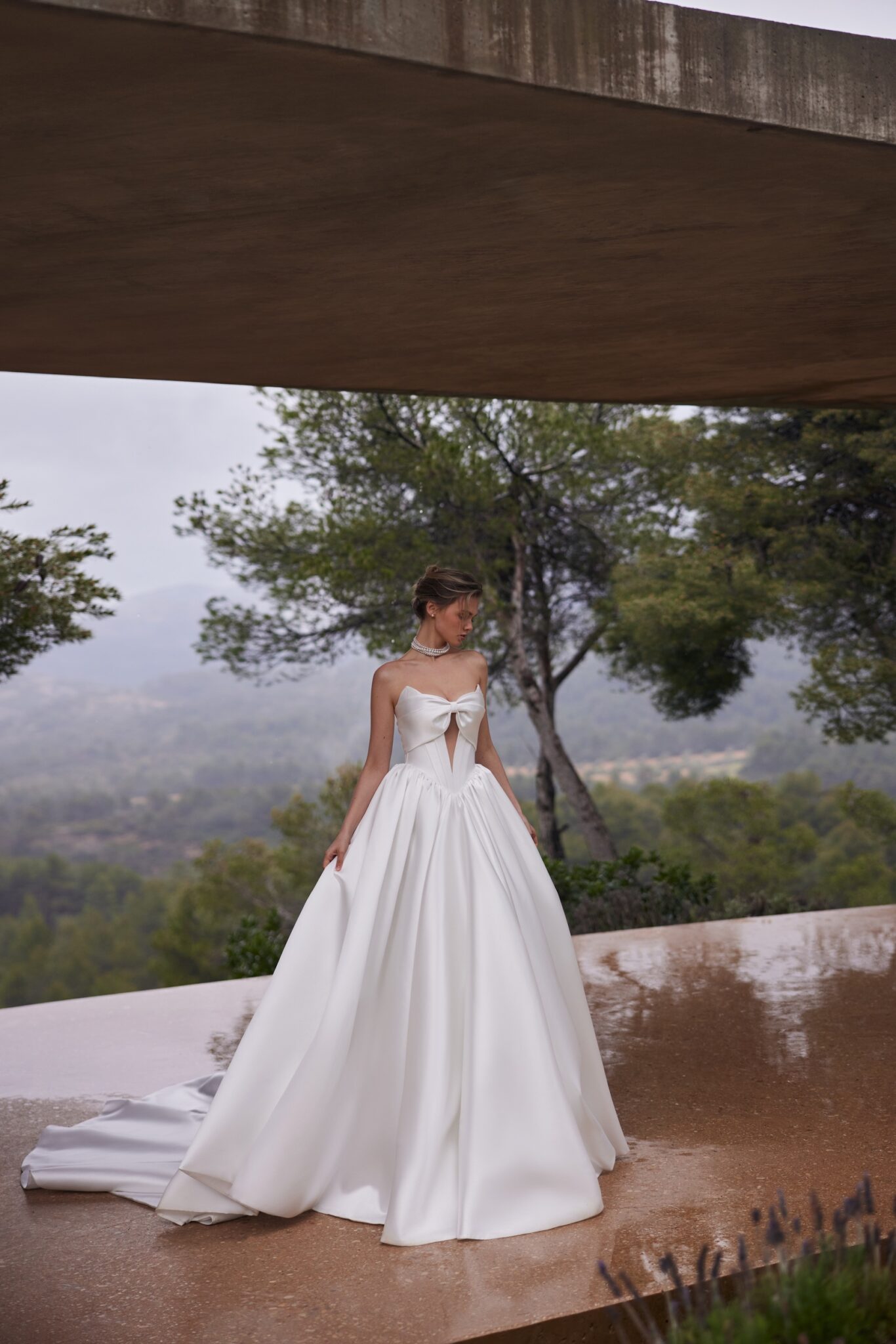 Additionally, the structured Mikado fabric ensures a flawless silhouette, while the minimalistic yet stylish design makes it perfect for both classic and modern brides. The bow detail enhances the romantic charm, making the dress a timeless choice for a wedding look.