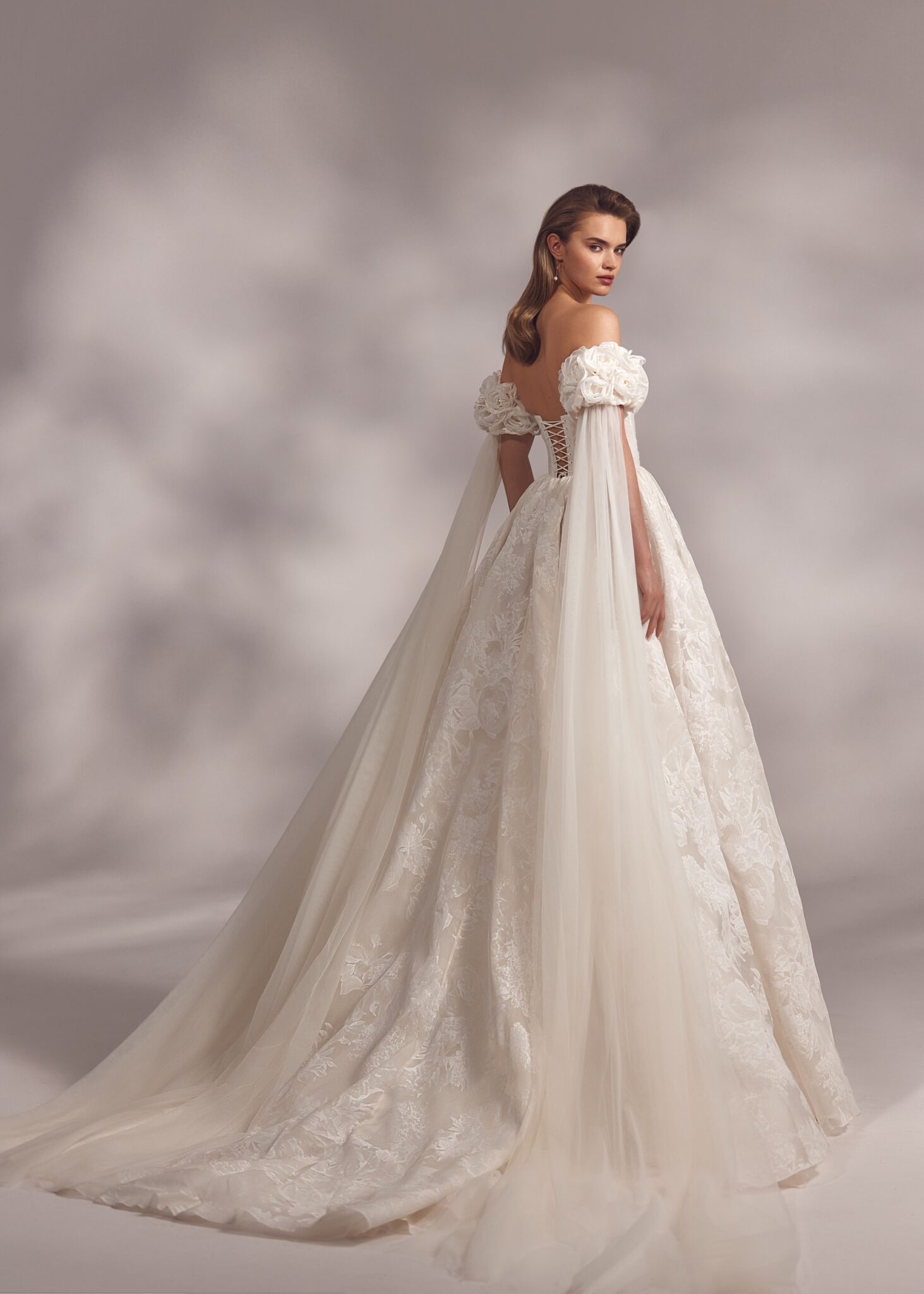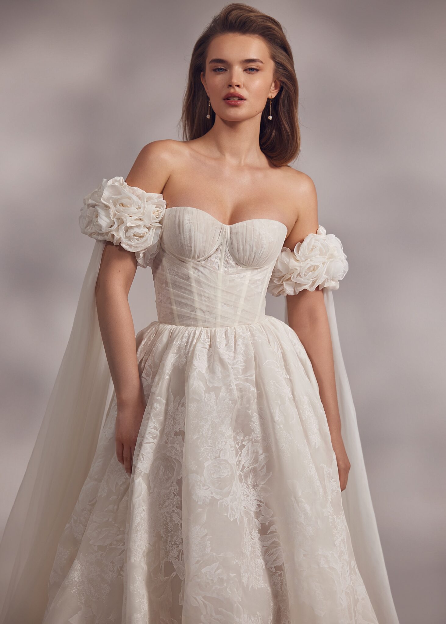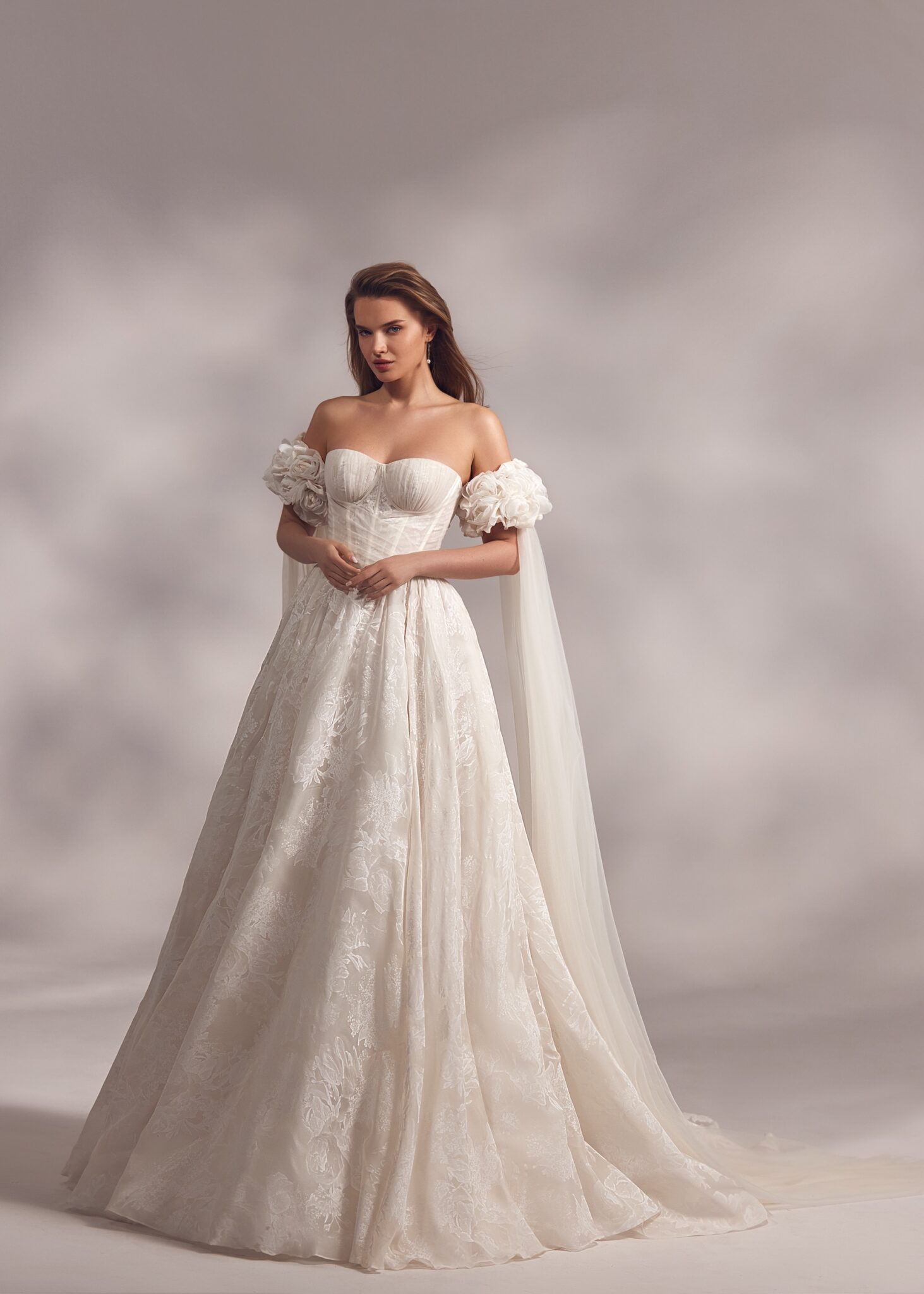 Less is More IVBavaria – corset based detailed corset gown with firm cups covered with a translucent mesh layer adding lightness and elegance. The skirt is also layered and featured floral embroideries all over the length. Bavaria is complemented by detachable floral trailed sleeves.