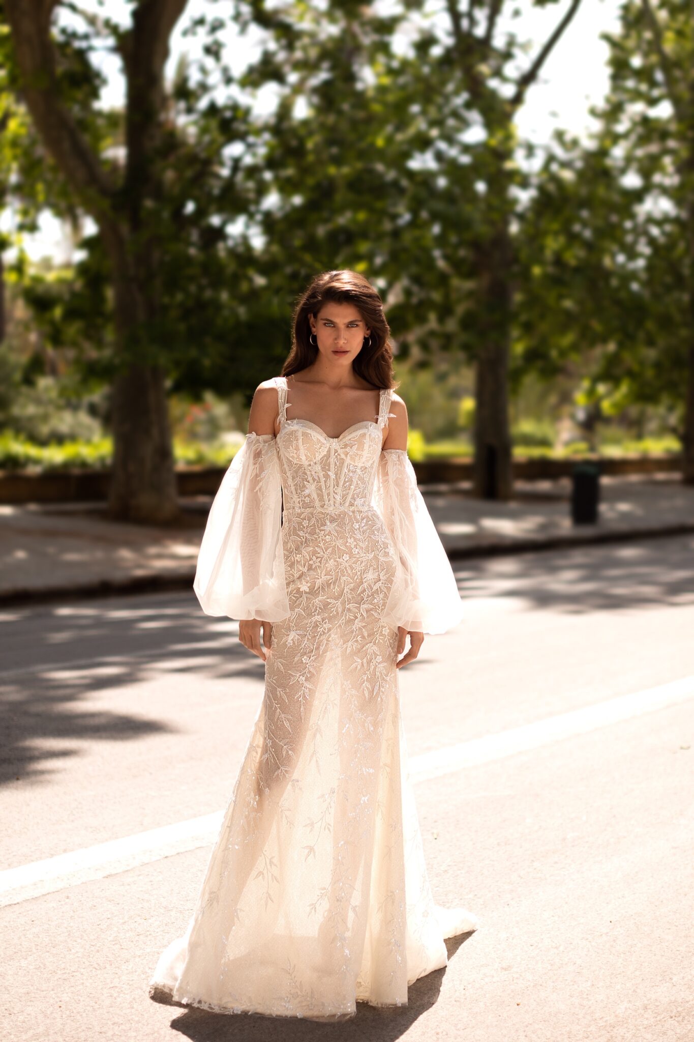 Made 4 LoveBellamy is a sparkling wedding dress with fantastic detachable Tulle baloon sleeves. The corset is decorated with a sweetheard neckline, classic cups and bones and scattered hand-embroidered floral appliques that also rest on the shoulder straps. The fitted sheath skirt of mermaid silhouette is made of shiny fabric with mini floral embroideries and delicate chapel train.
