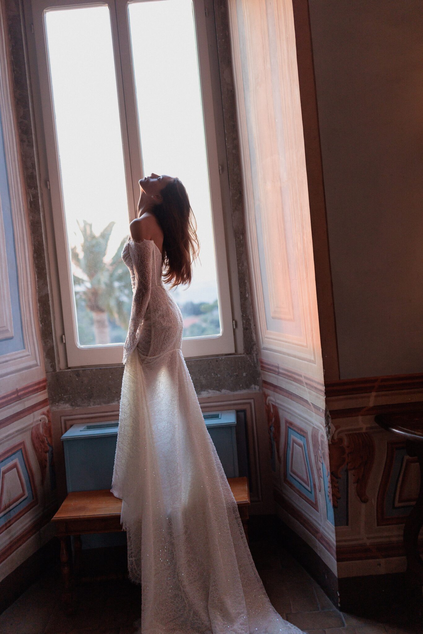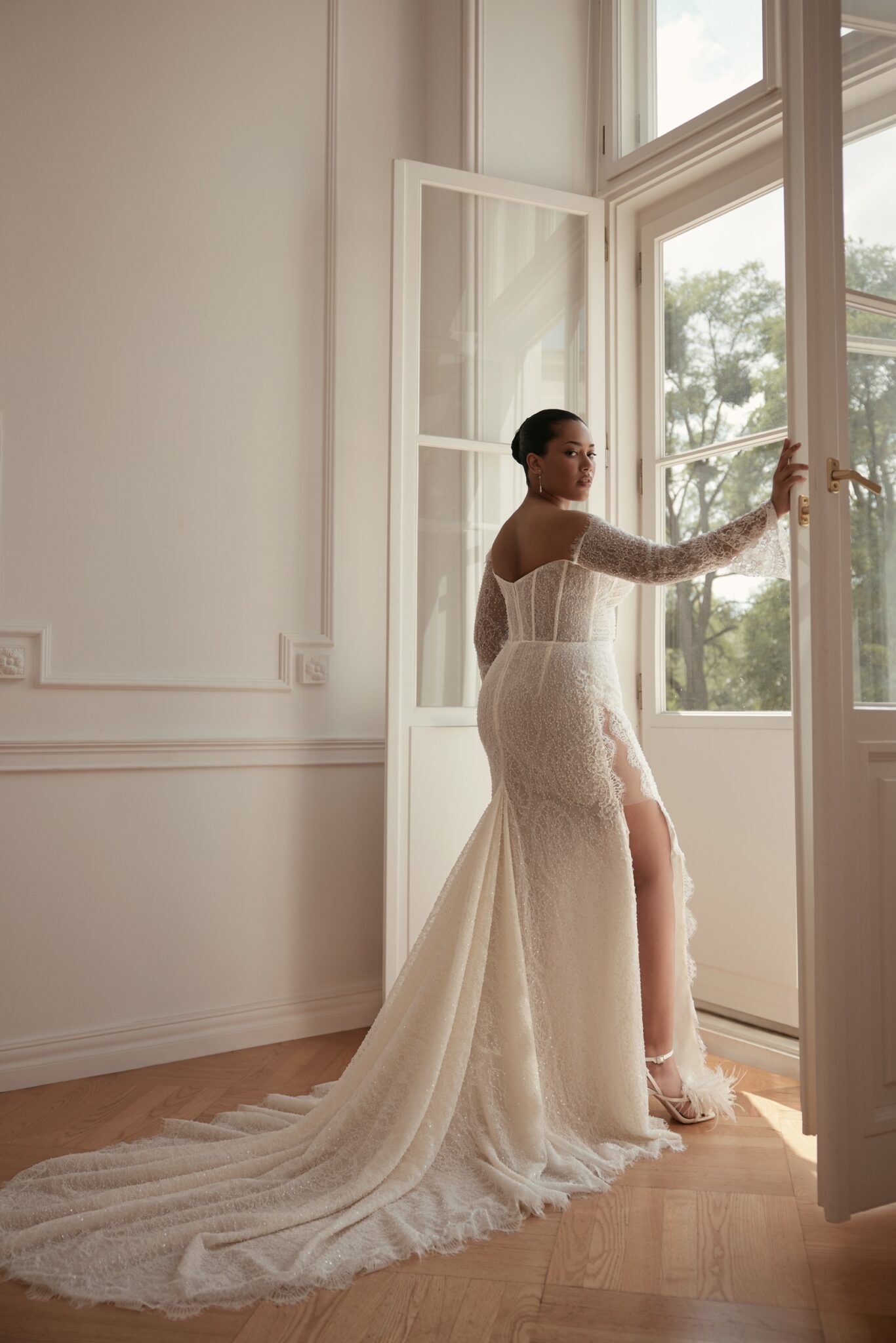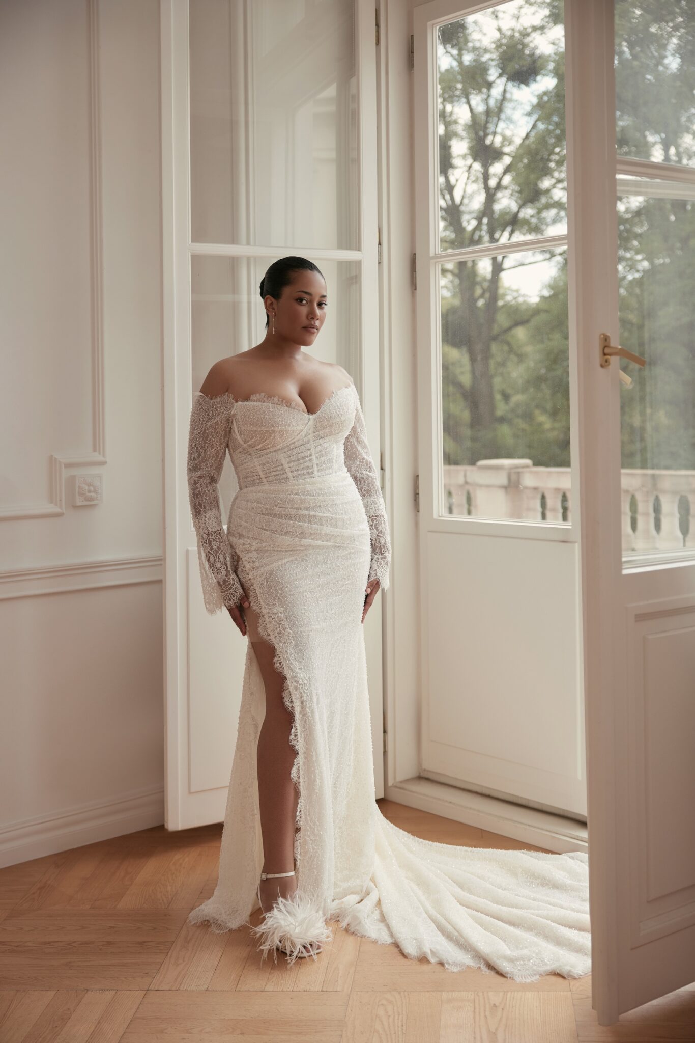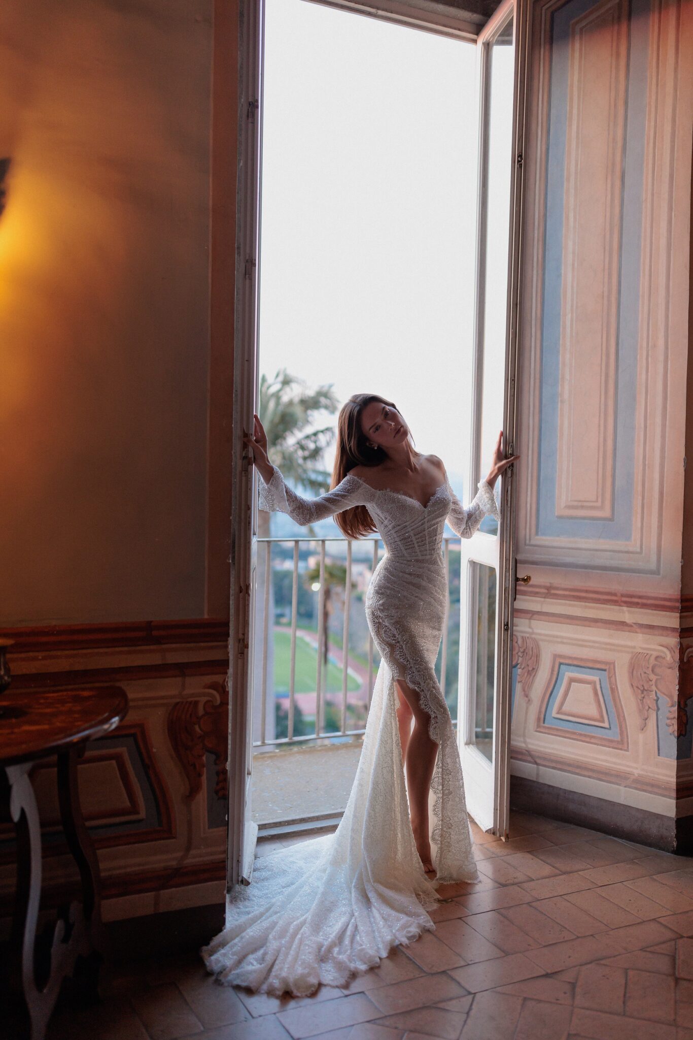 L'UnicoSo Sophisticated touch: feminine mermaid silhouette dress with heart-shaped cold-shoulder neckline and long flared sleeves, all embroidered by hand with floral motifs and features the skirt split from the knee.
