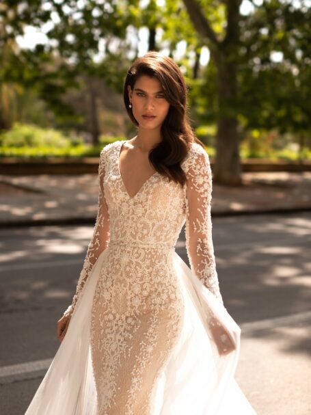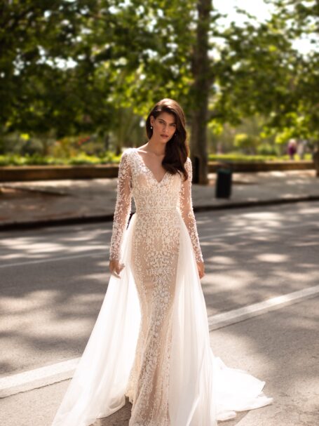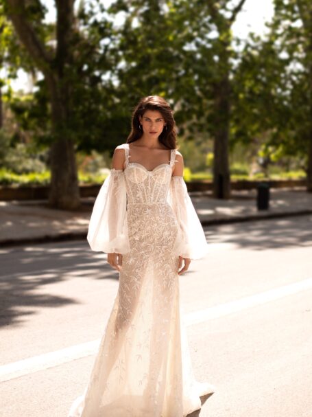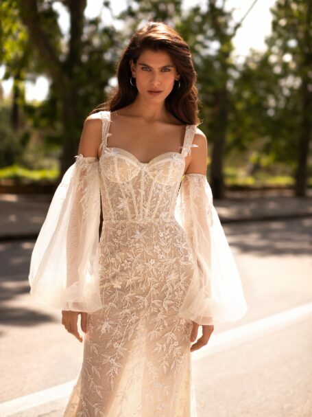 Made 4 LoveBernet is a fantastic fitted mermaid gown decorated with scattered hand-embroidered floral appliques on the sweetheart shaped strapless corset and magnificent fit-and-flare skirt. Can be paired with a showstopping detachable sheer lantern sleeves or tailored strong-shouldered long-sleeved bolero of the same lace.