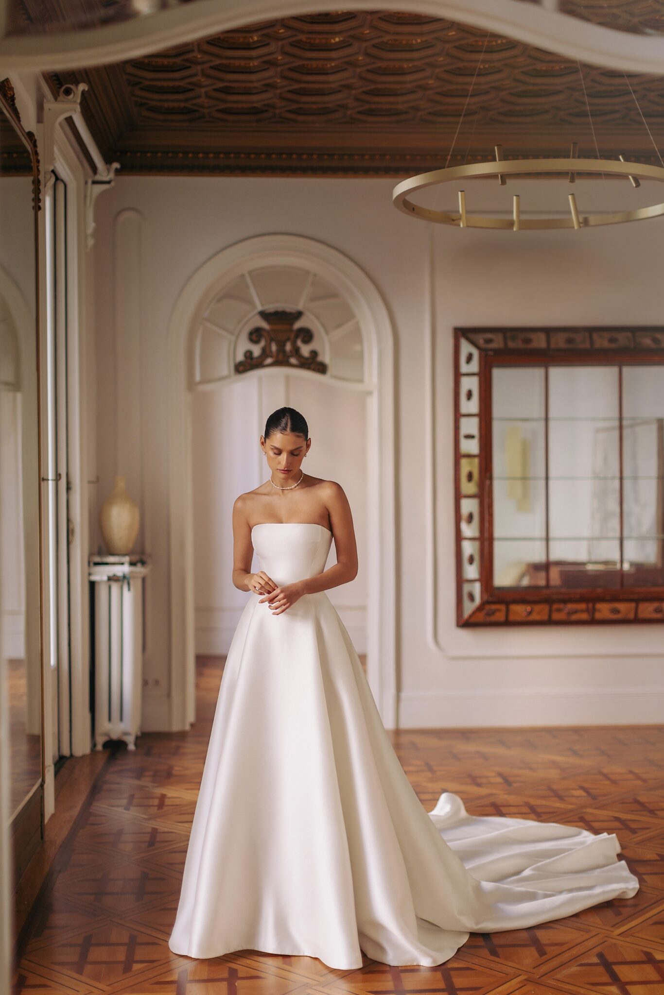 GeminiBernice — strapless A-silhouette with perfectly fit smooth corset top and elongated trail.