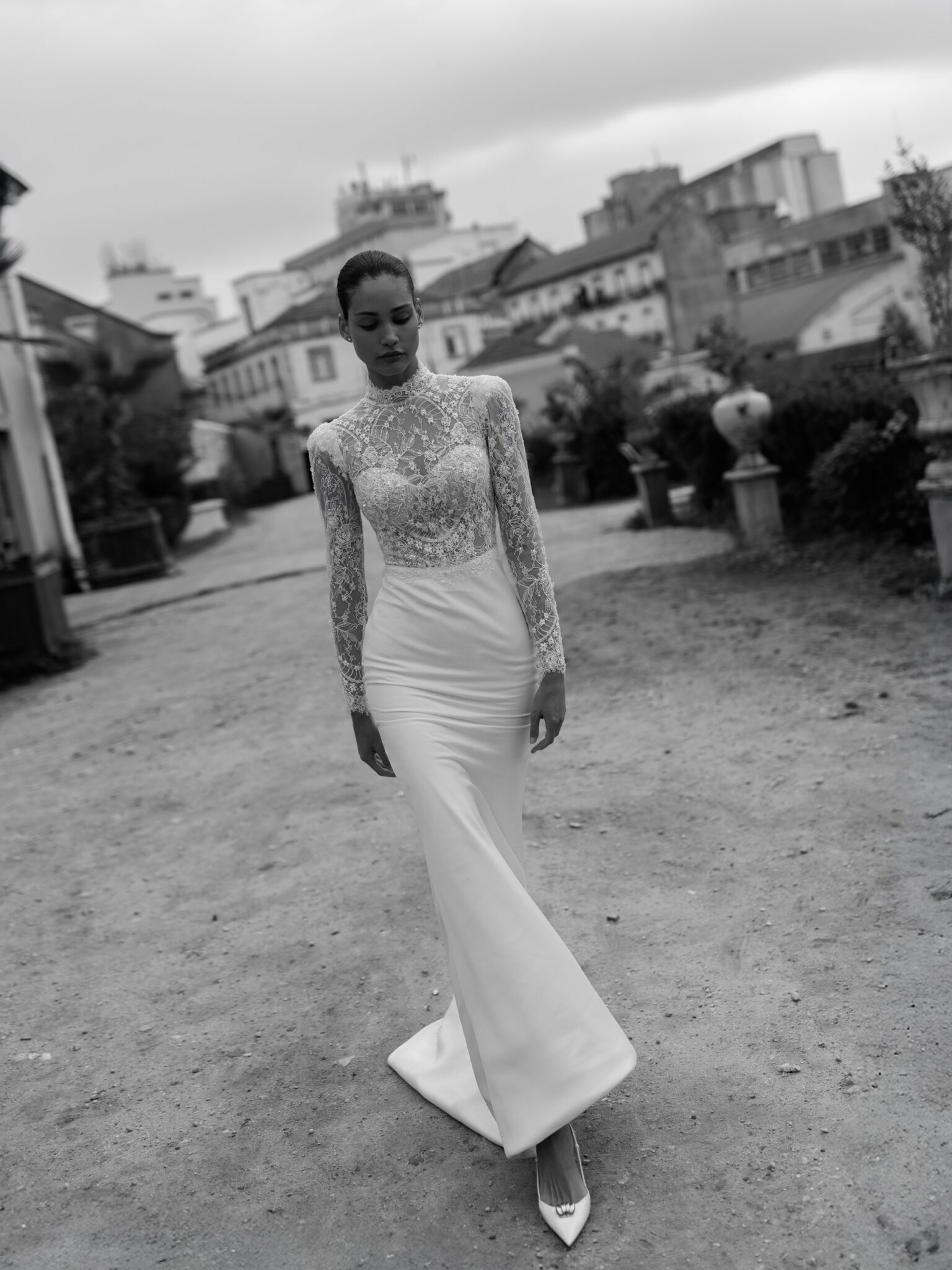 Bridal AlchemyBijou dress is a stunning transformer gown, combining elegance and versatility. The base dress is beautifully adorned with delicate lace that fully covers the décolleté area, creating a soft and refined look. Slightly raised shoulders add a touch of drama and sophistication.