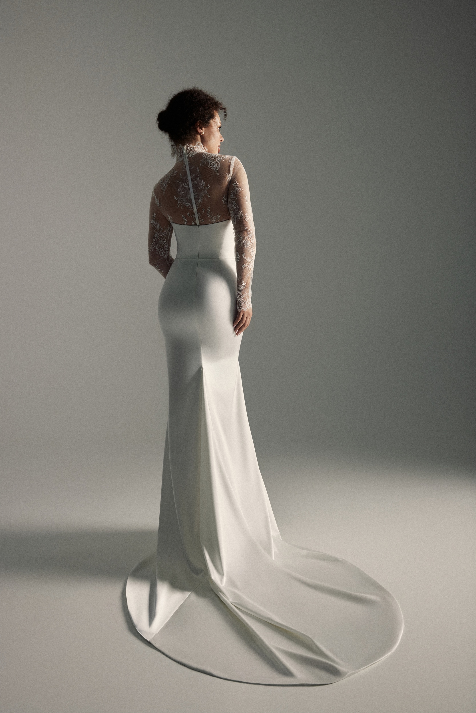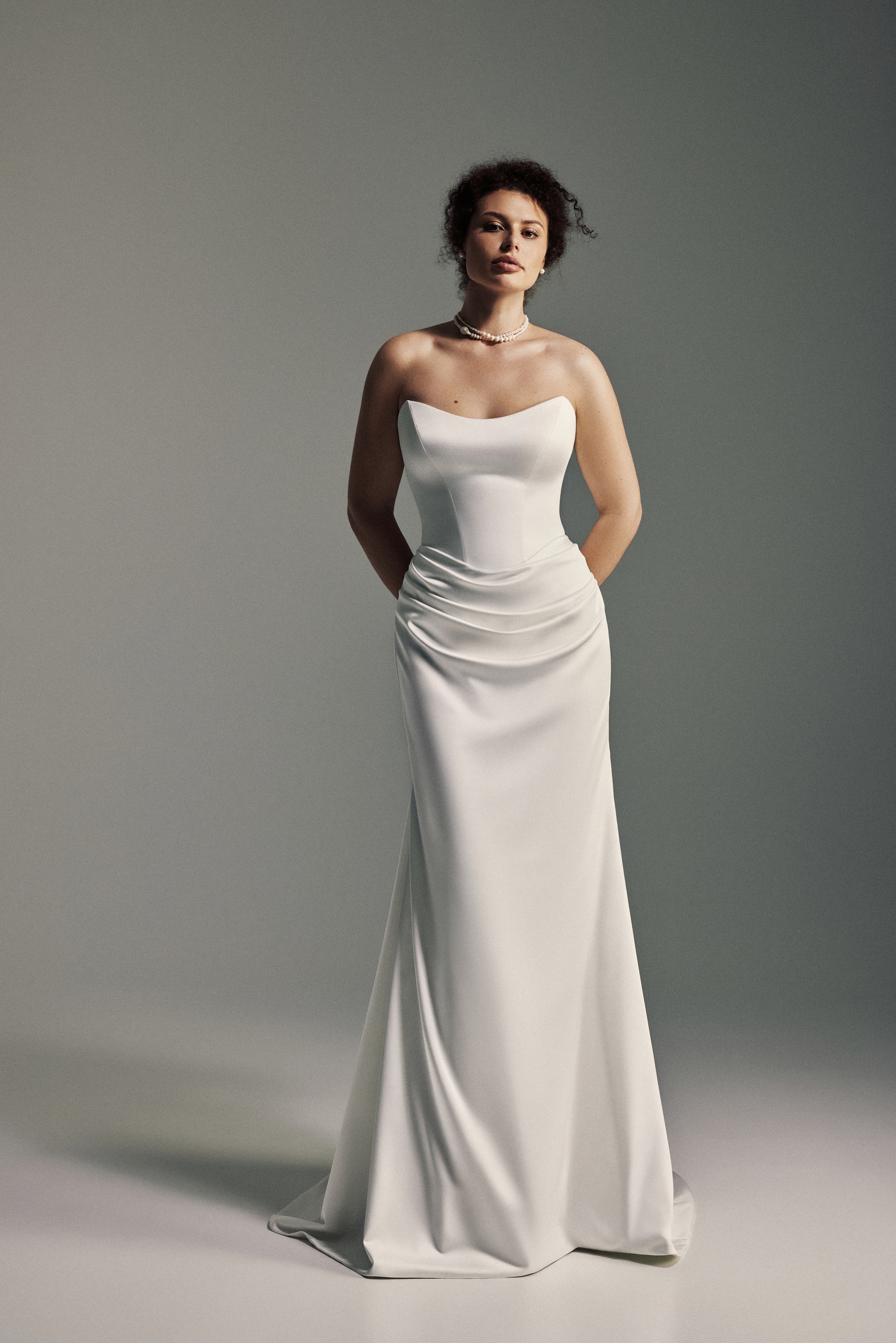 Billie is a sleek and confident gown that highlights the beauty of clean lines and modern femininity, featuring a sheath silhouette with soft draping at the waist that enhances the figure and creates an effortless flow. A sculpted strapless corset defines the bodice, while a low back adds subtle allure, complemented by a graceful chapel-length train; for a versatile bridal look, Billie can be styled with an optional lace bolero, offering a refined transition from ceremony to celebration.