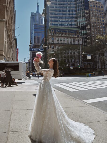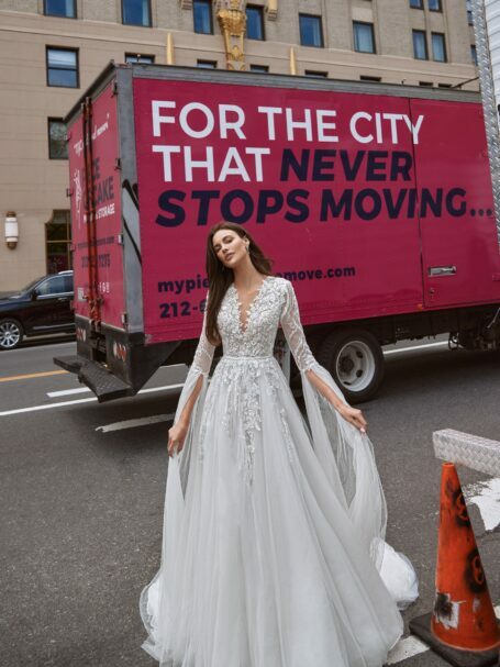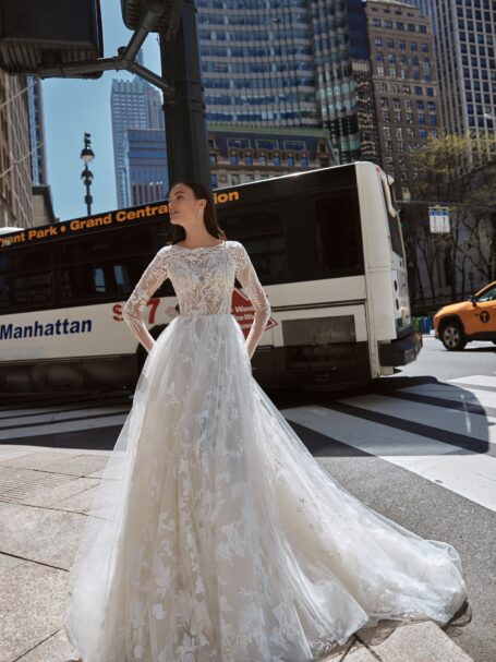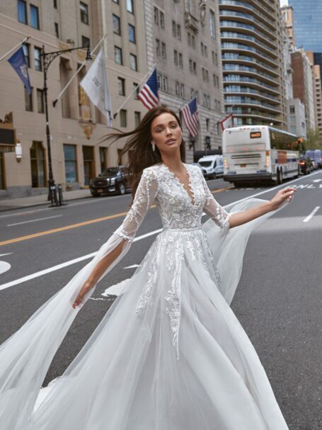 Love in the City, Plus SizeBlanc is a chic and glamorous gown, embroidered with sparkling sequins along the whole length. The neckline is V-shaped, the long sleeves, made of embroidered lace, are accomplished With shoulder pads. The skirt is fitted on the hips and widens down creating the elegant medmaid silhouette. The back of the dress is covered and embellished with a train.