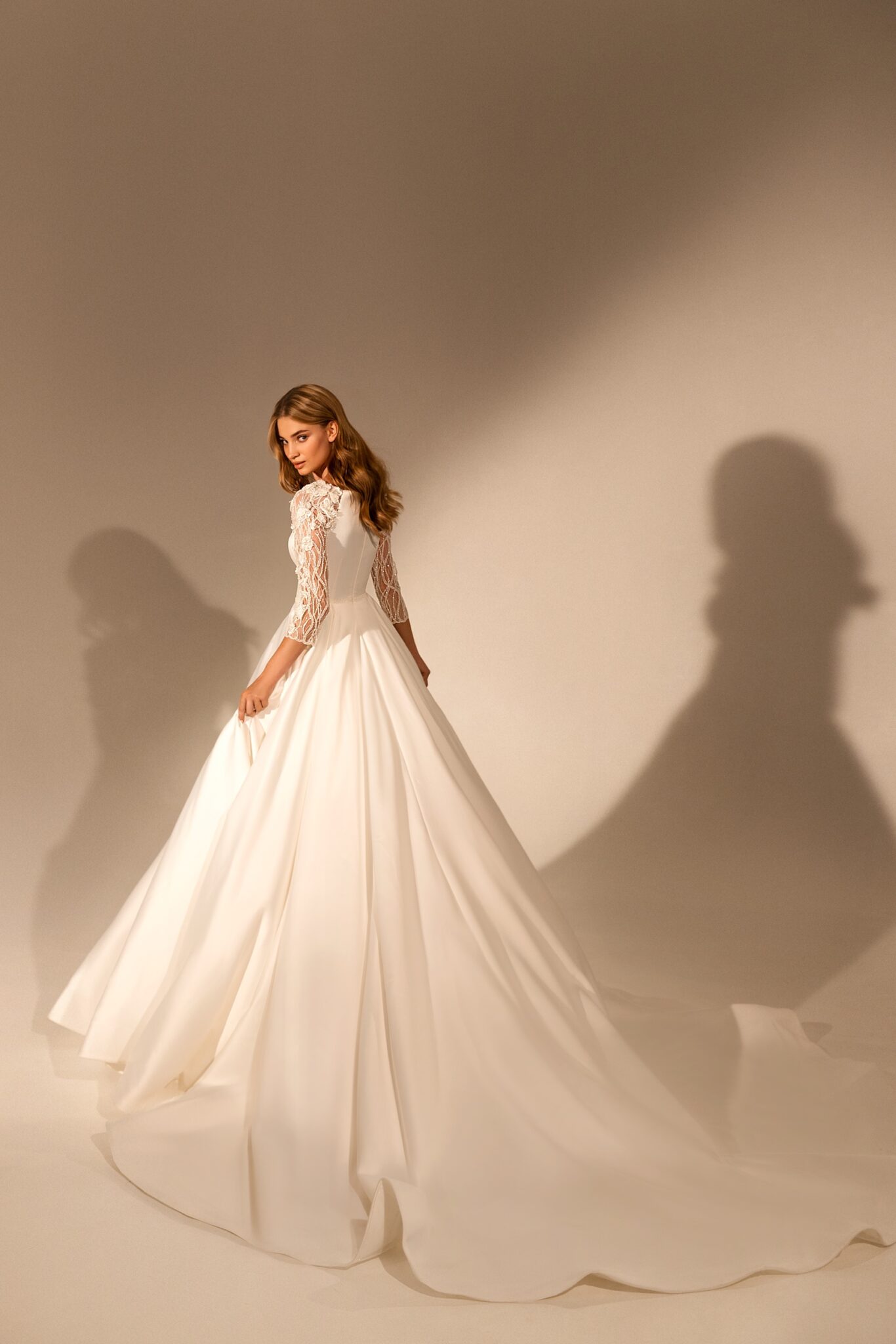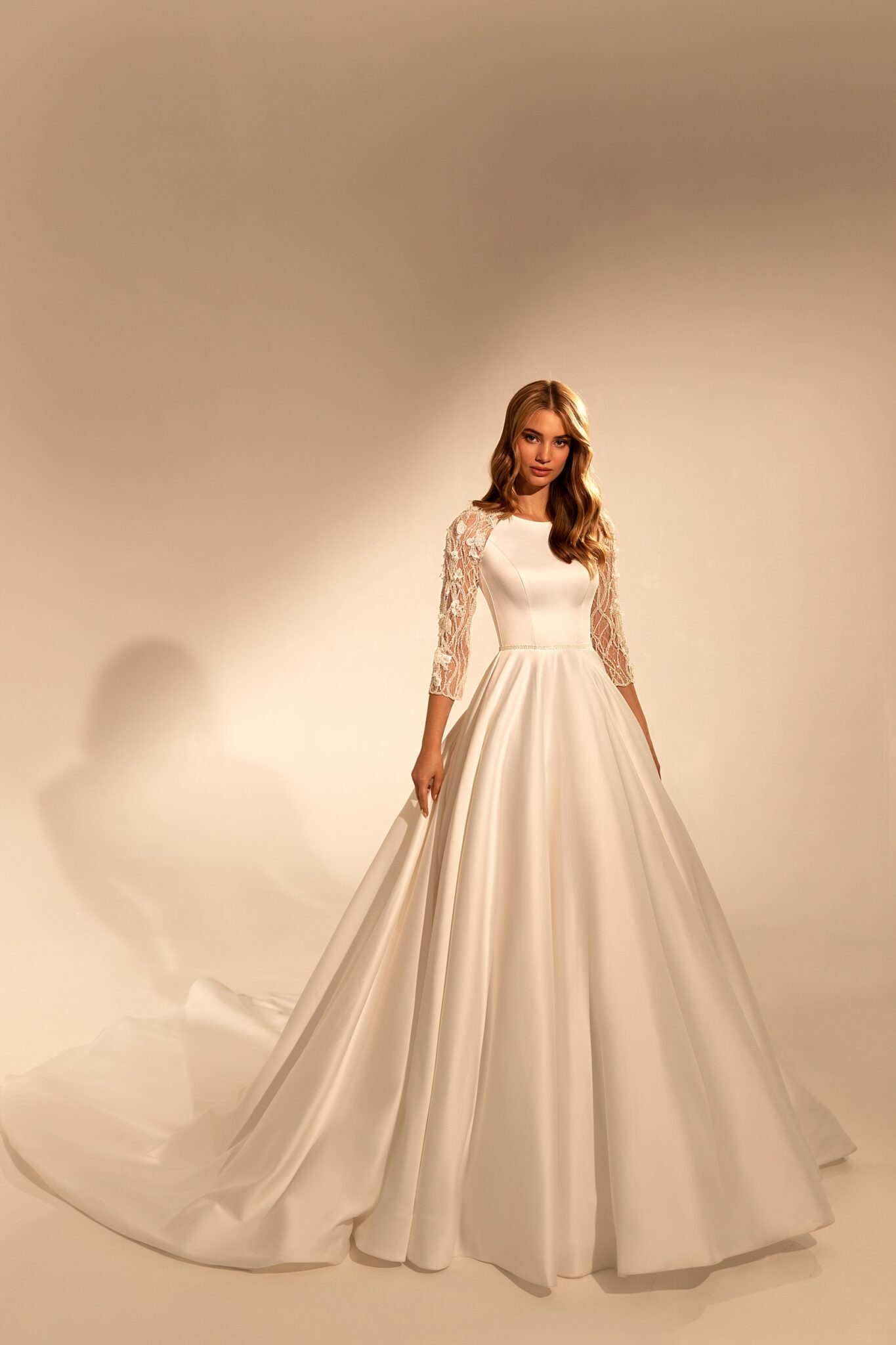 MuseBridget wedding dress is a combination of different elements. The dress itself is made of glossy satin. A bodice is decorated with a lozenge-shaped neckline and a belt that is made of shining spangles. Long sleeves are made of transparent fabric with floral pattern. It is also decorated with lace elements that are embroidered with beads. Wrists are decorated with beads too. A magnificent skirt passes into a long train.