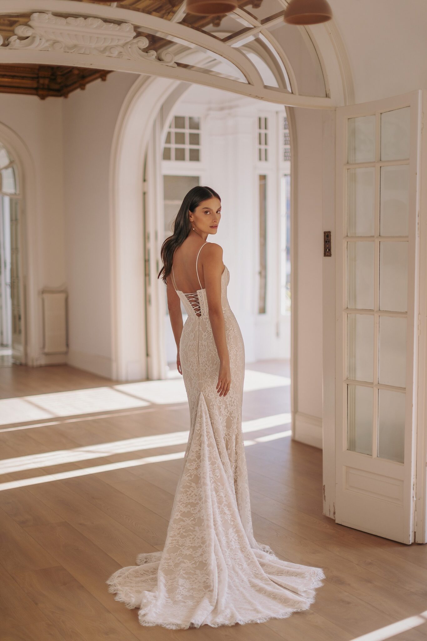 GeminiBronx — lace embellished mermaid silhouette with corset and thin straps, complemented by detachable lace long gloves.