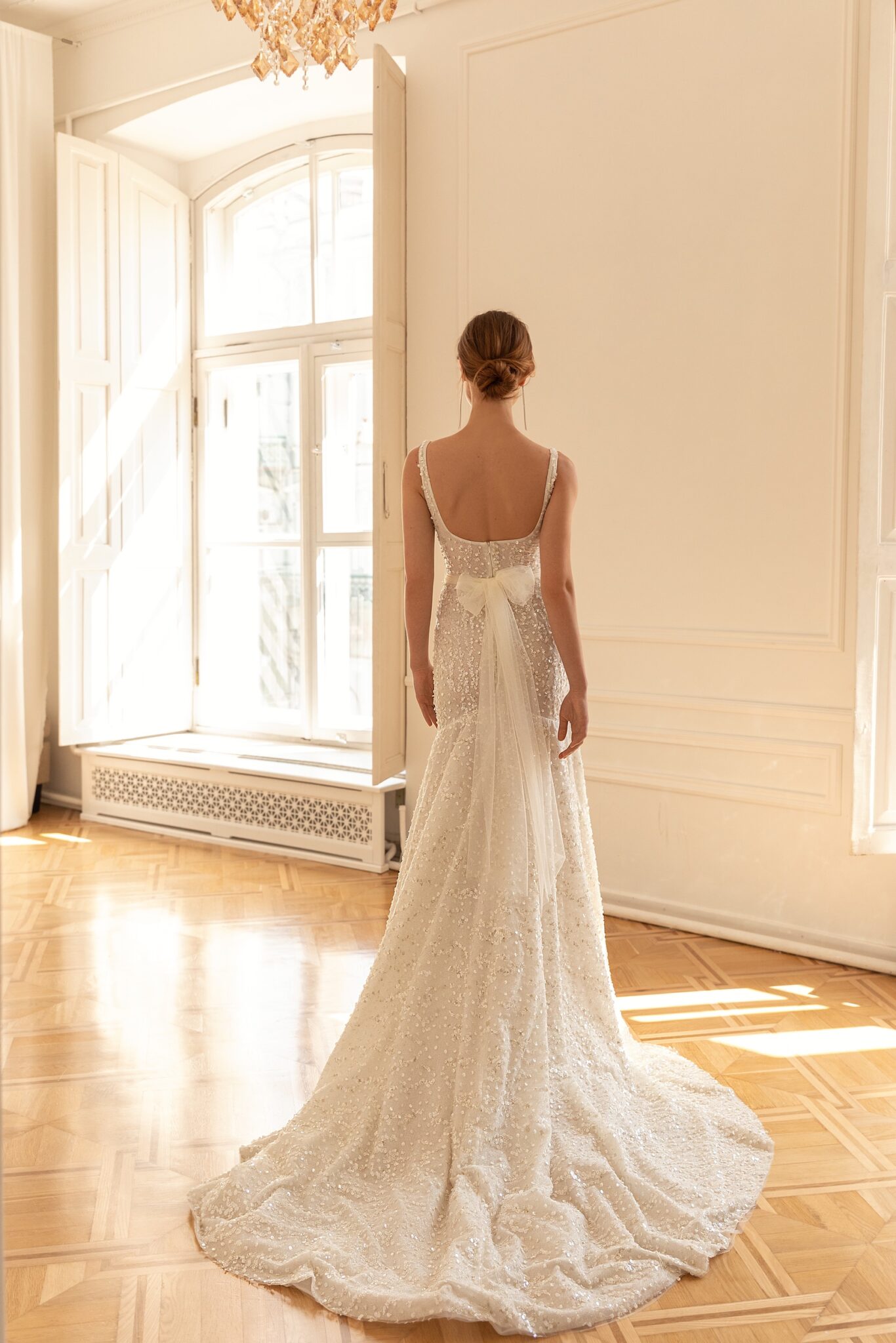 Less is more 2022Calabria is a tender and feminine wedding dress decorated with sparkling sequins through all length. The wedding gown with a Boat neckline has wide straps and accentuates the bride’s waistline with a transparent Tulle band tied in a bow on the back. The skirt is fitted on the hips and widens down to the floor creating a beautiful mermaid silhouette with a long train.
