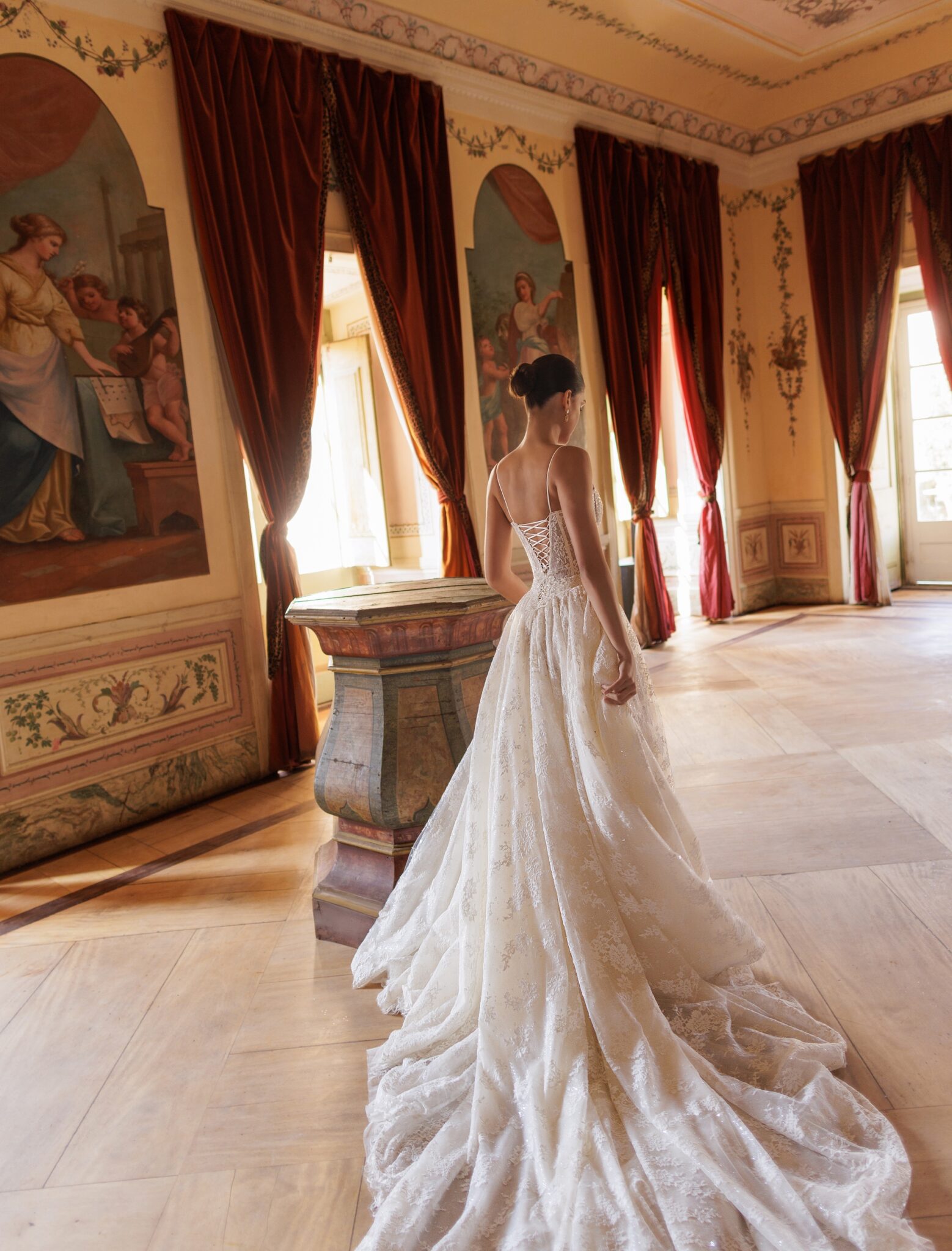 Bridal AlchemyA striking mermaid-style wedding gown with a detachable chapel-length train. Crafted from luxurious lace and adorned with delicate lace appliqués, this gown blends elegance with versatility. The train is fully embellished with lace and effortlessly fastens at the waist, secured with a lace-up back for a seamless fit.