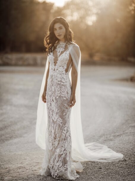 Love storiesSpectacular Candice wedding dress takes your breath away. A combination of different materials creates the airy and loose look. A bridal gown is made of sheer fabric with a floral pattern. Long, airy sleeves look fantastic. Veiling insets at the front and back of the dress are tied in a bow.