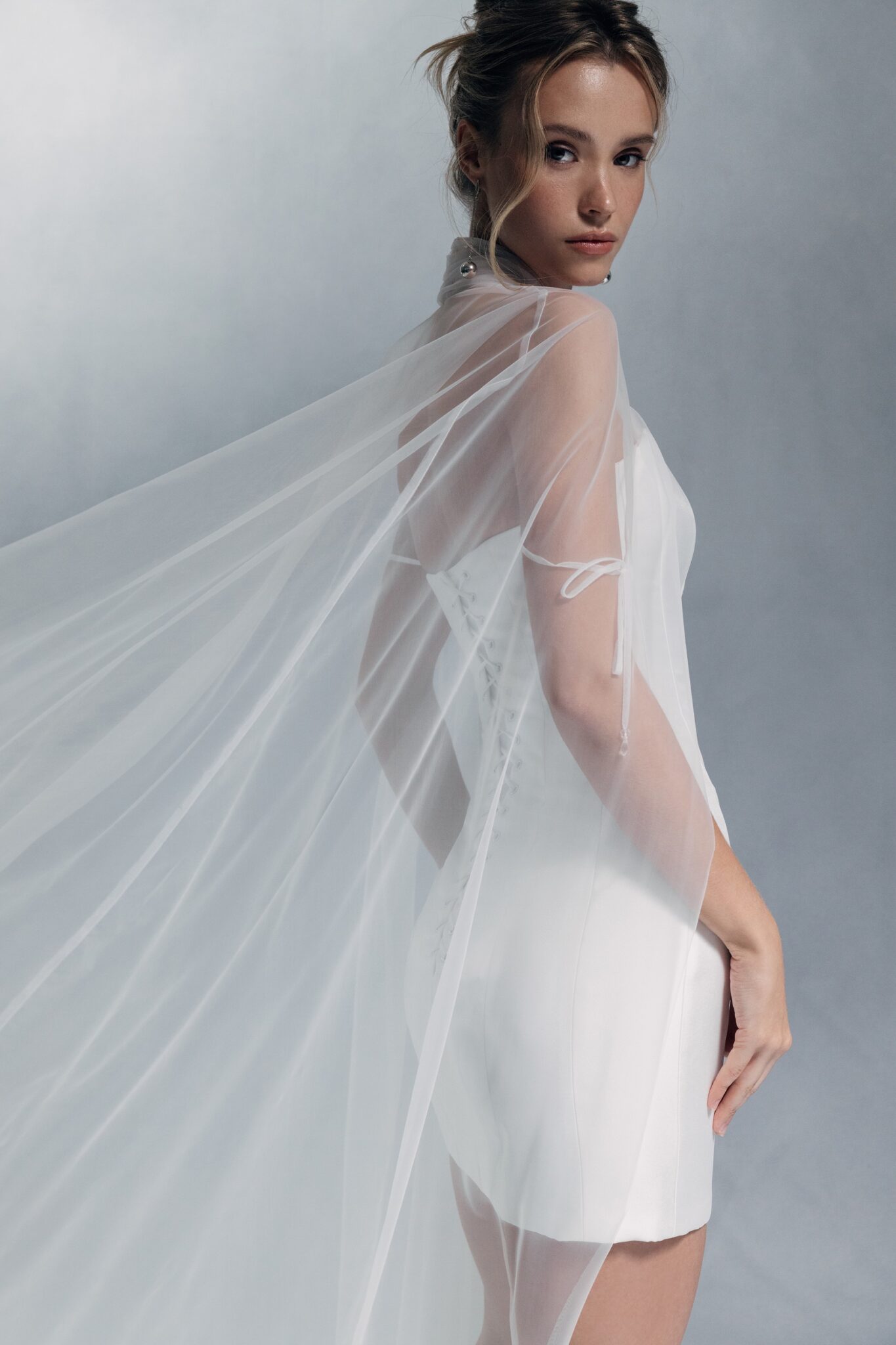 Special EditionA refined mini dress with minimalistic design, featuring textured fabric and a tulle bolero that adorns the neck and flows down the sides, creating a sleeve-like effect.