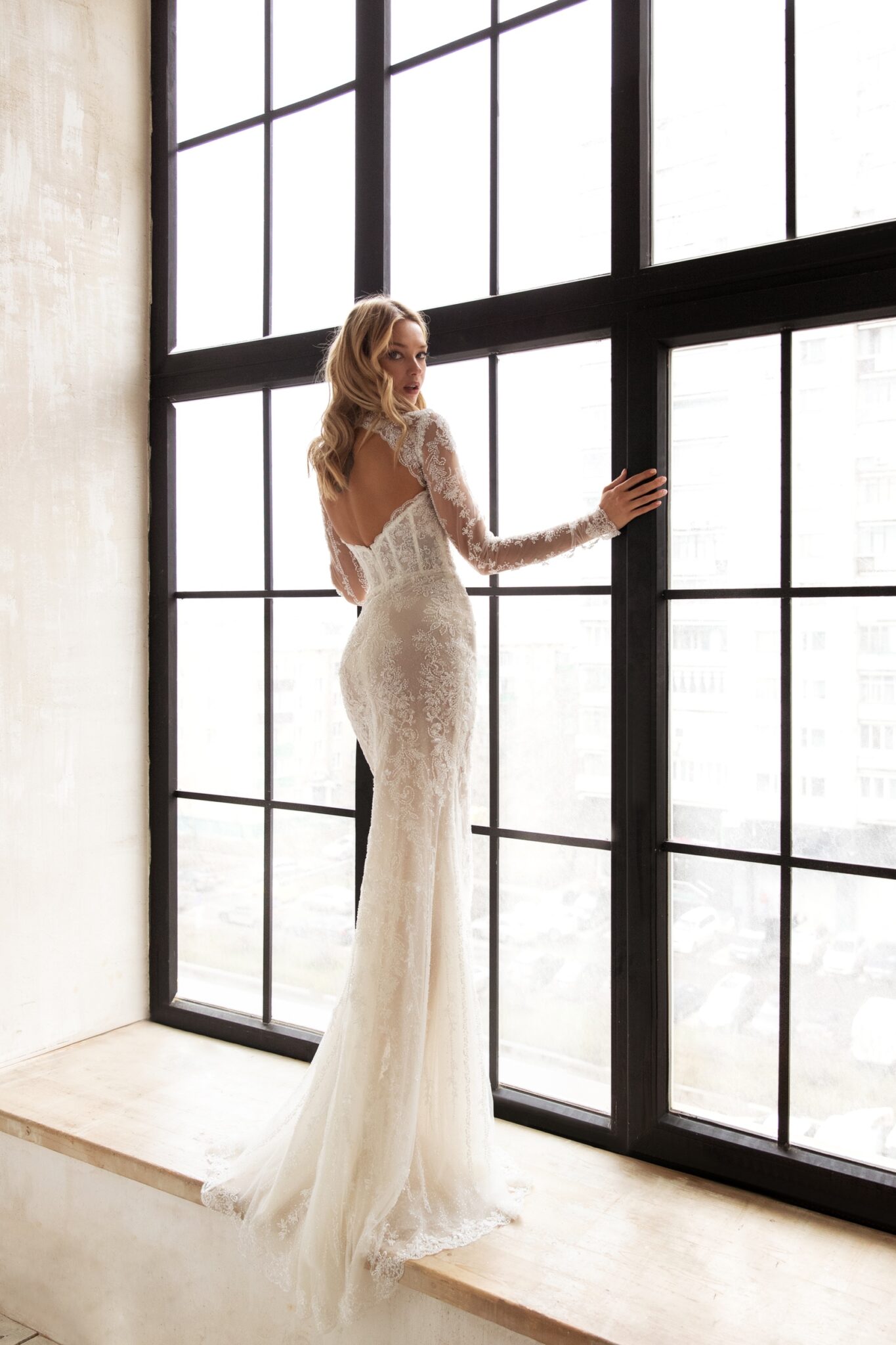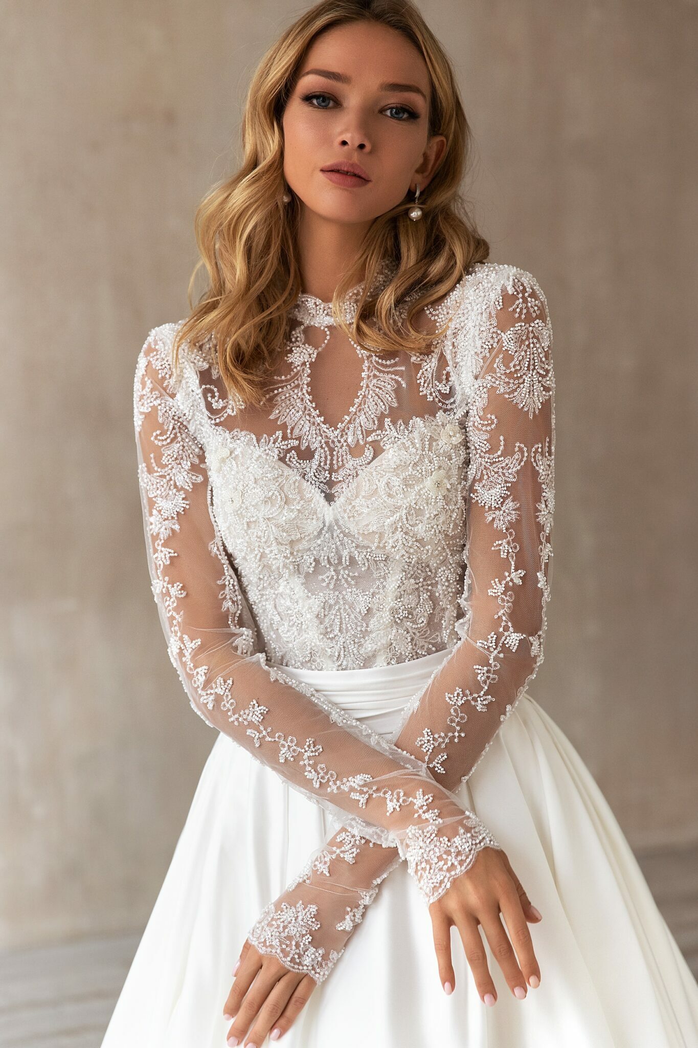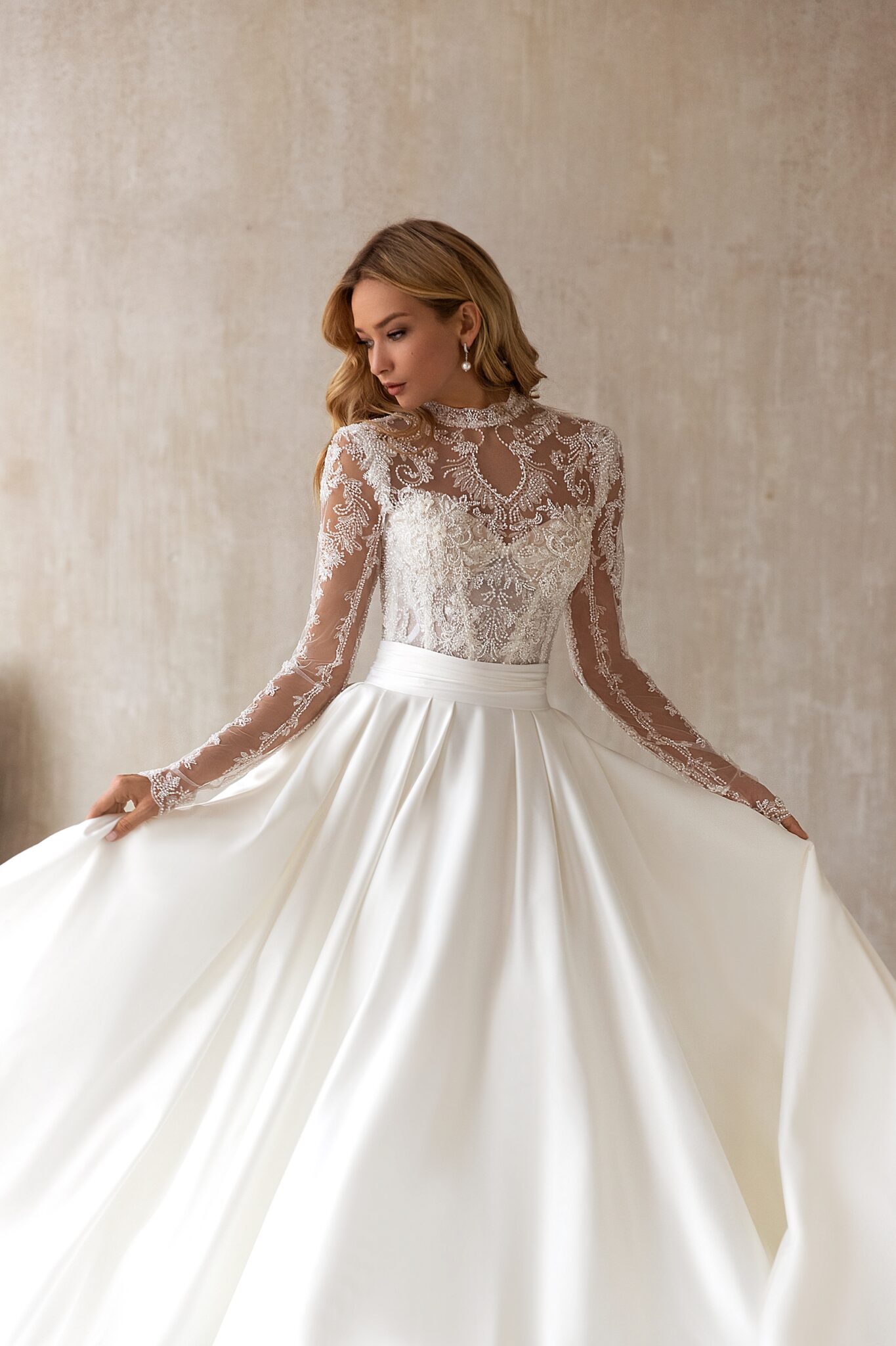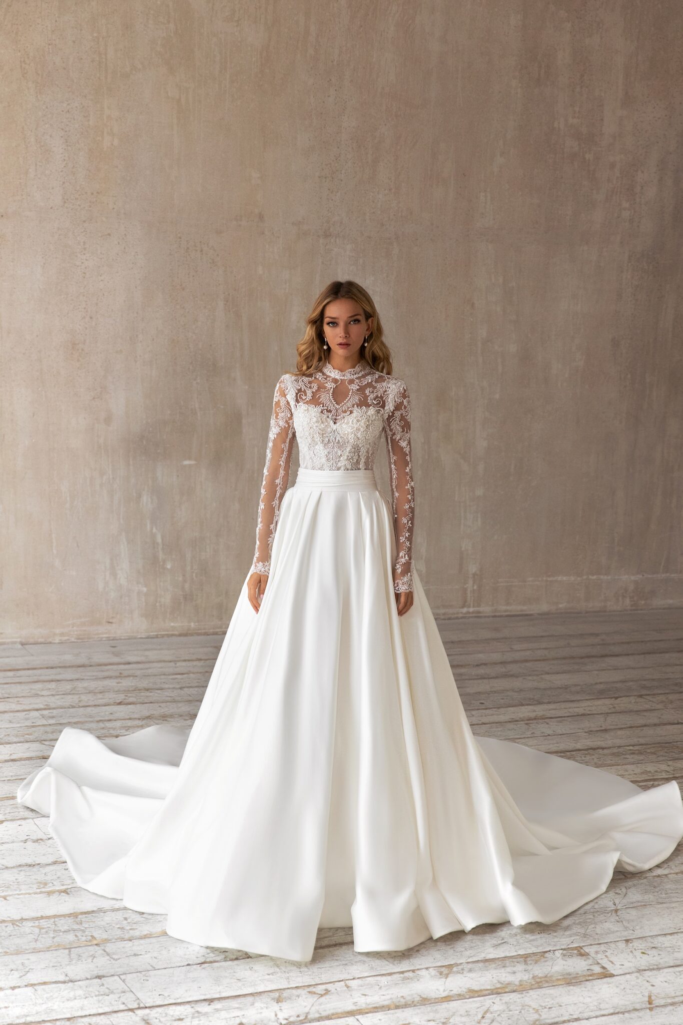 Less is more 2021This wedding gown is a perfect solution for brides that want to change a few looks during the celebration. A sheath dress is made of lace and decorated with a floral pattern. It is also embellished with pearls and beads. A high collar with a keyhole and long transparent sleeves make this dress enigmatic. A spectacular detail is a rounded neckline at the back of a dress. An additional loose skirt with take-ups is made of glossy fabric. This additional skirt is fixed on a waistline and embellished with a belt. There is a magnificent train.