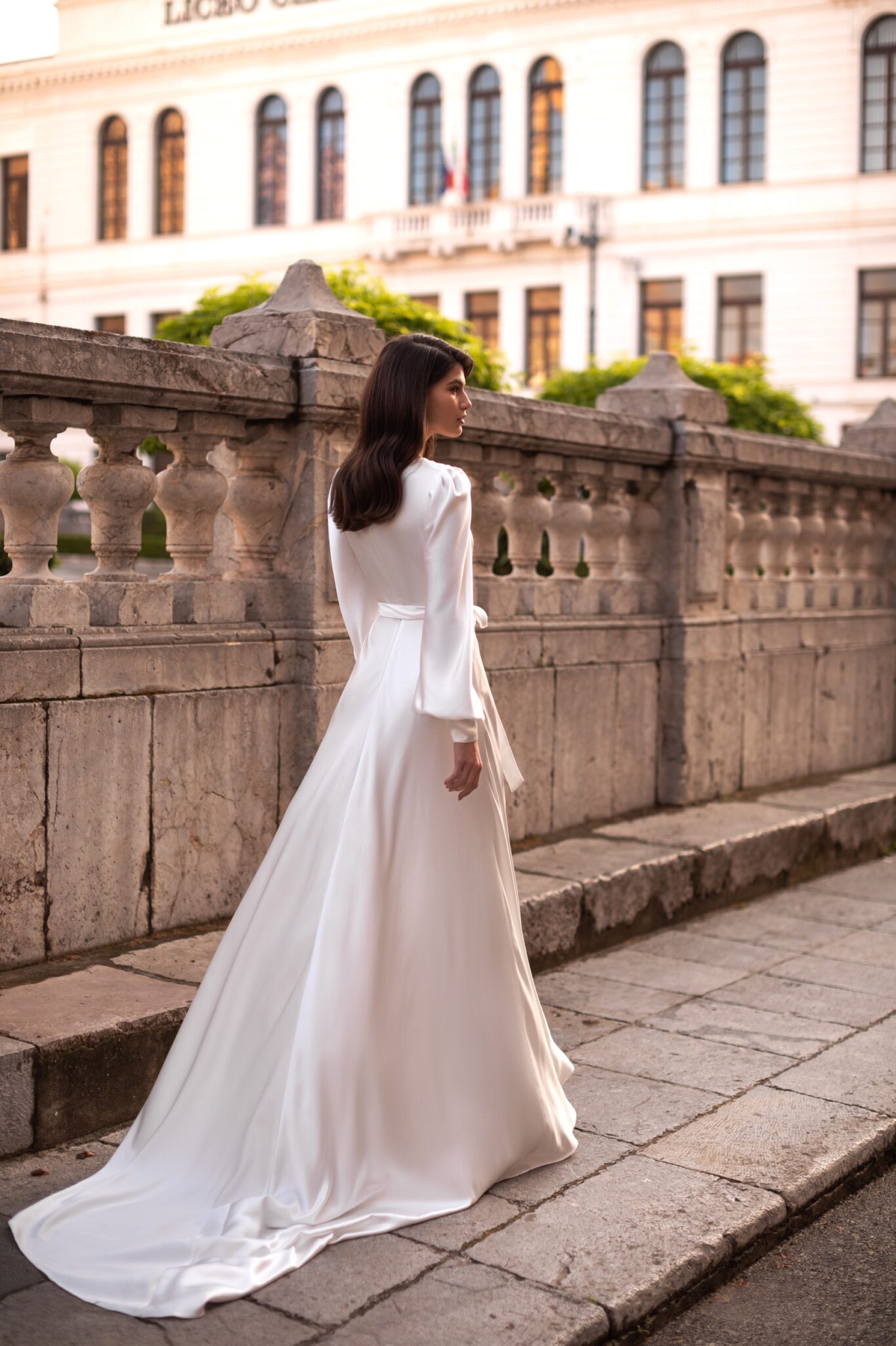 Made 4 LoveSoft silky fabric creates a smooth silhouette of this elegant A-line wrap wedding dress. Sophisticated V-shaped neckline and sheer long lantern sleeves make the dress glamorous and sexy with a sophisticated twist. A clean, creamy silk A-line skirt with a thigh-high slit is completed with a sweeping chapel train.