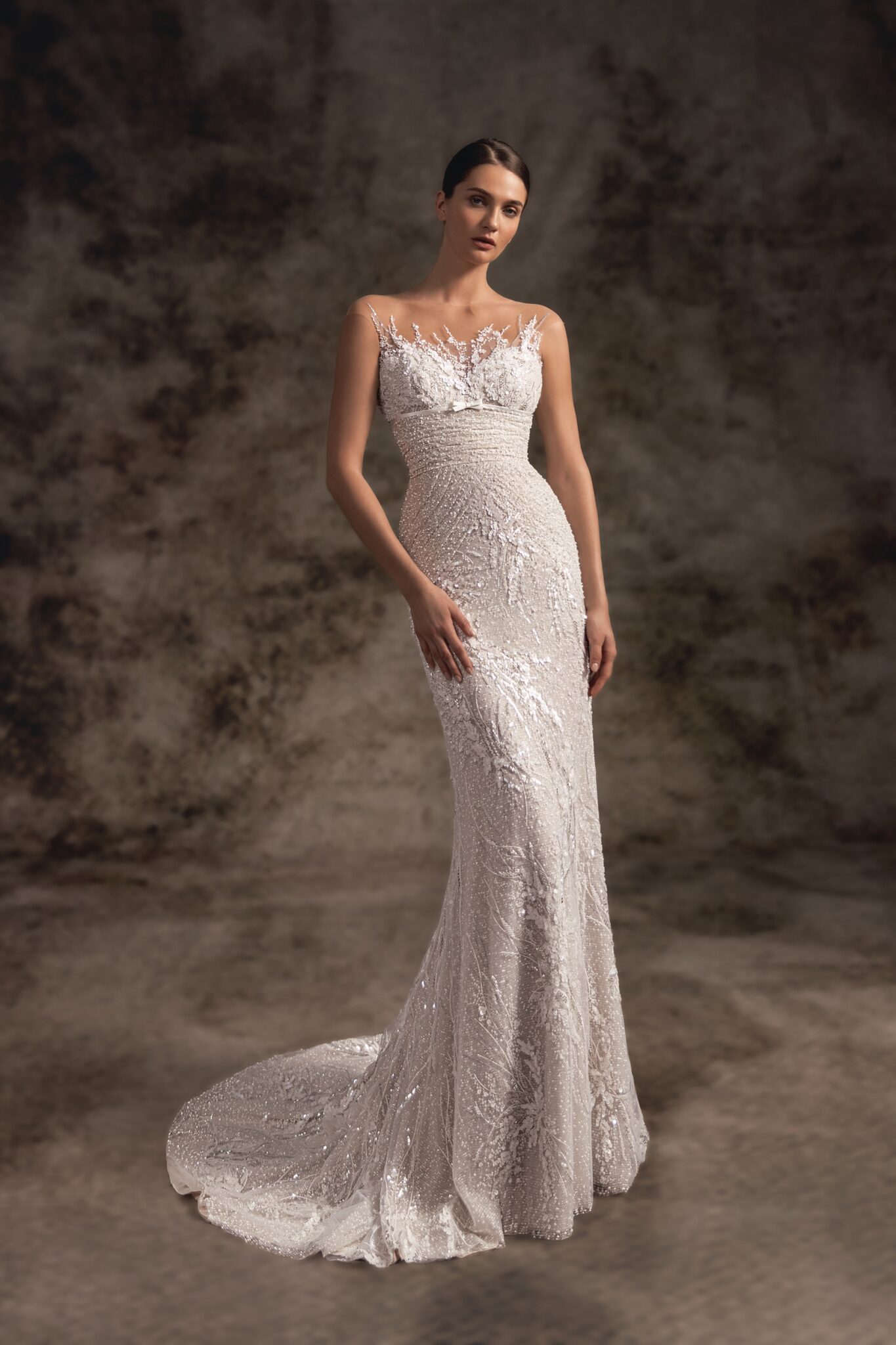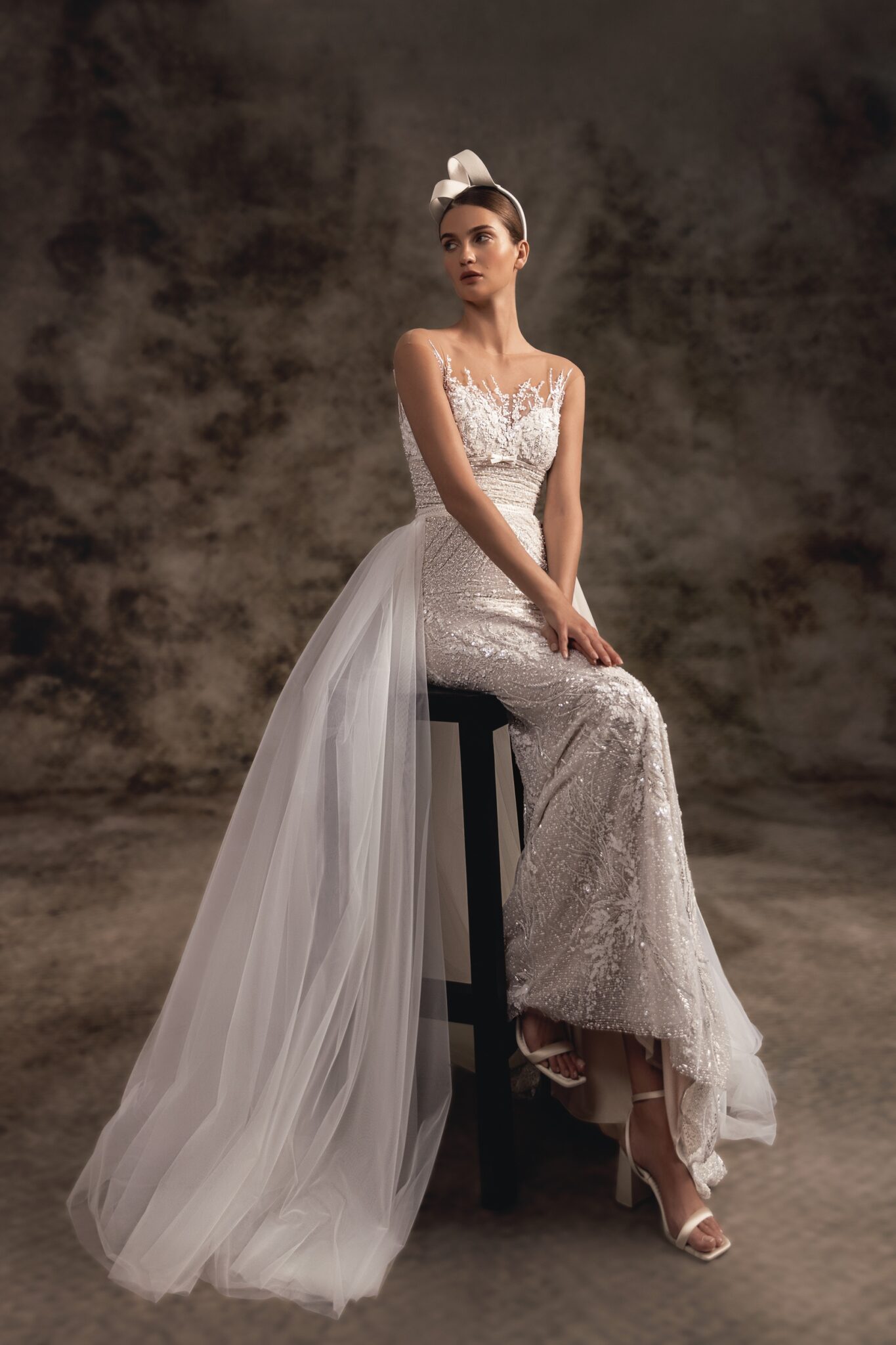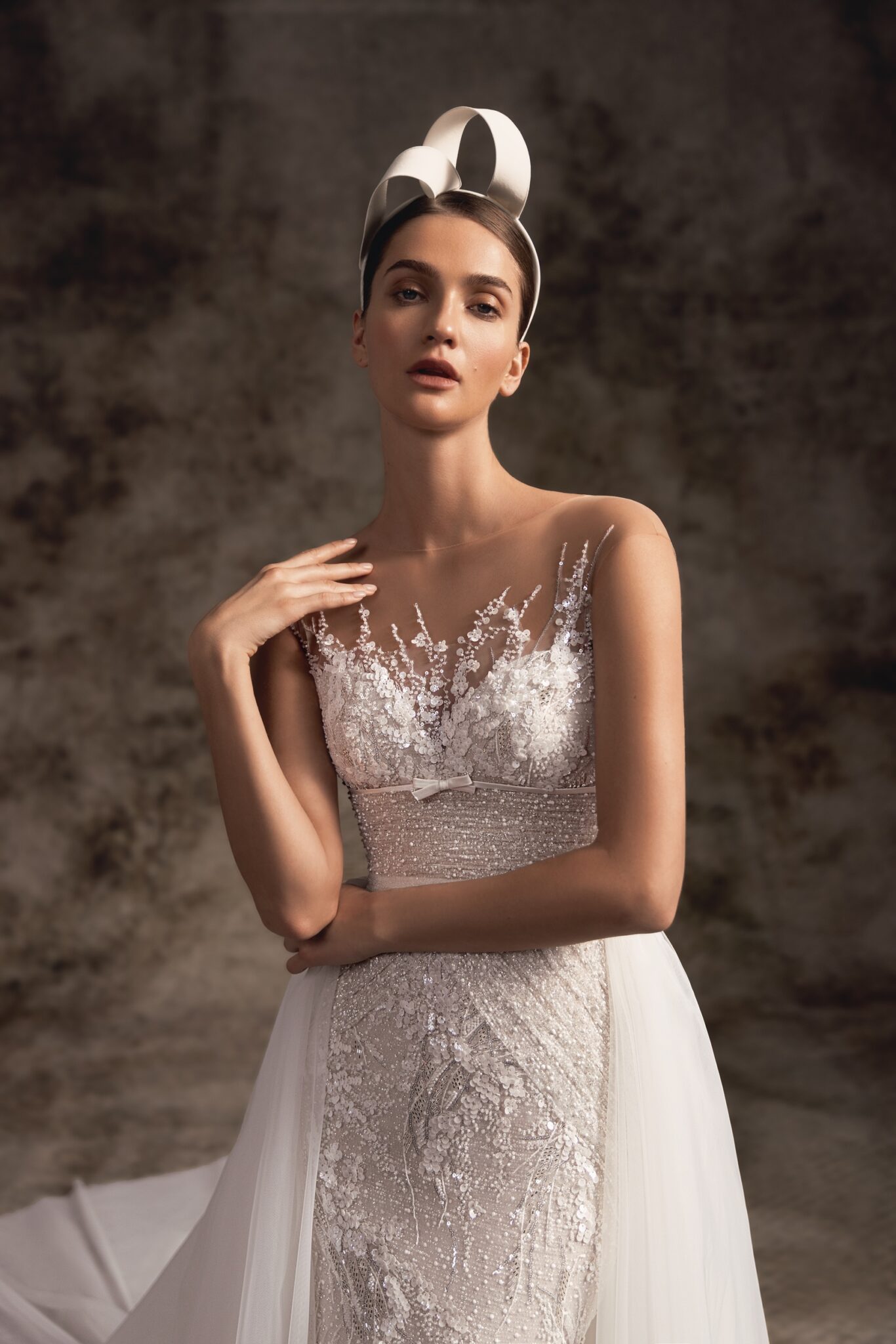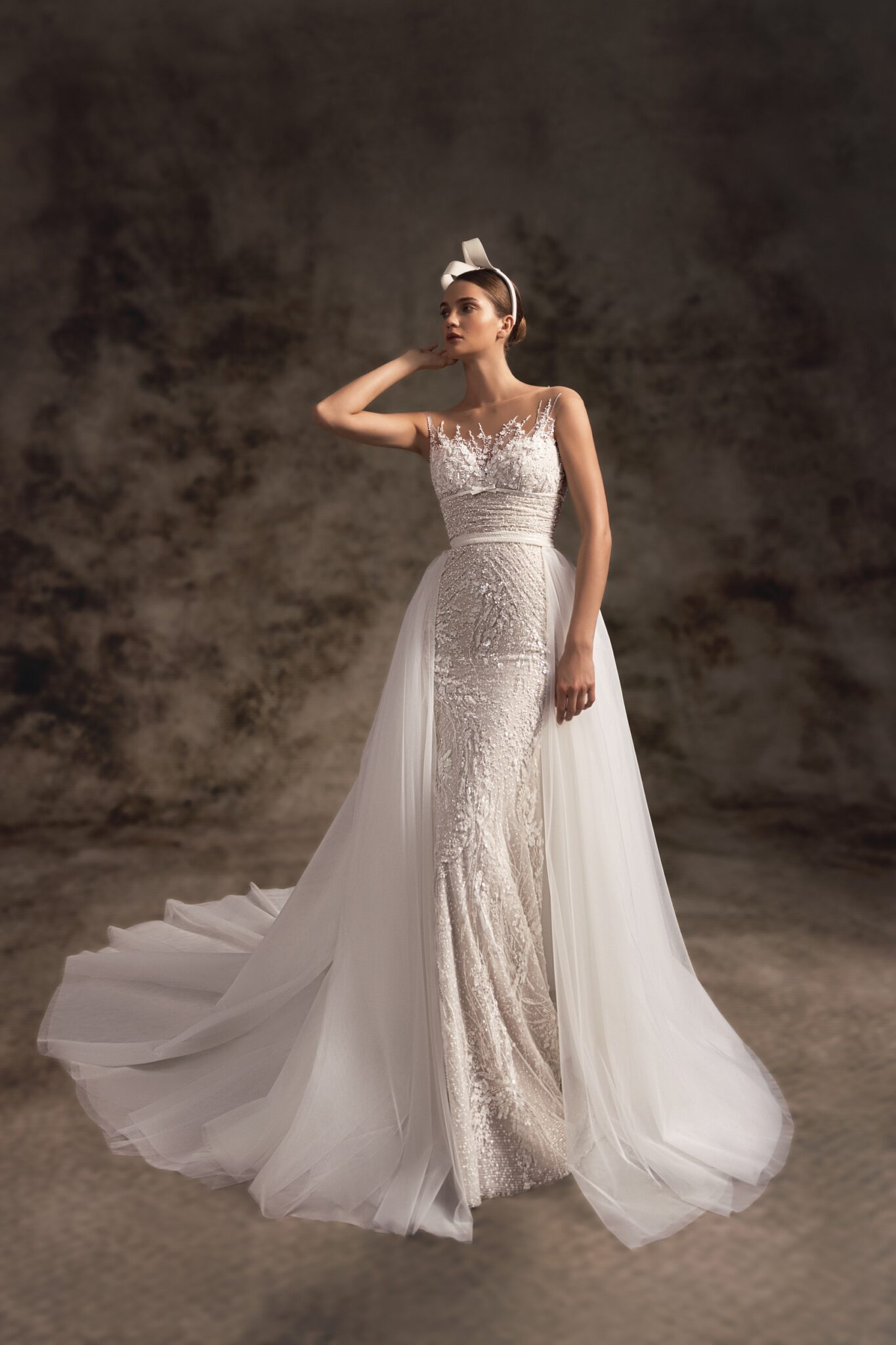 Notte d'OperaIn a creamy neutral palette, this sleeveless wedding dress is a true pearl of the collection featured with a unique design. The elegant sheer corset is embellished with mini floral embroideries with beads and crystals. A femininely structured mermaid fitted skirt features delicate hand-embroidered floral lace and a magnificent chapel train. A lightweight overskirt with soft cathedral-length train that is fastened on the waistline makes a dress a real dream.