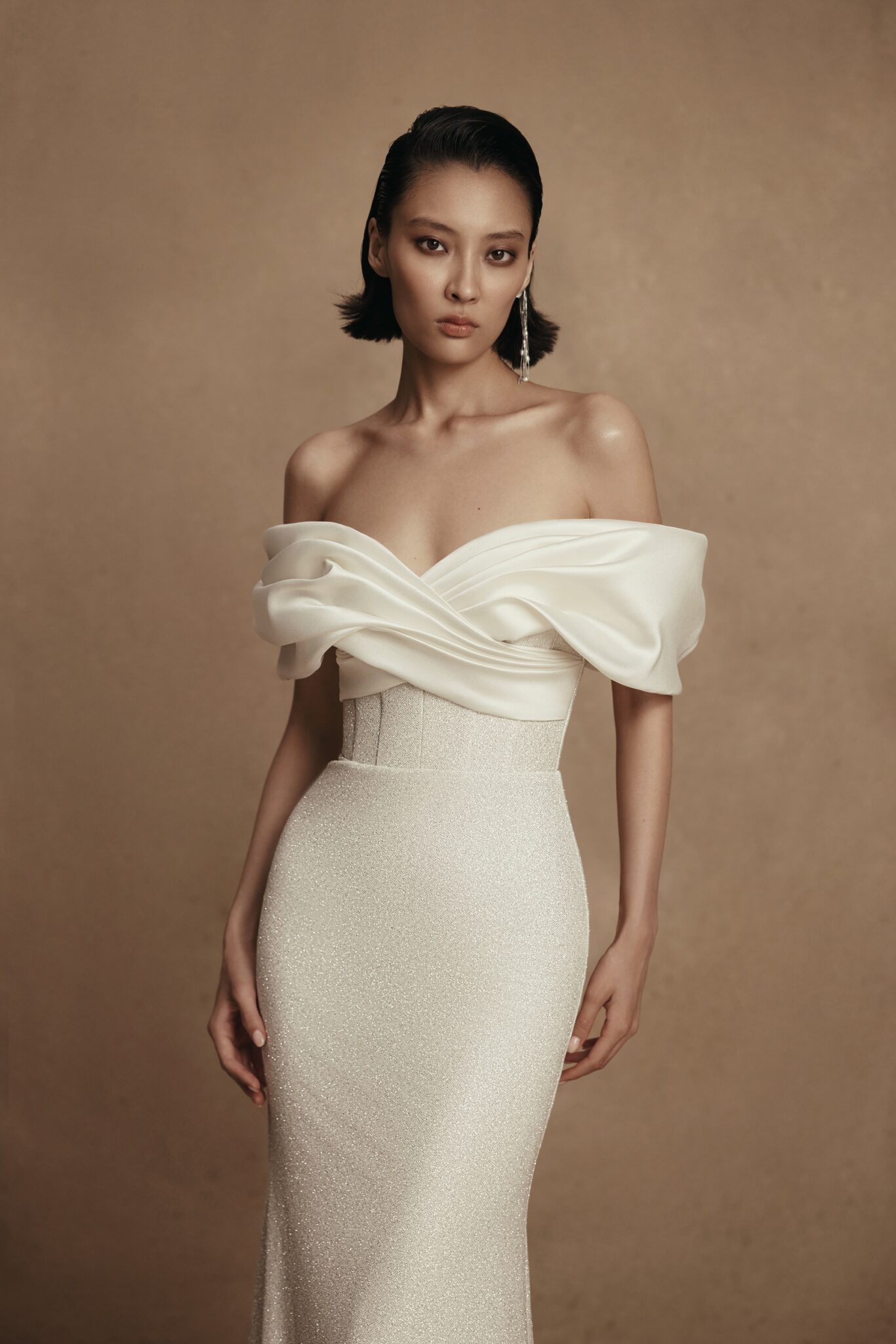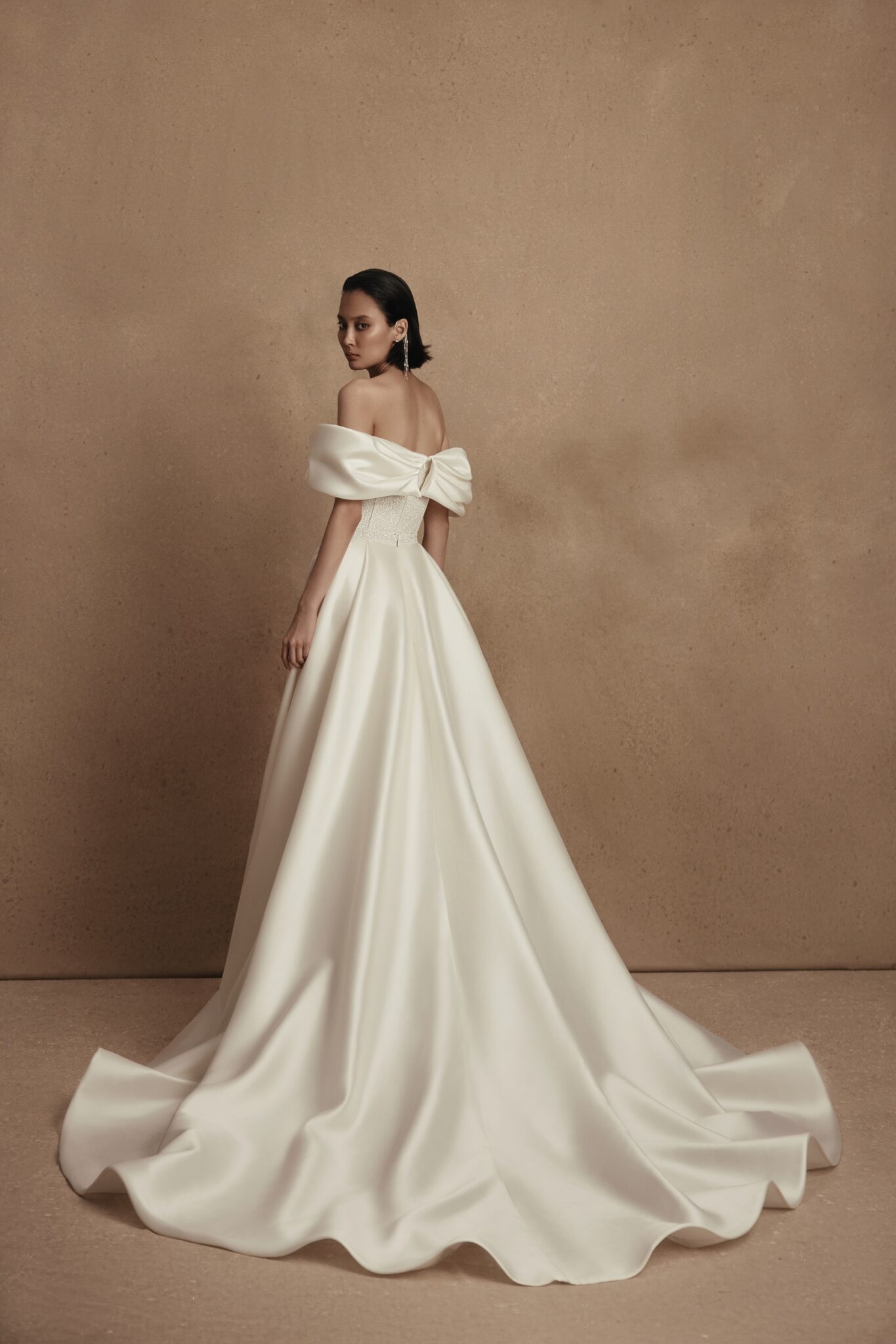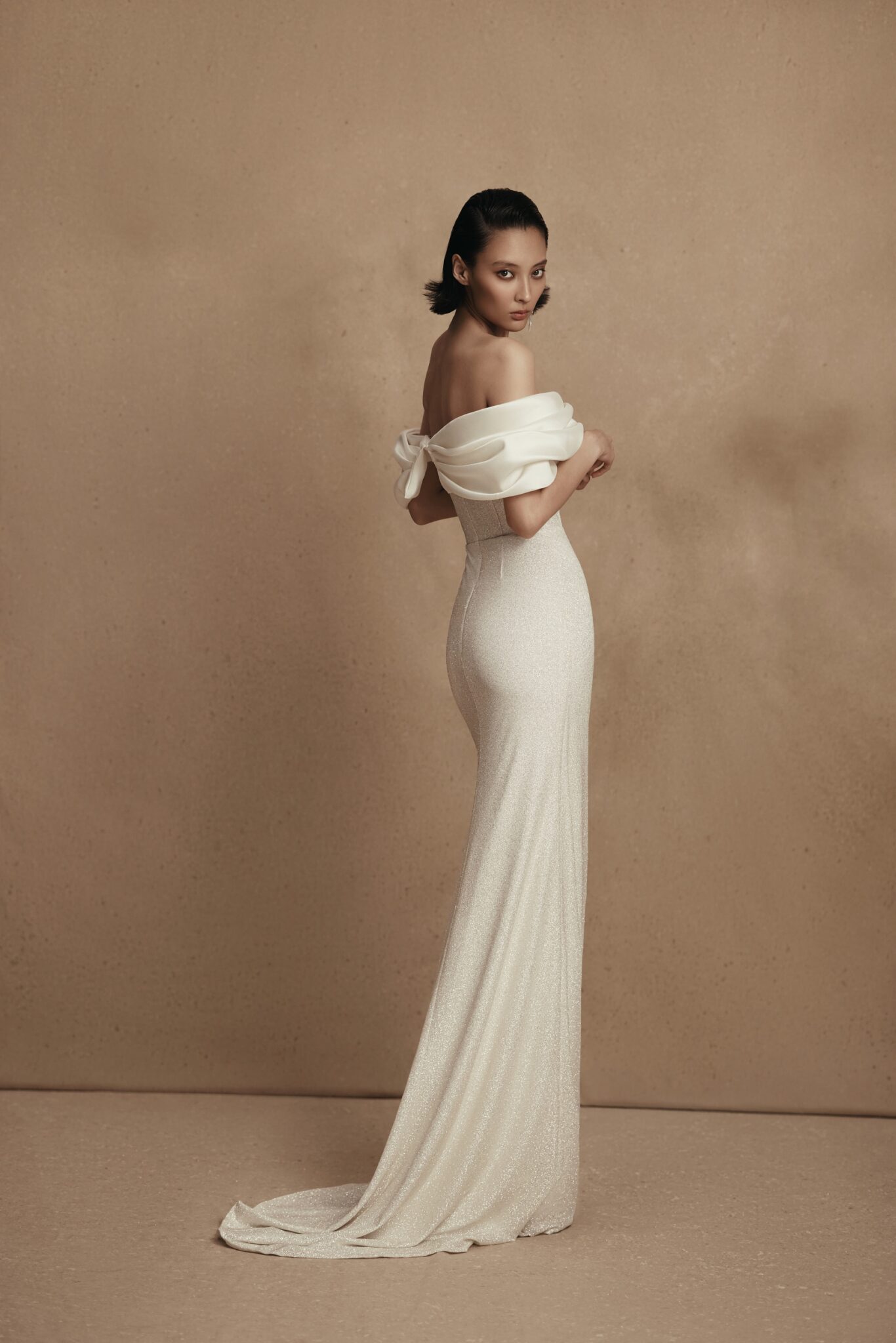 PersonalityA gown is made of mikado and sparkling fabrics. A dress with lowered shoulders is decorated with a wrap on a decollete that runs on the back. Cornelia gown creates a feminine silhouette and highlights the bride’s waistline. The exquisite additional skirt made of mikado fabric is fixed on the waists and has a long train. A sheath dress can be made of soft Mikado silk solely.