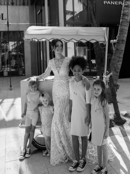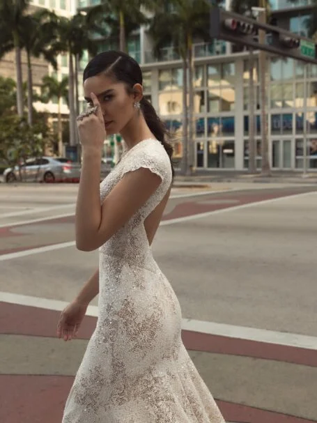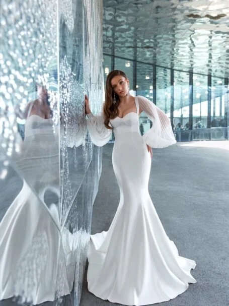 A small sweep train completes the design, making it perfect for brides who want elegance with a fashion-forward twist.