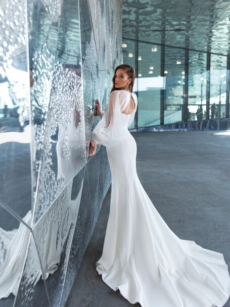 Amore in FioreA truly original design, the Crocus dress features a structured silhouette crafted from rich satin in a soft light ivory shade. The fitted bodice is made of delicate lace, adding a romantic touch to the bold shape. The sleeves fasten with invisible zippers for ease and versatility.