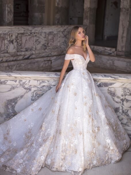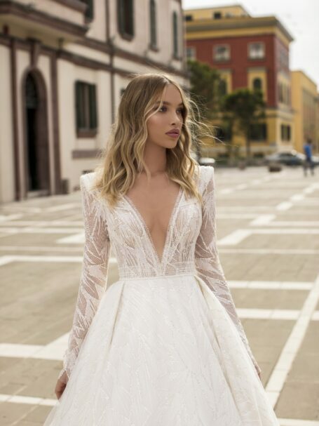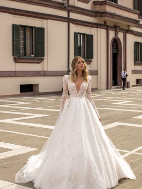 AuroraA-line Crystal bridal gown creates a sophisticated wedding look. V-shaped low neck and unusual shape of sleeves are the main accents of the dress. The upper part of the dress is decorated with big lace flowers and feathers. The skirt and long tail are made of veiling and covered with shining fiber.
