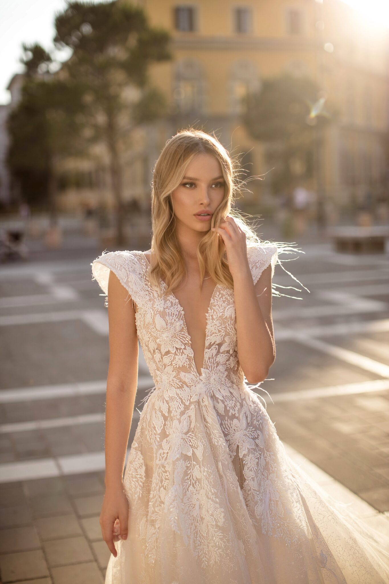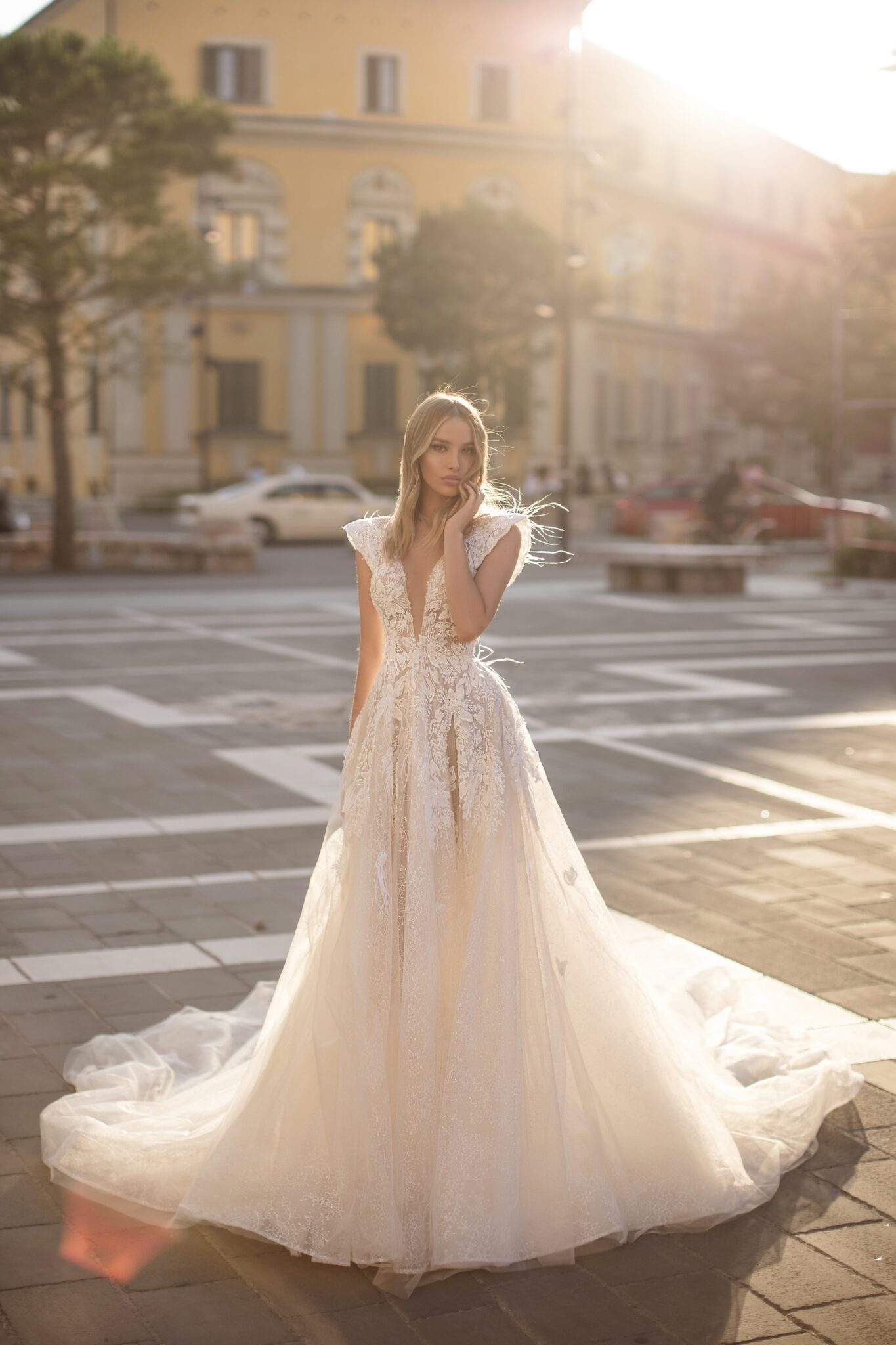 AuroraA-line Crystal bridal gown creates a sophisticated wedding look. V-shaped low neck and unusual shape of sleeves are the main accents of the dress. The upper part of the dress is decorated with big lace flowers and feathers. The skirt and long tail are made of veiling and covered with shining fiber.