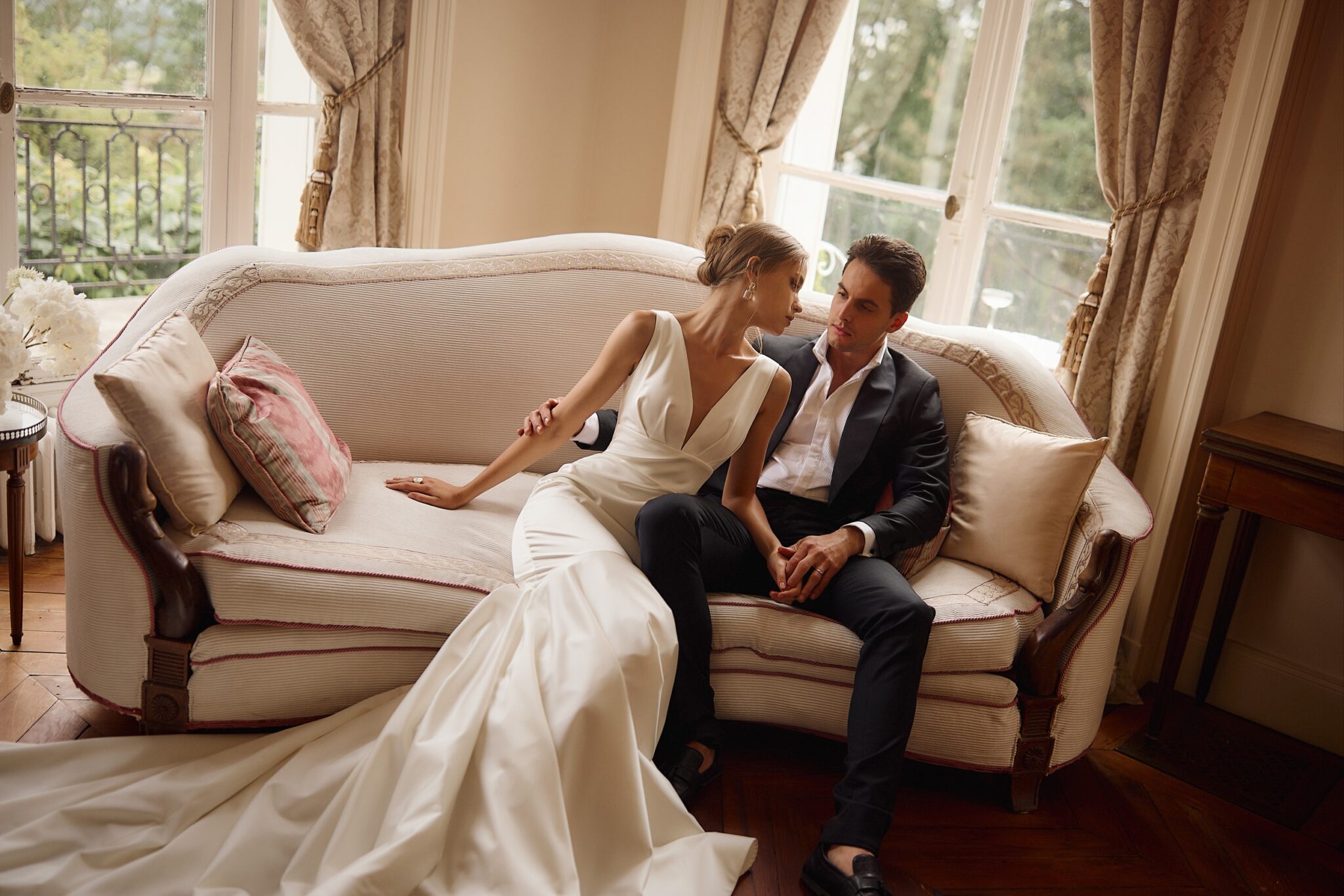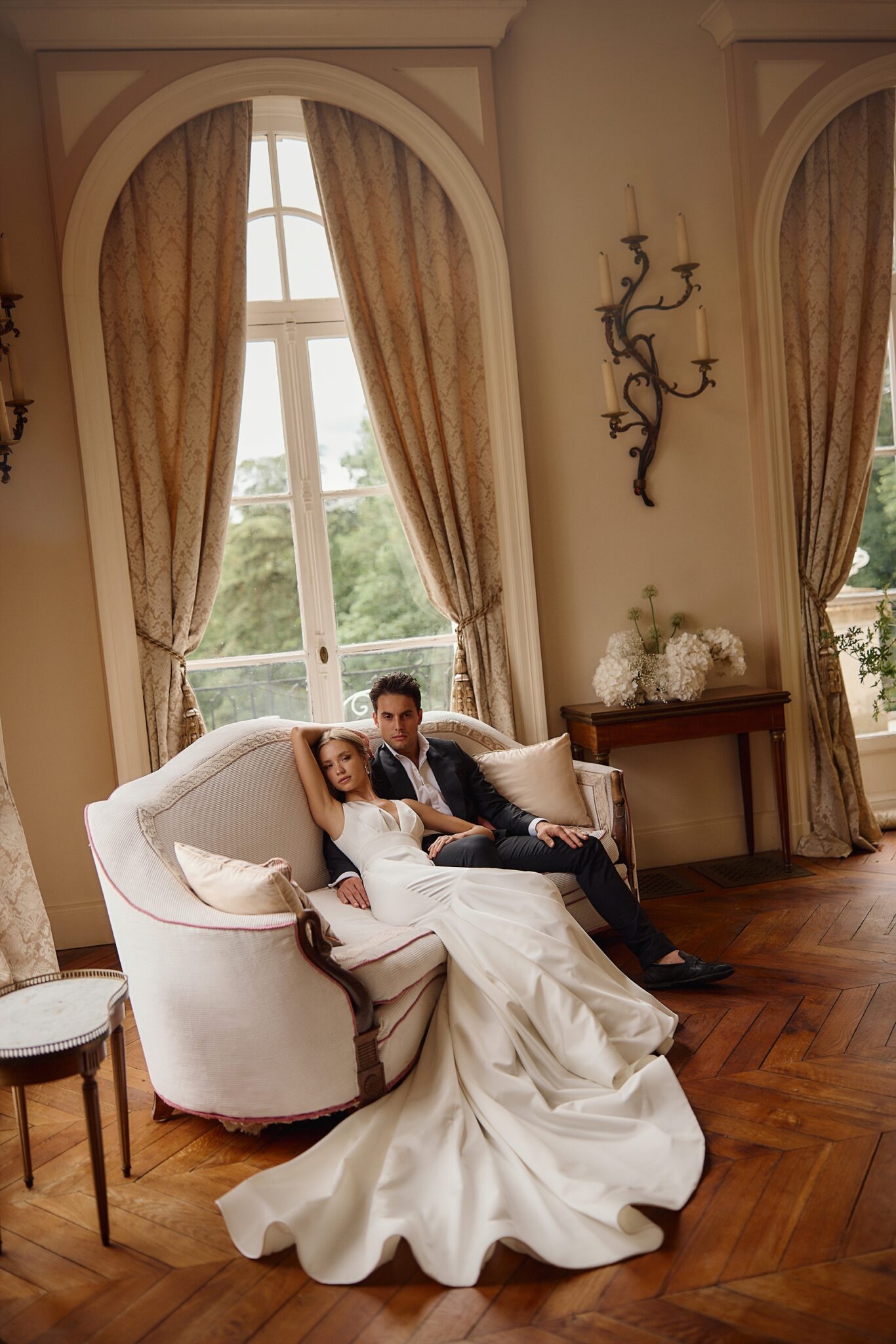 The skirt extends with a significant train shaped into soft waves for a touch of glamour.