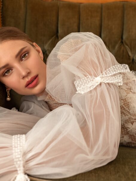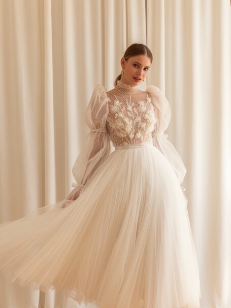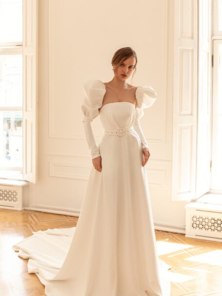 Less is more 2022Damaris is a magnificent and elegant A-line satin wedding gown that creates a royal look. It is made of glossy fabric. The dress with lowered shoulders is embellished with falbala that passes to the back of the dress. Beautiful long sleeves made of floral lace add interesting detail to the bridal look. A fantastic skirt passes into a long train that adds solemnity to the outfit.