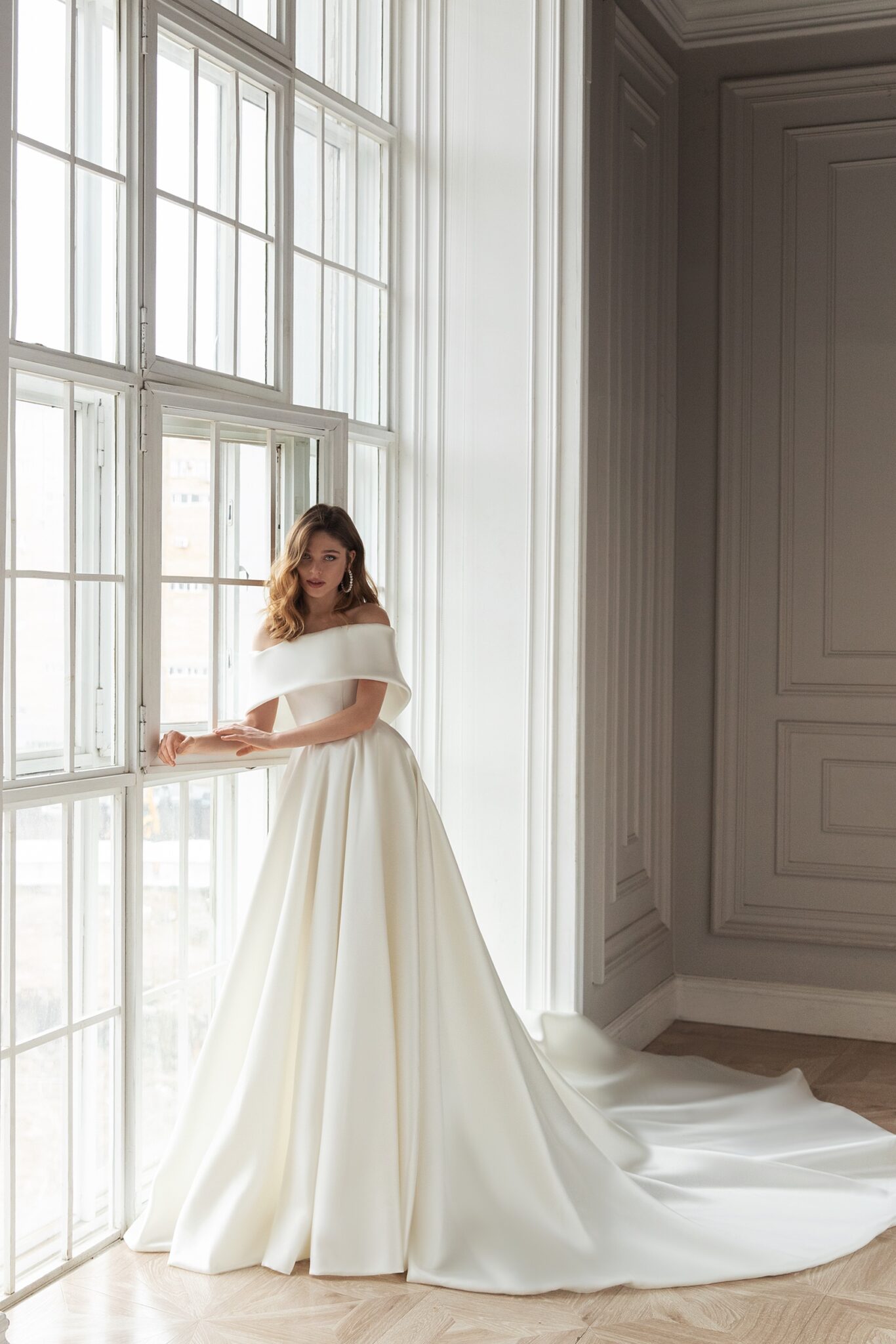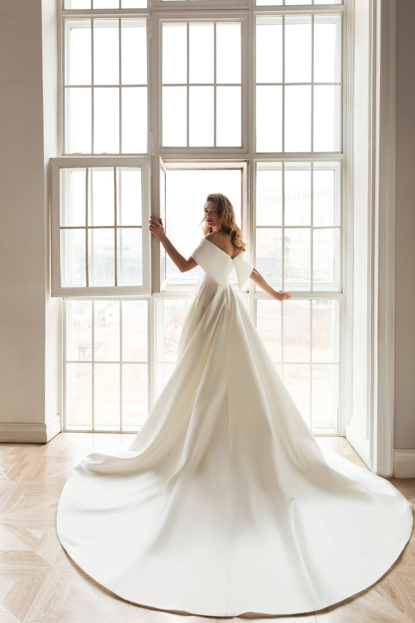 Less is more 2021Dana is a magnificent and elegant A-line satin wedding gown that creates a royal look. It is made of glossy fabric. The dress with lowered shoulders is embellished with falbala that has pointed angles at the back of the dress. A fantastic skirt passes into a long train that adds solemnity to the outfit.