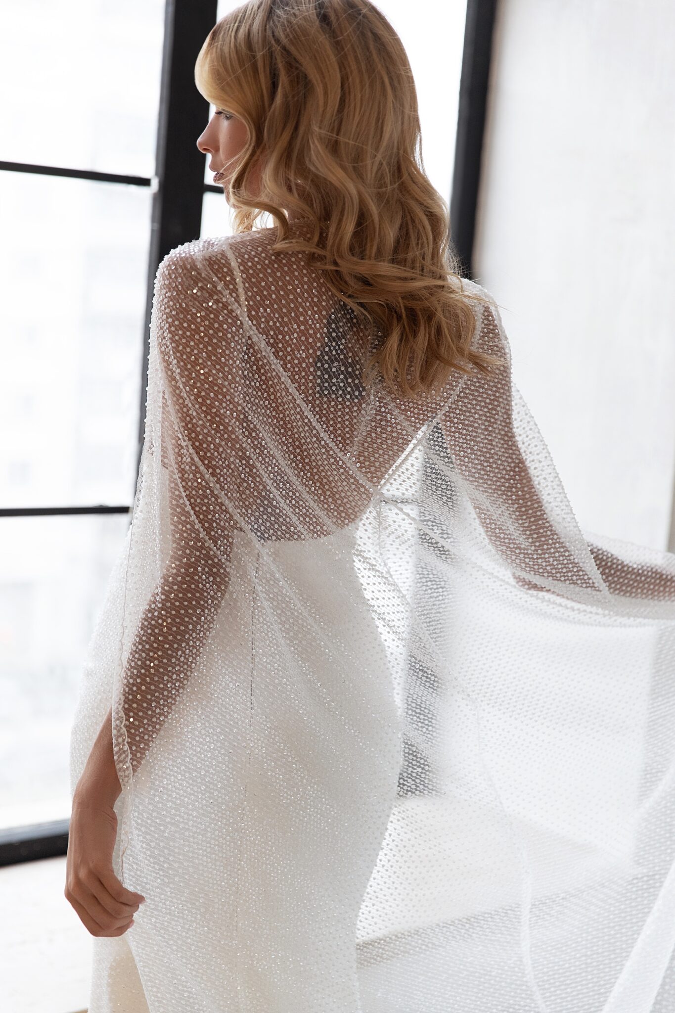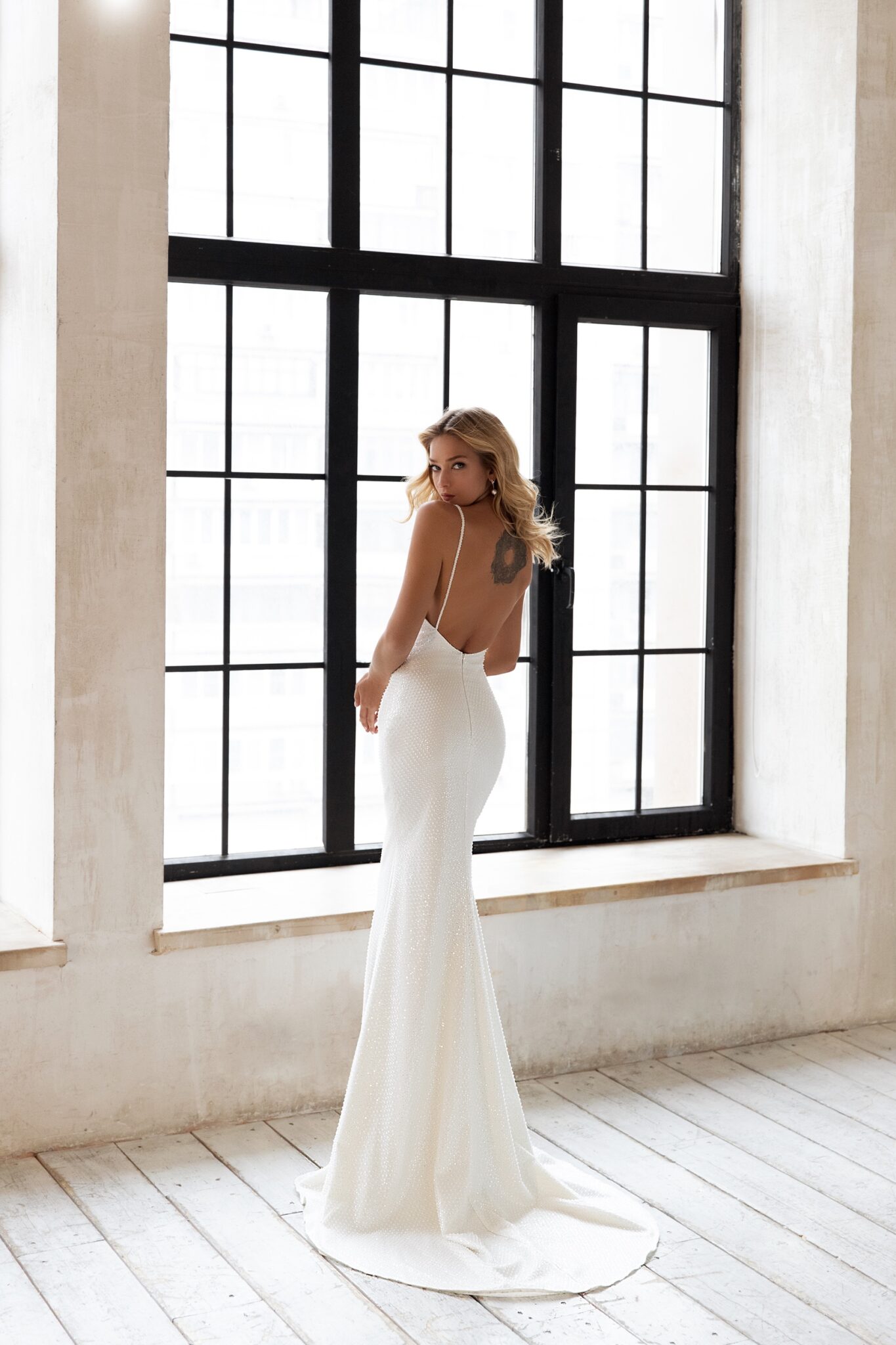 Less is more 2021, Sample SaleA sparkling wedding dress that has a transparent wrap. A sheath dress is embellished with a sweetheart neckline and thin shoulder straps. The wedding gown itself is entirely decorated with shining spangles. It also has an uncovered back. A tender wrap is made of shining transparent fabric and fixed on the neck. There is a short train.