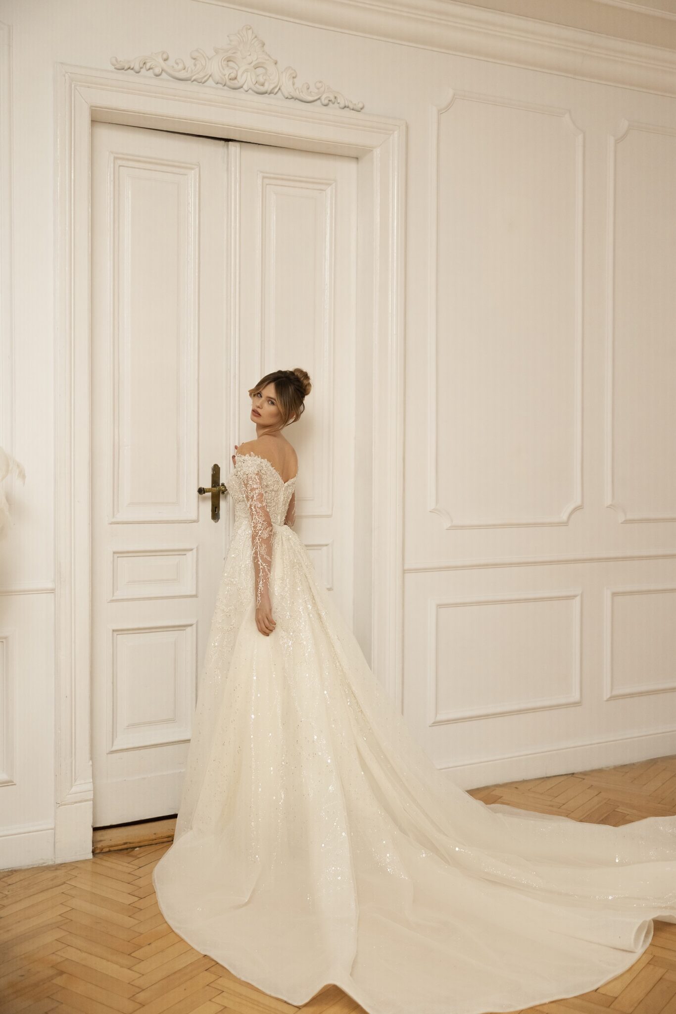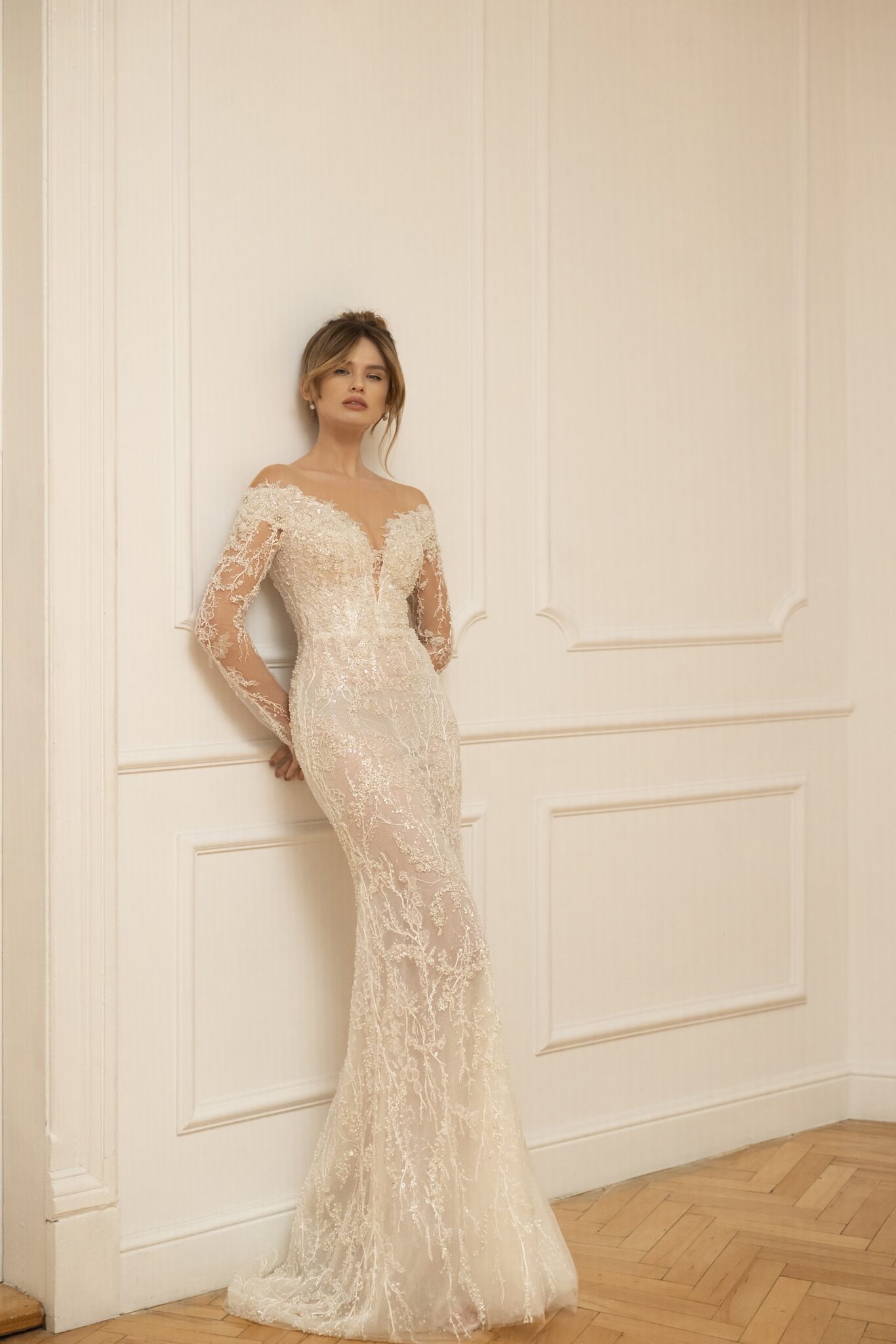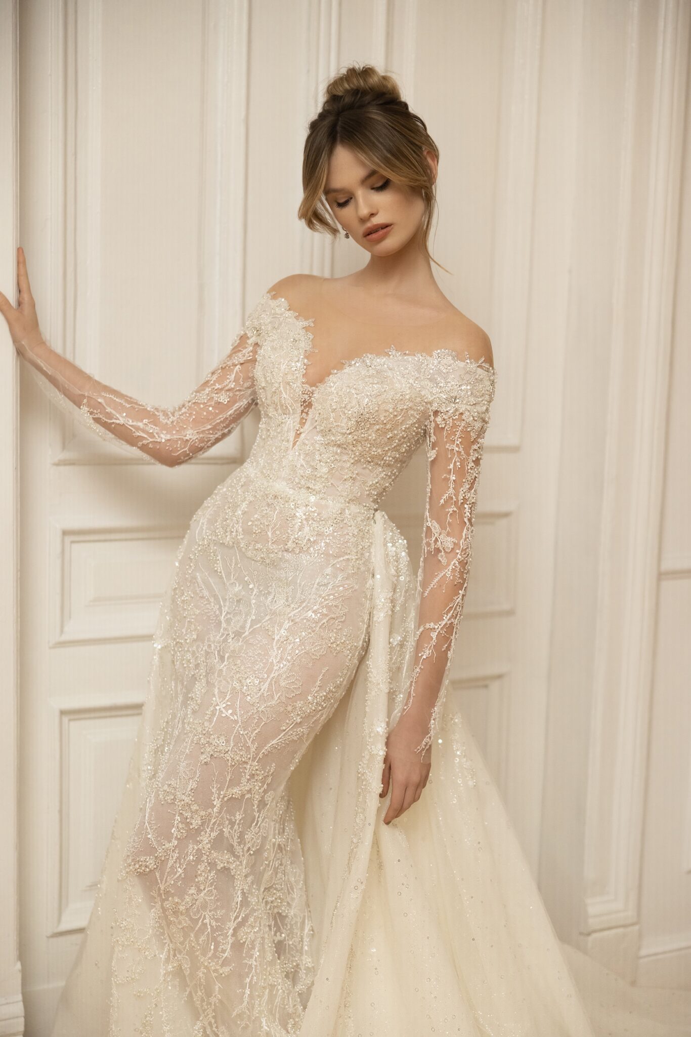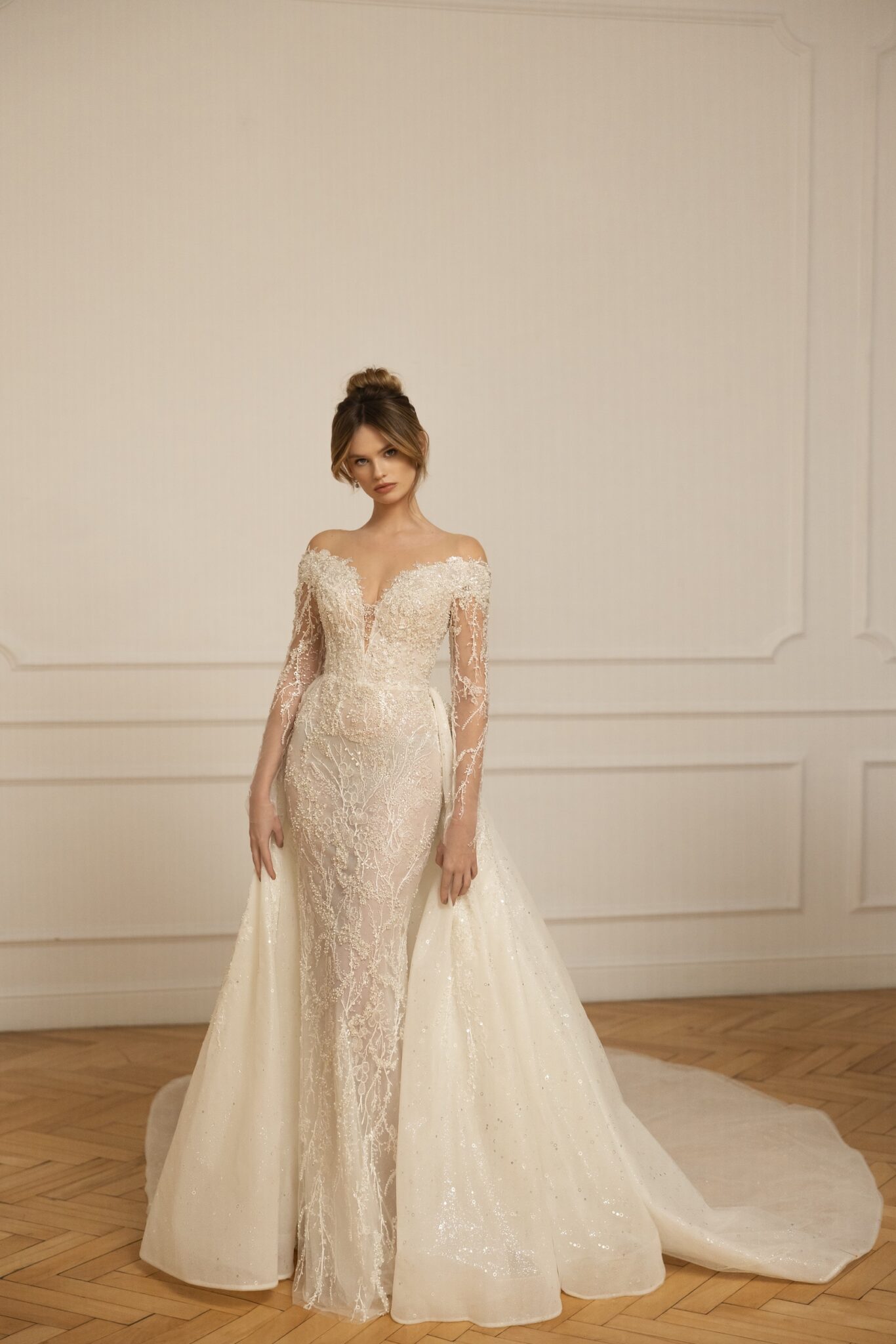 Less is more 2023Soft Tulle and glittery embroidery weave a spectacular wedding gown with statement sparkling overskirt that adds volume and drama for the ceremony. A deep V neckline with off-the-shoulder illusion sleeves is perfectly paired with a sheath skirt enveloped in magnificent beaded Chantilly lace with a chapel train