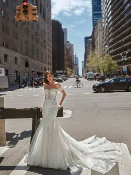 Love in the City, Plus SizeDara is a tender and exquisite gown. The main dress is an A-line one, decorated with embroidered lace, sparkling sequins and patterned Tulle. The dress is accomplished with a detachable bolero made of shinig embroydered lace with collar neckline and long sleeves. The bolero is fastened on the back with a set of small Buttons.