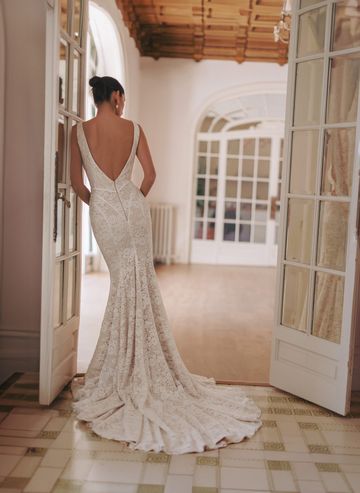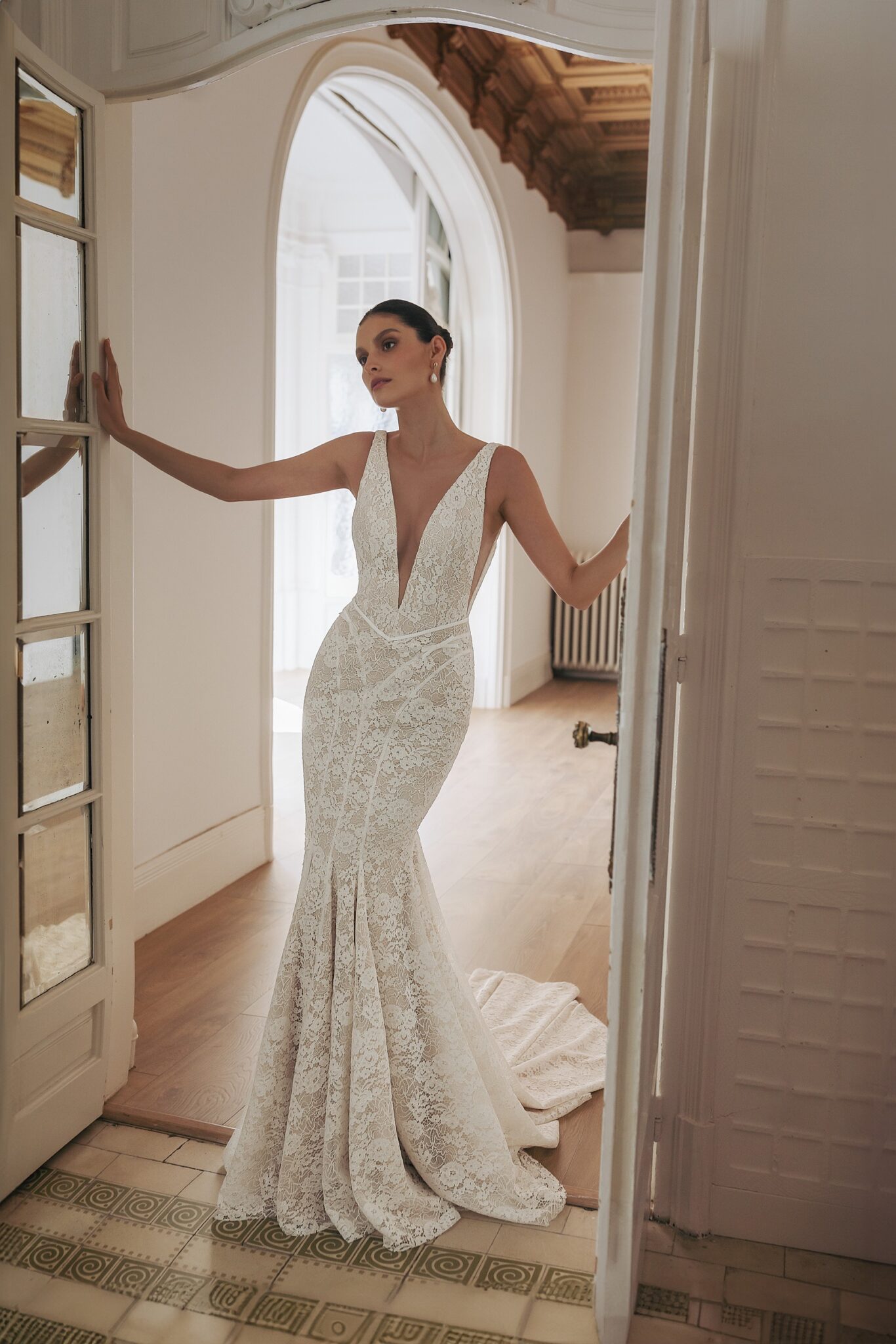 GeminiDemetra — guipure-lace V-neck dress with cutout sidelines and detailed skirt, elongated by a mermaid tail style trail.